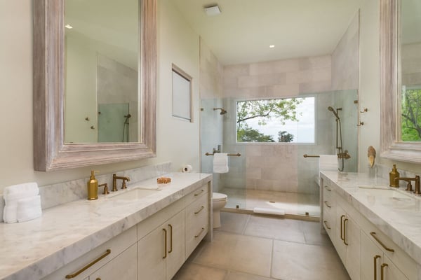 - Spacious glass sh- Unwind in this bright bathroom with double vanities and carved antique mirrors - Spacious glass sh