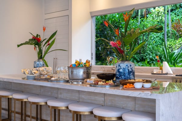- Marble kitchen island - Delight in tropical bites, chilled drinks, and colorful blooms on display - Marble kitchen island