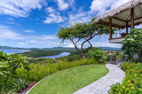 Tropical hillside yard with sweeping views of ocean and jungle.Tropical hillside yard with sweeping views of ocean and jungle.