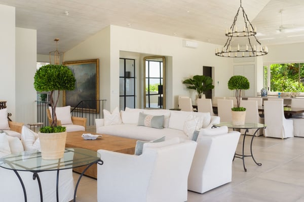 - Relax under airy vau- Elegant sofas and earthy textures pair with greenery and clean modern tones - Relax under airy vau