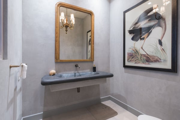 - Artistic touches like the- Textured charcoal basin pairs with warm gold accents and fine lighting - Artistic touches like the