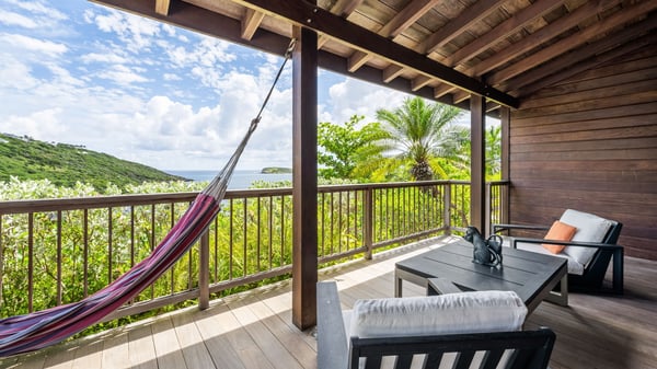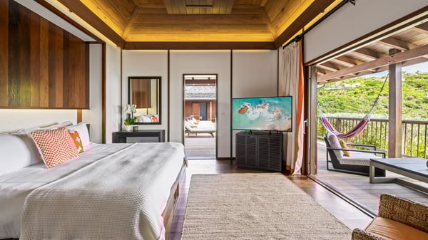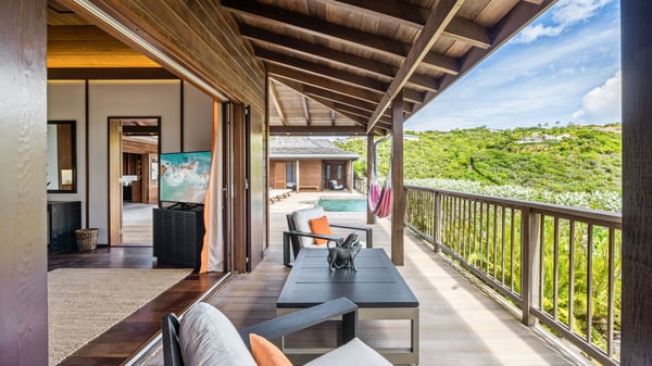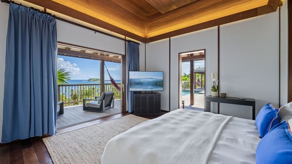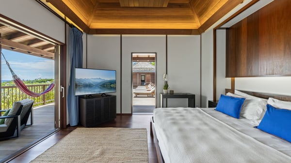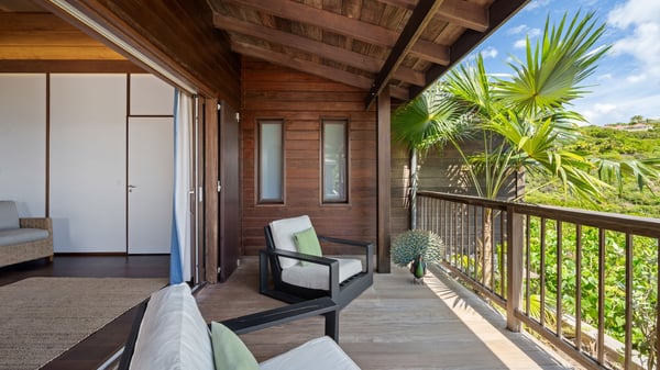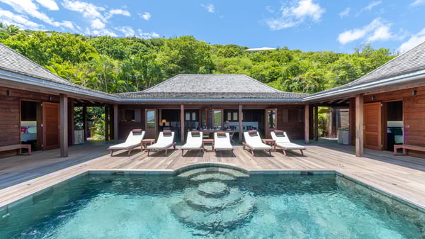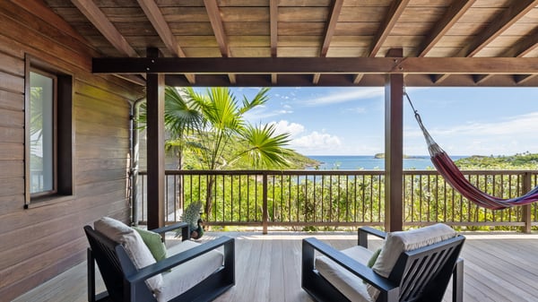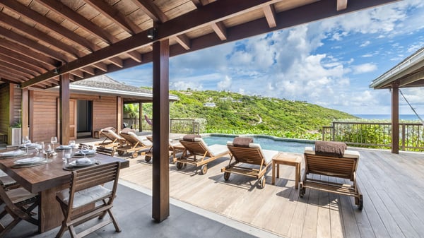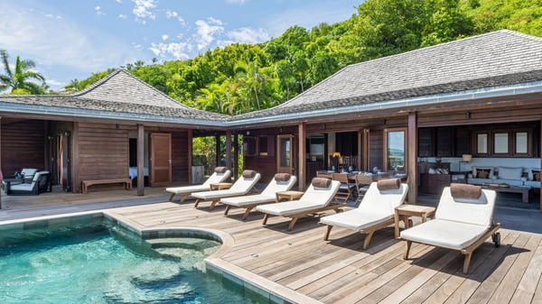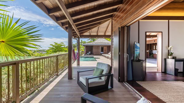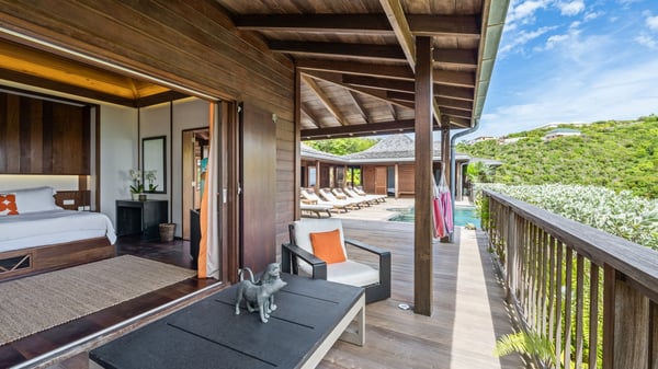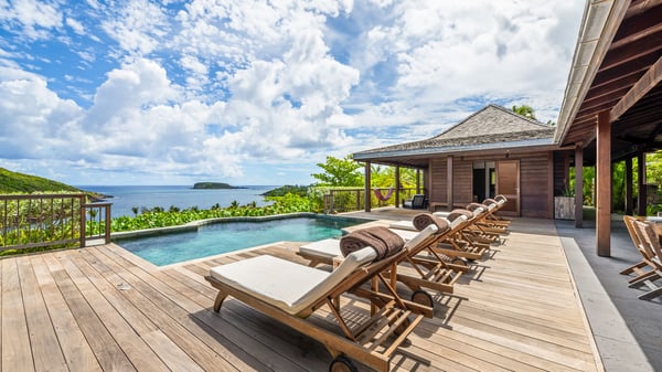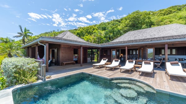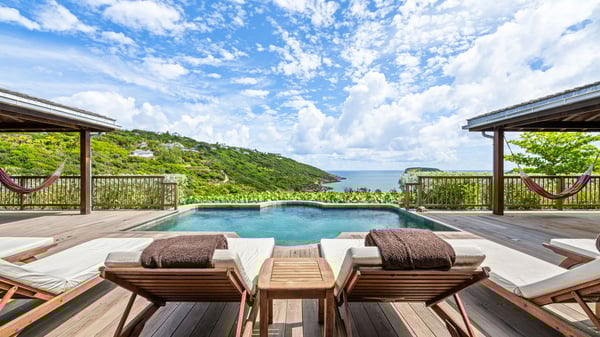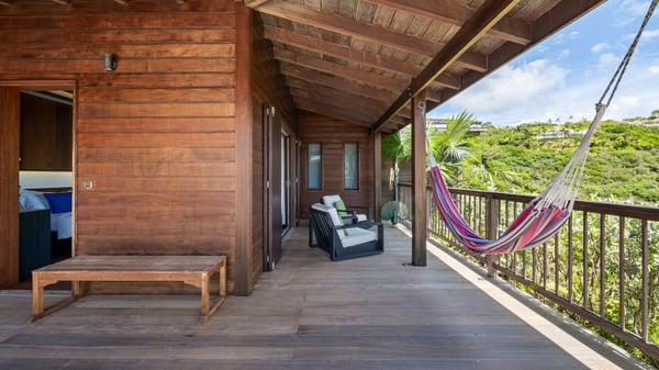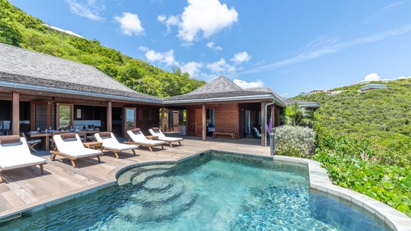 Little Girasol is a luxurious villa in St-Barths ideally located above Marigot Bay. Nestled on the hillside amidst coconut trees, this three-bedroom vacation rental offers high-end amenities in the warm and inviting atmosphere of a Caribbean setting. With a heated swimming pool and lovely terraces with stunning ocean views, Little Girasol welcomes families and groups of friends up to six people for an unforgettable stay in St-Barts. Spread across three bungalows, villa Little Girasol was built with an authentic and elegant design, entirely crafted from wood, with caramel-coloured tones walls, furniture, and beautiful ceilings. The air-conditioned living area features a comfortable lounge facing the breathtaking ocean view with a comfy sofa and armchairs, a large HD screen, and a dining room which can accommodate up to eight guests beneath the outstanding vaulted ceiling with exposed beams. Close to it, the fully-equipped kitchen beautifully mixes stainless steel and wood in a warm, refined ambiance. With panoramic views over Marigot Bay and the lush vegetation, Little Girasol is the perfect spot for delightful daydreaming sessions in a unique atmosphere designed for relaxation. At the front, the villa’s terrace features a beautiful heated swimming pool with semi-circular steps sparkling under the sun. On the wooden deck, you’ll enjoy pleasant sunbathing or reading sessions, comfortably lounging on the cushioned sunbeds, facing the perfect horizon. Under the covered part of the terrace, you’ll find the al fresco where you’ll enjoy delicious meals cooked on the barbecue in the gentle trade winds. Like a paradise scenery, Little Girasol's terrace offers many private and serene spaces for unique moments in the lovely environment of St-Barths. Little Girasol consists of three air-conditioned bedrooms with en-suite bathrooms. Located in separate bungalows, each bedroom opens onto a private terrace equipped with hammocks and armchairs, providing stunning ocean views. These luxurious bedrooms are furnished with king-size beds, wardrobes and televisions, with soft backlighting that offers a delightful, warm touch to the cozy decor. Overlooking Marigot Bay, Little Girasol is a peaceful haven nestled in the heart of the coconut groves of St-Barts, opening onto a breathtaking view over the sparkling, deep-blue ocean.