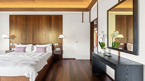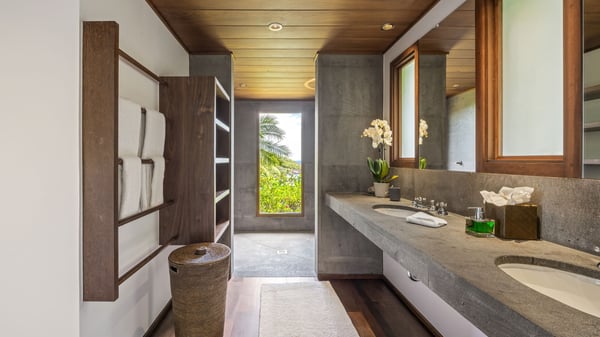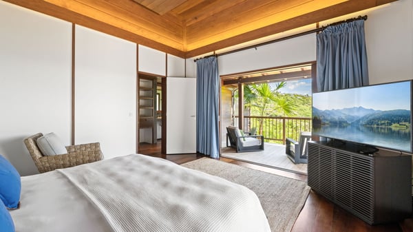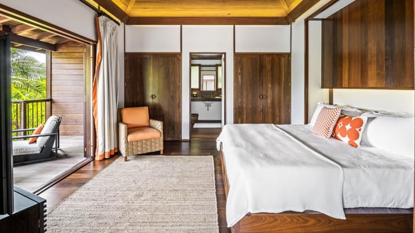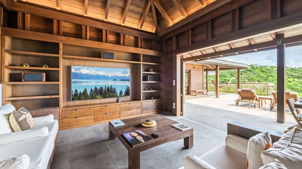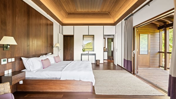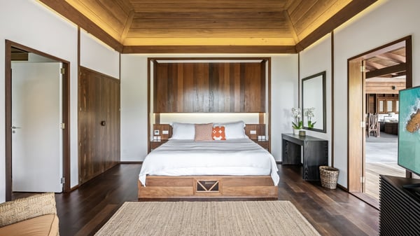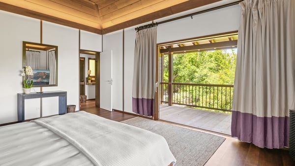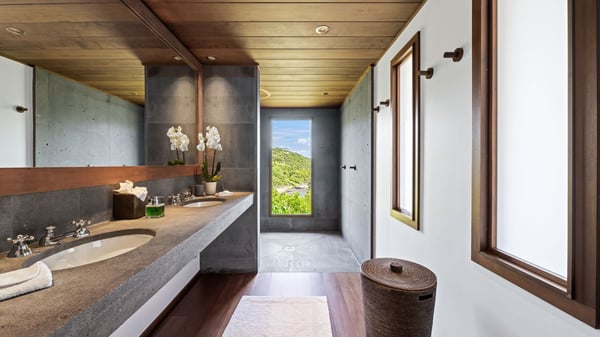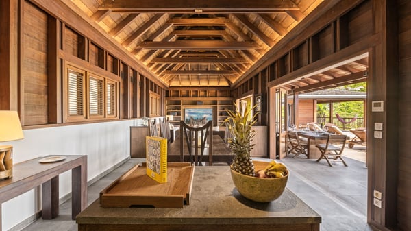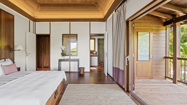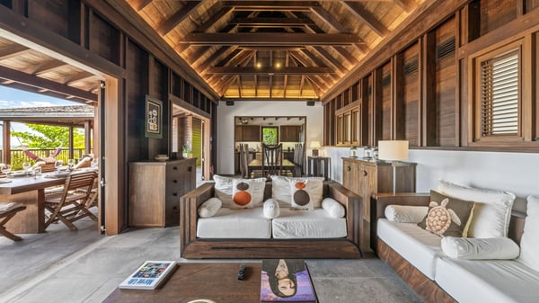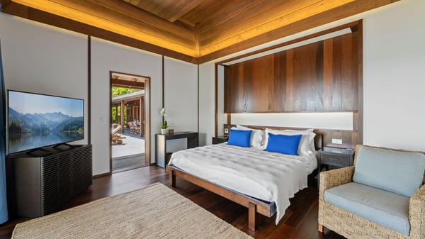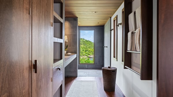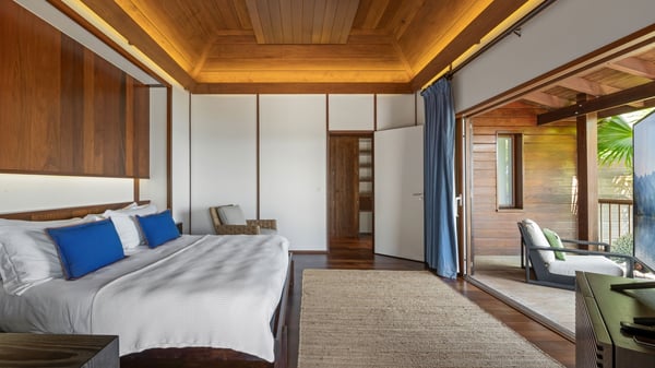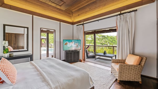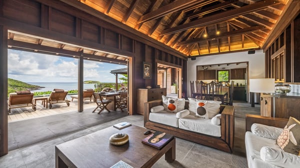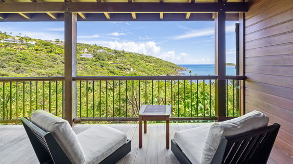 Little Girasol is a luxurious villa in St-Barths ideally located above Marigot Bay. Nestled on the hillside amidst coconut trees, this three-bedroom vacation rental offers high-end amenities in the warm and inviting atmosphere of a Caribbean setting. With a heated swimming pool and lovely terraces with stunning ocean views, Little Girasol welcomes families and groups of friends up to six people for an unforgettable stay in St-Barts. Spread across three bungalows, villa Little Girasol was built with an authentic and elegant design, entirely crafted from wood, with caramel-coloured tones walls, furniture, and beautiful ceilings. The air-conditioned living area features a comfortable lounge facing the breathtaking ocean view with a comfy sofa and armchairs, a large HD screen, and a dining room which can accommodate up to eight guests beneath the outstanding vaulted ceiling with exposed beams. Close to it, the fully-equipped kitchen beautifully mixes stainless steel and wood in a warm, refined ambiance. With panoramic views over Marigot Bay and the lush vegetation, Little Girasol is the perfect spot for delightful daydreaming sessions in a unique atmosphere designed for relaxation. At the front, the villa’s terrace features a beautiful heated swimming pool with semi-circular steps sparkling under the sun. On the wooden deck, you’ll enjoy pleasant sunbathing or reading sessions, comfortably lounging on the cushioned sunbeds, facing the perfect horizon. Under the covered part of the terrace, you’ll find the al fresco where you’ll enjoy delicious meals cooked on the barbecue in the gentle trade winds. Like a paradise scenery, Little Girasol's terrace offers many private and serene spaces for unique moments in the lovely environment of St-Barths. Little Girasol consists of three air-conditioned bedrooms with en-suite bathrooms. Located in separate bungalows, each bedroom opens onto a private terrace equipped with hammocks and armchairs, providing stunning ocean views. These luxurious bedrooms are furnished with king-size beds, wardrobes and televisions, with soft backlighting that offers a delightful, warm touch to the cozy decor. Overlooking Marigot Bay, Little Girasol is a peaceful haven nestled in the heart of the coconut groves of St-Barts, opening onto a breathtaking view over the sparkling, deep-blue ocean.