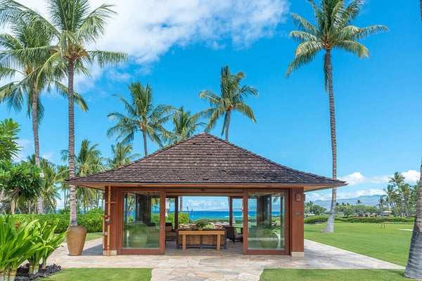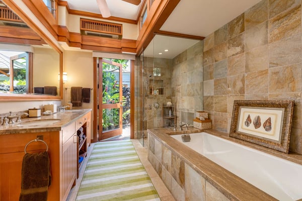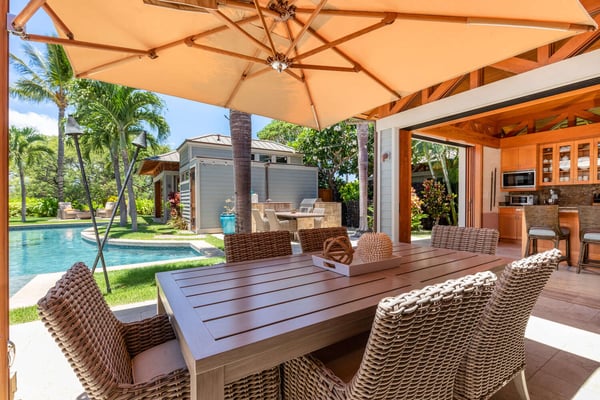 Guests of Na Hale 7 can enjoy access to Francis H I'i Brown Golf Course, Mauna Lani Racquet Club, Mauna Lani Spa, Mauna Lani Beach Club, local restaurants and shopping. Decorated with mature palms and lush greenery, Na Hale 7 celebrates modern Hawaiian living at its finest. Upscale touches throughout, coupled with a casual ambiance make this Balinese-style home an ideal vacation getaway. Separate pods featuring three suites and a great room, connected by outdoor spaces, act like a courtyard around a beautiful swimming pool, hot tub, and built-in BBQ. Pool heat is available for an additional charge paid at the time of booking - please inquire for details. Inside, find warm wood tones and natural stone features around well-appointed furnishings. Highlights of the property include a gourmet, subzero Wolf kitchen, three private outdoor showers with each suite, a two-car garage, and a four-seater GEM car for getting around the gorgeous Mauna Lani resort community. Hawaii TAT: 211-342-1824-01 // STVR-19-375533