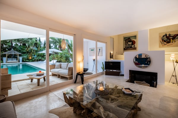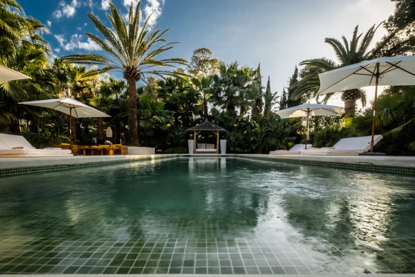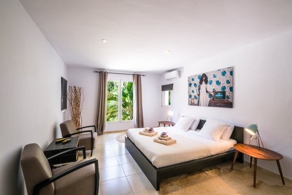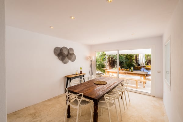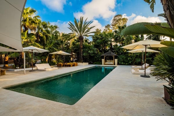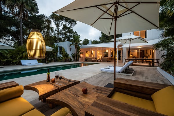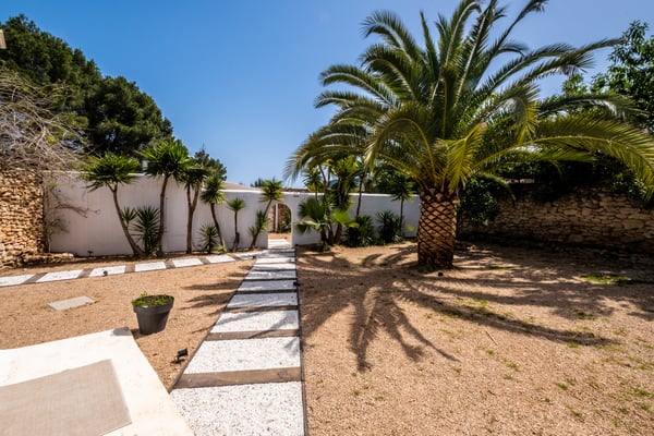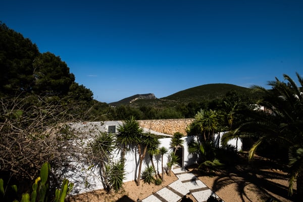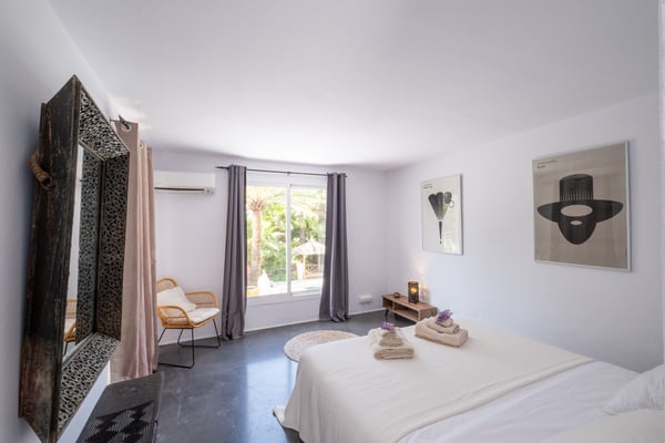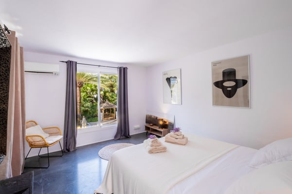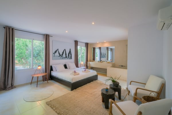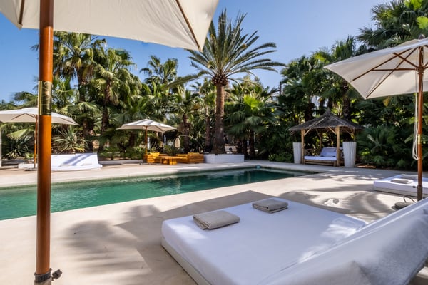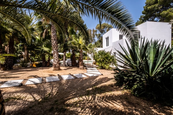 Villa Stephanie is situated a short distance from Ibiza’s east coast, between the wide, horseshoe of sand that is Cala Llonga beach and the rocky coves and links of Ibiza’s only golf course at Roca Llisa. The villa is located in a gated community with 24-hour security and enjoys 3,000m2 of private grounds. From the private parking area, a pretty wisteria-clad doorway leads to the stunning private gardens, which feature tall scented pines, spiky architectural tropical planting, and leafy palms. The garden’s centrepiece is the 17m long pool. Its pristine white deck and long, narrow lines add an art deco glamour to Villa Stephanie’s fantastic outside entertaining spaces. Luxurious Balinese double loungers line the poolside and sail-like gazebos provide shady respite from the warm, Ibizan sunshine. Take your pick of the myriad of places to relax amongst the gardens – from the palm-shaded lounge seating at the far end of the pool to the rustic daybed hidden amongst the trees. Close to the house, a shaded chillout area provides a sophisticated poolside chill-out space and there’s also a shaded dining area with barbeque. Inside, the cool white Ibizan chic continues through the spacious living areas. A large lounge with twin sofas, and a further mezzanine chill-out area boasts huge sliding glass doors to the sunny poolside. The kitchen area is hidden behind a large bar area at one end of the room, to make for a sociable cooking and entertaining space. Three of the double bedrooms are spacious primary suites with beautiful garden views and en-suite shower rooms. One has an additional jacuzzi bathtub. The fourth bedroom is another double with en-suite shower room. Meanwhile, a fifth double bedroom has a private entrance as well as a private terrace with a day bed which accesses directly onto the gardens. This is an ideal guest annex and features a smart en-suite shower room. License Number: 2013021139