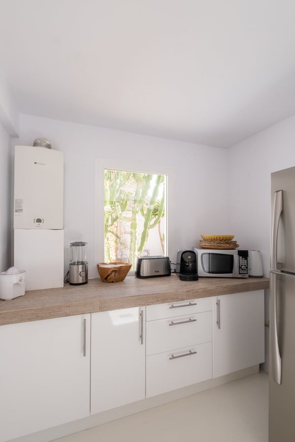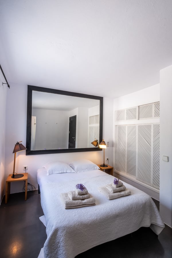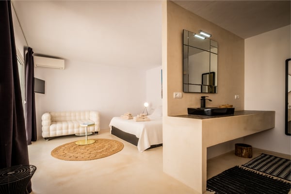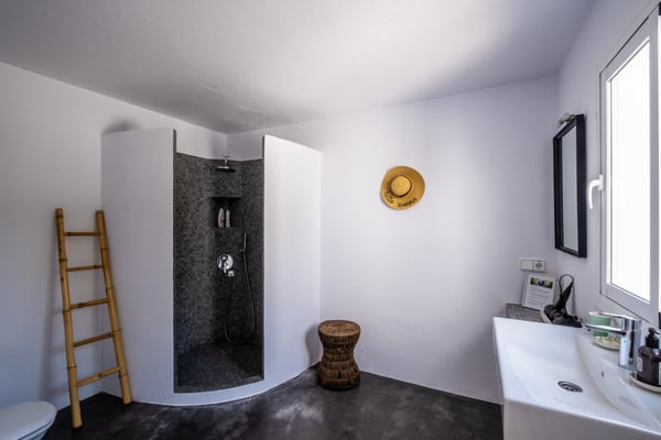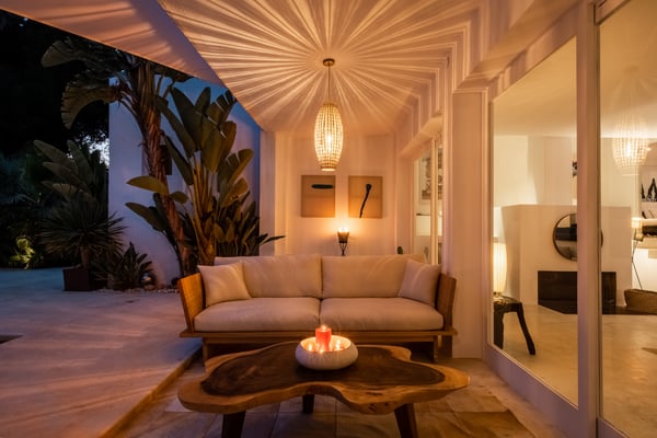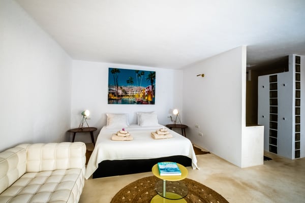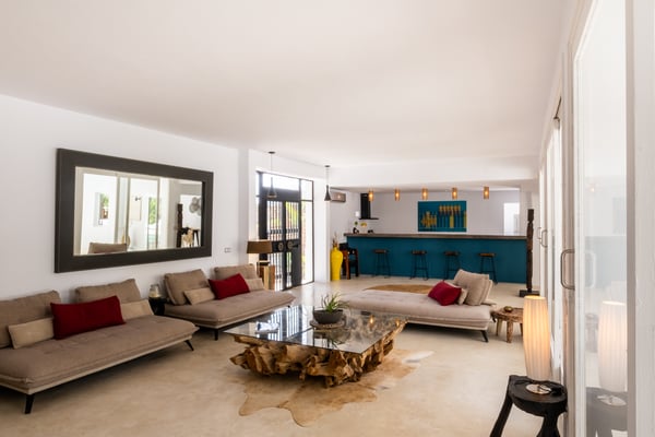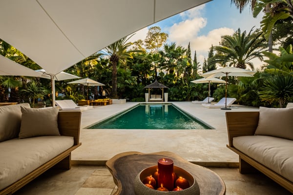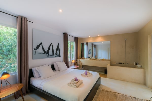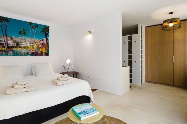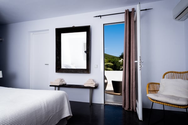 Villa Stephanie is situated a short distance from Ibiza’s east coast, between the wide, horseshoe of sand that is Cala Llonga beach and the rocky coves and links of Ibiza’s only golf course at Roca Llisa. The villa is located in a gated community with 24-hour security and enjoys 3,000m2 of private grounds. From the private parking area, a pretty wisteria-clad doorway leads to the stunning private gardens, which feature tall scented pines, spiky architectural tropical planting, and leafy palms. The garden’s centrepiece is the 17m long pool. Its pristine white deck and long, narrow lines add an art deco glamour to Villa Stephanie’s fantastic outside entertaining spaces. Luxurious Balinese double loungers line the poolside and sail-like gazebos provide shady respite from the warm, Ibizan sunshine. Take your pick of the myriad of places to relax amongst the gardens – from the palm-shaded lounge seating at the far end of the pool to the rustic daybed hidden amongst the trees. Close to the house, a shaded chillout area provides a sophisticated poolside chill-out space and there’s also a shaded dining area with barbeque. Inside, the cool white Ibizan chic continues through the spacious living areas. A large lounge with twin sofas, and a further mezzanine chill-out area boasts huge sliding glass doors to the sunny poolside. The kitchen area is hidden behind a large bar area at one end of the room, to make for a sociable cooking and entertaining space. Three of the double bedrooms are spacious primary suites with beautiful garden views and en-suite shower rooms. One has an additional jacuzzi bathtub. The fourth bedroom is another double with en-suite shower room. Meanwhile, a fifth double bedroom has a private entrance as well as a private terrace with a day bed which accesses directly onto the gardens. This is an ideal guest annex and features a smart en-suite shower room. License Number: 2013021139