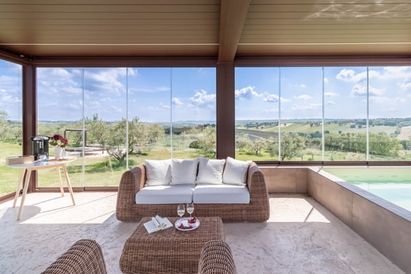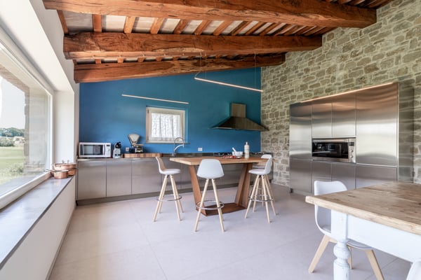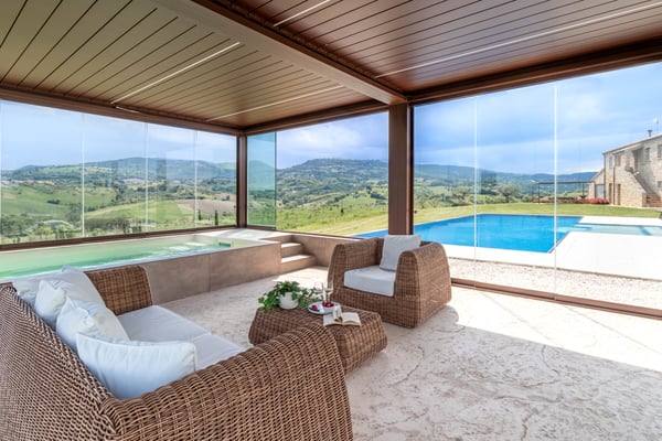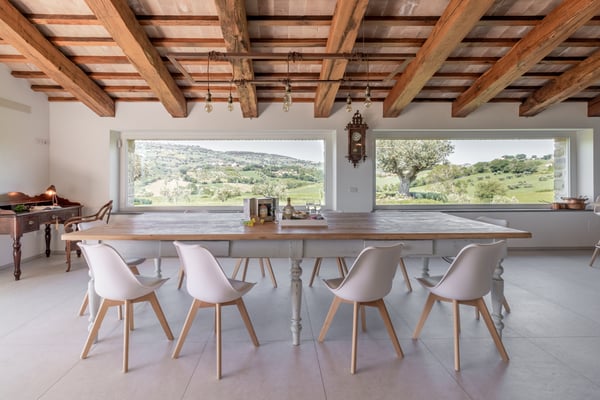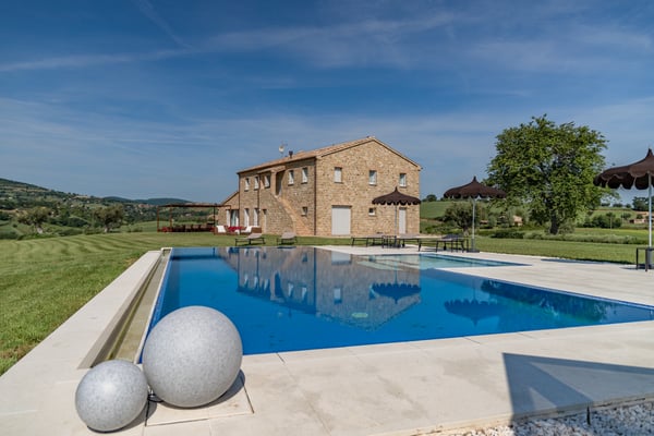 Villa ‘Casale Mignola’ has an unbelievable view in front of Cingoli with its sweet hills that change color each week. Nature surrounds the villa in the most absolute privacy with its almost 8 hectares of land where the olive grove is the master with 1200 plants of ‘mignola’ and 1000 planted with a satellite position generated from Fibonacci’s formula. Casale Mignola includes two parts, the main farmhouse and the pool home. The farmhouse has been completely rebuilt respecting the old standard of a typical Marche’s farmhouse. Casale Mignola is a fabulous, fully restored farmhouse, located at the top of hill in Cingoli, at the heart of the historic ‘Le Marche’ region. Cingoli is one of the oldest villages in Italy. A few kilometers from this old medieval village defined ‘the balcony of the Marche’, the old Farmhouse was restored into this luxurious villa. The villa is surrounded with luscious landscapes and vineyards. The Villa consists of 2 floors. Both the upper floor where the bedrooms are located, and on the ground floor the living space have spectacular views that the guests can enjoy day and night. Living in a noise-free farmhouse is a must, the farmhouse is located on a property of approximately 8 hectares. The sound of silence will accompany your reading of a book rather than your favorite song or simply your relaxation. Have you ever looked at the stars? Zero light pollution will allow you to appreciate an incredible starry sky in the evening, just turn off the external lighting of the farmhouse to find yourself in front of a breathtaking starry sky to share with your loved ones. A hydromassage with heated water in front of a unique landscape, during the day, or in the evening in total tranquillity and intimacy. Walking barefoot during the day in complete relaxation on a green lawn in front of the house rather than living an infinity pool with a small beach in front of a breathtaking landscape will complete these magical moments that only at the house you can live. A list of opportunities 'created by the property' and by those who run the house to live some of the countries in which time seems to have stopped, visits to wineries that will accompany you in the vineyards and thanks to which you can experience unforgettable tastings. An incredible sea with the towns of Portonovo, Sirolo, Numana and the beach of “Le due sorelle” 50 minutes by car rather than the experience of the caves of Frasassi. A living area that is a riot of bright interpenetration between interior and exterior with very large openings overlooking the landscape, almost as if the exteriors entered the house. A billiard room for moments of relaxation goliardic and a set of furniture ranging from antique furniture to modern design make the farmhouse open on the landscape of the Le Marche-Cingoli, a jewel of recovery. On the ground floor you will find a 50 square meters kitchen realized for the farmhouse in stainless steel 304 Italian design by “Ideal Cucine” equipped with Ariston professional appliances, an Ariston combo refrigerator freezer 2mt high, two Barbecue Hot point Ariston, a dishwasher and an Ariston cooking base. In the dining area you will find an ancient sartorial table, of 3.5mt length, coming from the North West area of Italy can accommodate 14 people. In front of the kitchen, a piece of design produced from the company “Elite To Be” can be used to cook or have breakfast in front of a faveolus view of the surrounding hills. On the centre of the stone wall recovered from the old house a suspending fireplace produced from Focus, you will find a piece of design whose design dates back to the 60s invented from Mr. Dominique Imbert and present to the Guggenheim museum in New York City. The sleeping area has four symmetrical double bedrooms that focus on the whiteness of the interior with some touches of colour related to the presence inside each of the bathrooms of resins of different shades of colour. The bedrooms will be an unforgettable experience, sleeping on 100-year-old bed , each bed is equipped with a special topper for the best sleeping and relaxing experience. Each bathroom is equipped with linen, towels, towel for shower , during winter and spring the bathroom is equipped with a bathrobe too to use in the heated pool outside the farmhouse. The property is completed in terms of hospitality, with an outbuilding, “dependence”, that takes advantage of the same renovation fees in which another couple can be accommodated. In order to make the house usable even on spring and autumn days a bioclimatic pergola with a heated pool equipped inside with hydromassage allow you to admire the surrounding landscape in an intimate and welcoming environment. This is Casale Mignola, a property of 8 hectares from which you can admire a wonderful breathtaking view, a charming farmhouse revisited with timeless finesse and design touches whose brightness', measure, balance and elegance will make you remain amaze. CIN: IT043012C2NS4YL5JV