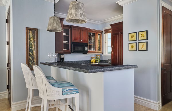 This beautiful one-bedroom, single-story villa averages 1,250 square feet on a single floor. The master bedroom features a full en suite marble bathroom, as well as French sliding glass doors that lead to a terrace or balcony. This plush villa also features a spacious living room with access to the terrace, a fully appointed gourmet kitchen with granite counter tops, and dining room. Natural stone flooring, solid granite counter tops, and custom-designed furnishings add a touch of elegance while stunning views of the ocean or gardens let you enjoy our tropical paradise at your leisure.
