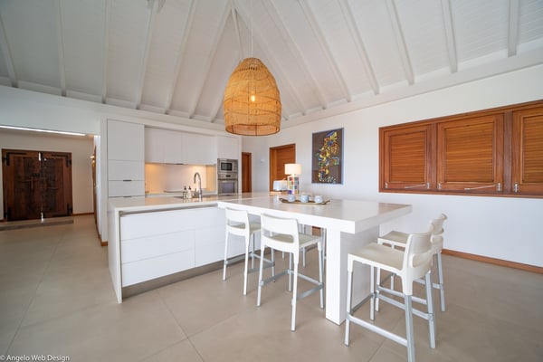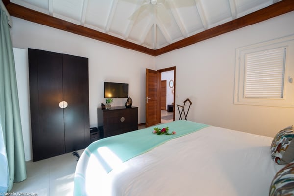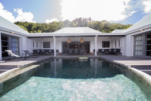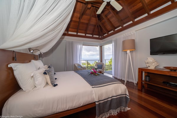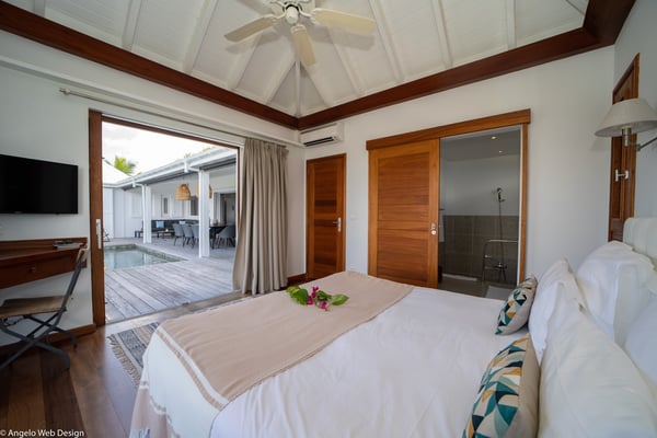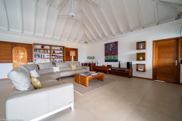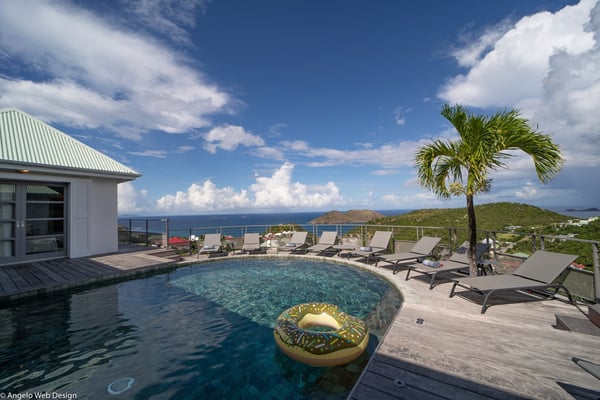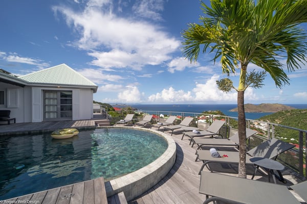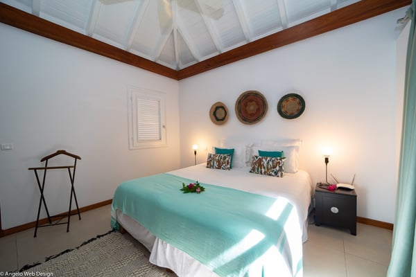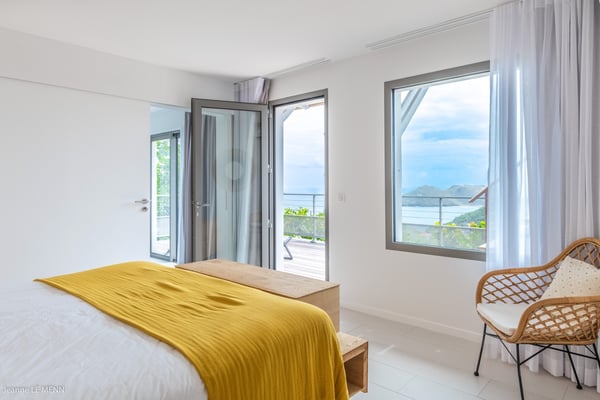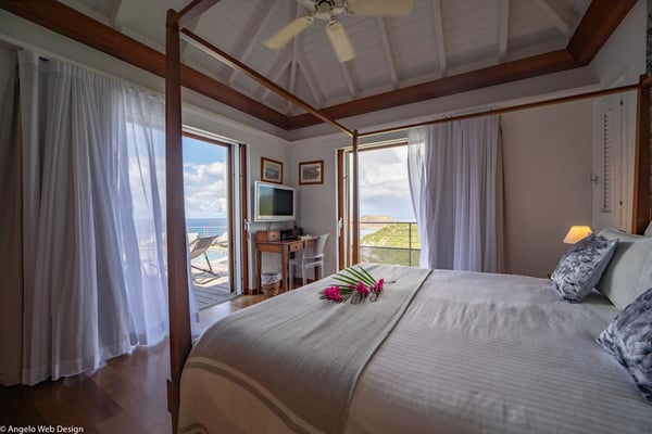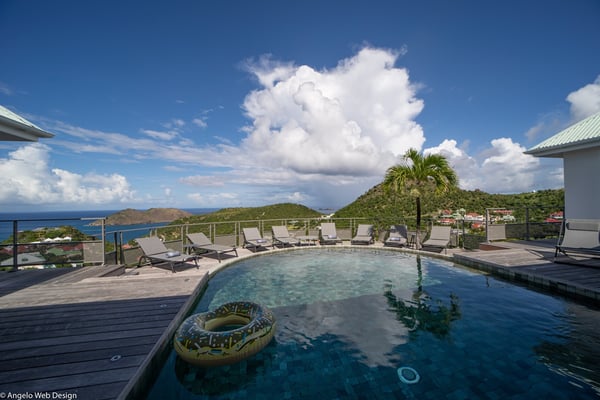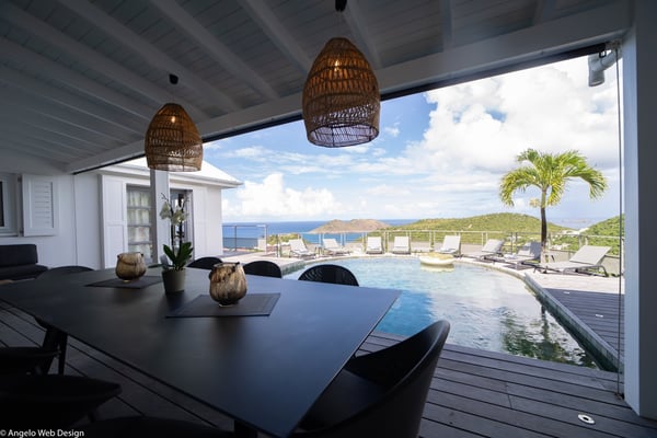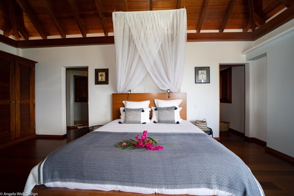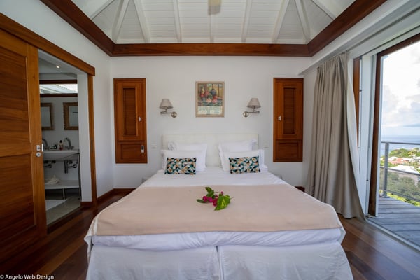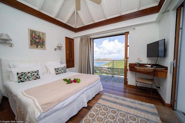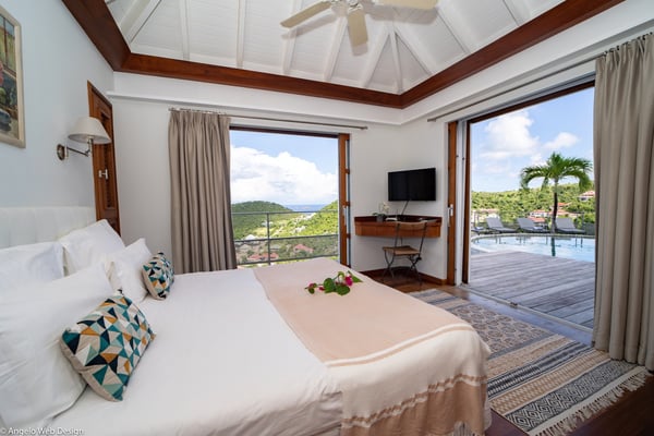 Located on the heights of Flamands, the rental Villa Ocean's 5 is a stunning property that opens onto a magnificent view over the ocean and the surrounding hills. In a lush tropical setting near the beautiful Flamands beach, this luxurious five-bedroom air-conditioned vacation home is ideal for a large family or for a group of friends vacationing together in St. Barths. Built-in a local style on two levels, Villa Ocean's 5 was recently renovated and expanded to offer high-end amenities. In the modern and bright decor with colourful bohemian style hints, you’ll marvel at the spectacular views over the bay and the neighbouring island of Bonhomme. The living room featuring a spacious curved sofa covered with cushions opens onto the well-equipped kitchen with a lovely modern white table. Openings onto the ocean-view terrace create a delightful atmosphere in this open and very airy space. Under the high vaulted ceilings, you’ll feel a pleasant sense of volume while the gentle breeze of the trade winds blows in. On the terrace at the front of the villa, a lovely dining room can accommodate up to eight guests around the table under the covered area. On the other side of this comfortable dining area, there is a lovely heated swimming pool where you can relax under the Caribbean sun. Loungers surround the pool, the very perfect place to read or relax while admiring the ocean and the tropical vegetation of the green hills. Elegant benches covered with cushions are set up close to the outside wall in the shade of the covered terrace, a privileged place to breathe the mild Caribbean air. Vacation villa Ocean's 5 welcomes you in five beautiful air-conditioned rooms, all coming with their own bathrooms for maximum privacy. They are furnished with four-poster king-size, queen-size, and twin beds, with original colourful hints in each of them. Four suites are located on the main level, while the new fifth room is on the lower level of the property. Finally, two rooms can communicate, which is an ideal setup for families with young children.