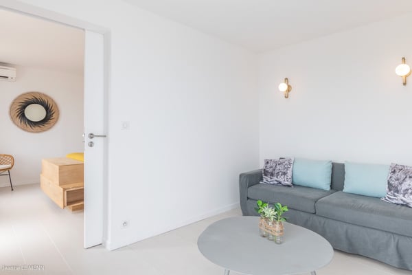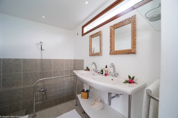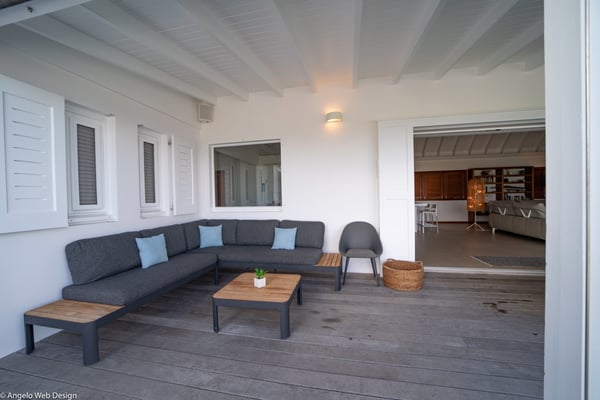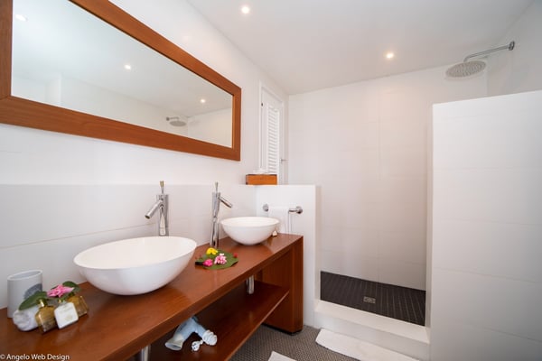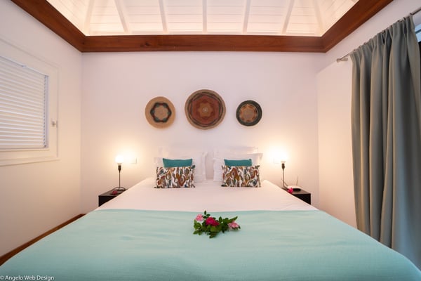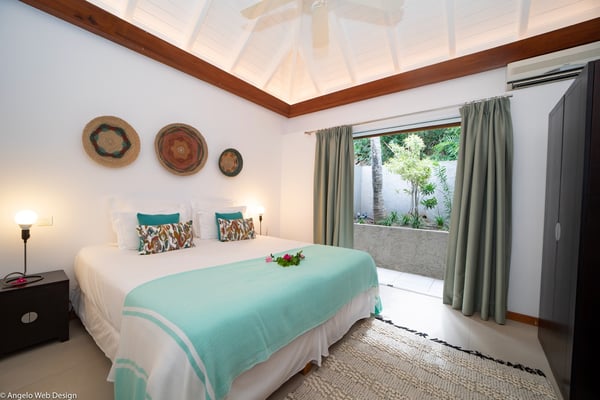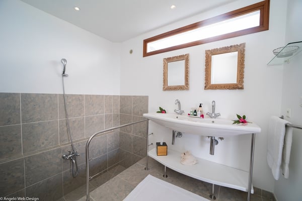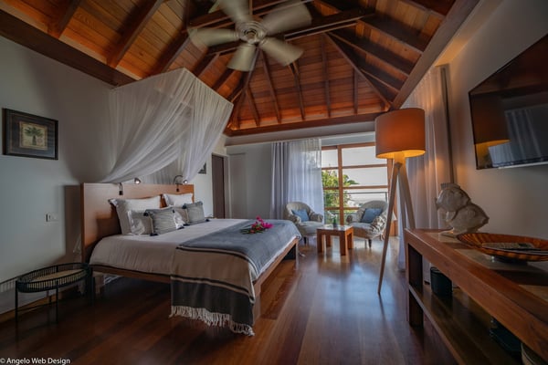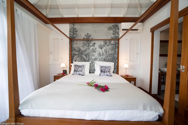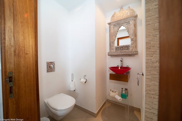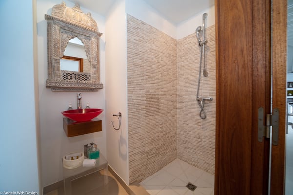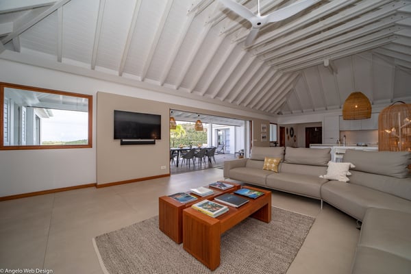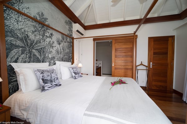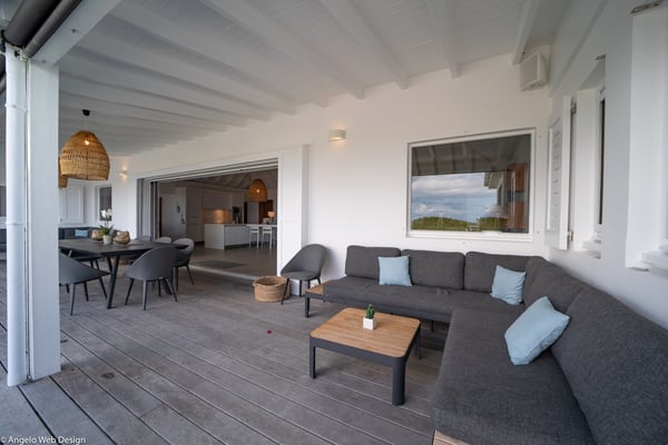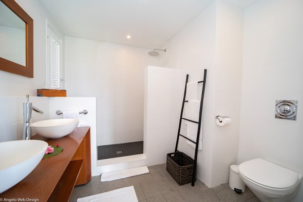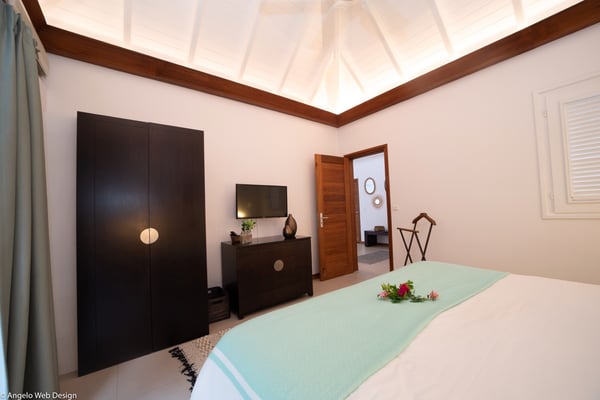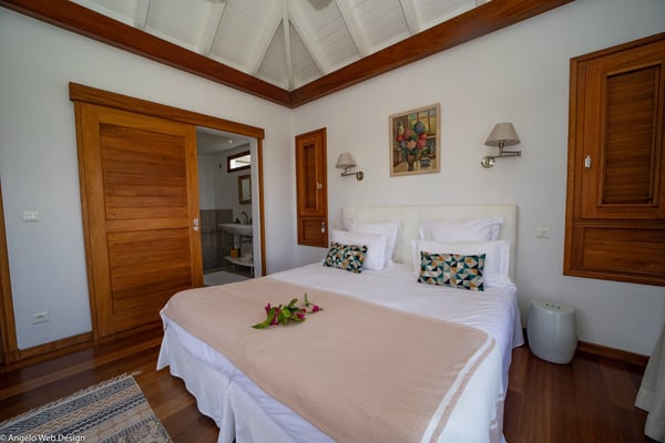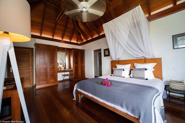 Located on the heights of Flamands, the rental Villa Ocean's 5 is a stunning property that opens onto a magnificent view over the ocean and the surrounding hills. In a lush tropical setting near the beautiful Flamands beach, this luxurious five-bedroom air-conditioned vacation home is ideal for a large family or for a group of friends vacationing together in St. Barths. Built-in a local style on two levels, Villa Ocean's 5 was recently renovated and expanded to offer high-end amenities. In the modern and bright decor with colourful bohemian style hints, you’ll marvel at the spectacular views over the bay and the neighbouring island of Bonhomme. The living room featuring a spacious curved sofa covered with cushions opens onto the well-equipped kitchen with a lovely modern white table. Openings onto the ocean-view terrace create a delightful atmosphere in this open and very airy space. Under the high vaulted ceilings, you’ll feel a pleasant sense of volume while the gentle breeze of the trade winds blows in. On the terrace at the front of the villa, a lovely dining room can accommodate up to eight guests around the table under the covered area. On the other side of this comfortable dining area, there is a lovely heated swimming pool where you can relax under the Caribbean sun. Loungers surround the pool, the very perfect place to read or relax while admiring the ocean and the tropical vegetation of the green hills. Elegant benches covered with cushions are set up close to the outside wall in the shade of the covered terrace, a privileged place to breathe the mild Caribbean air. Vacation villa Ocean's 5 welcomes you in five beautiful air-conditioned rooms, all coming with their own bathrooms for maximum privacy. They are furnished with four-poster king-size, queen-size, and twin beds, with original colourful hints in each of them. Four suites are located on the main level, while the new fifth room is on the lower level of the property. Finally, two rooms can communicate, which is an ideal setup for families with young children.
