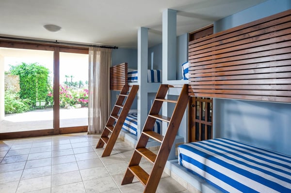 Located in the exclusive private community of Punta Ballena, home to the world-famous Esperanza Resort, Casa Tita is the perfect home for large families. At 8,000 square feet, this eight-bedroom, eight-and-a-half-bath, luxury villa includes all the amenities you need for a relaxing Cabo escape. There are five master suites with king beds, private ensuite baths and private balconies which all include stunning ocean views. Three children’s rooms each with two sets of Twin bunk beds and private baths can also be found in this spectacular home. Great care has been taken to separate the common areas from the bedrooms to allow guests privacy when required, while the spacious areas are perfect for get-togethers. With expansive floor-to-ceiling windows and crisp white walls, the open-concept living and dining area is always bright and airy. Plenty of comfortable seating is available throughout Casa Tita, from the plush cushions of the living room sofas to the poolside lounge chairs out on the terrace. The spacious and lavish patio area is the highlight of this unique property. The large pool is accentuated with picturesque stones that are reminiscent of a modern sculpture. There is more than enough room to entertain and just as many amenities to take advantage of on the terrace of Casa Tita. The gas fire pit, outdoor bar, and generous selection of patio furniture all work to complement outdoor living. Found in an ideal away-from-it-all location, you and your family will have an unforgettable stay at Casa Tita.