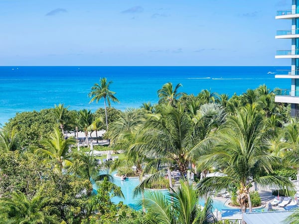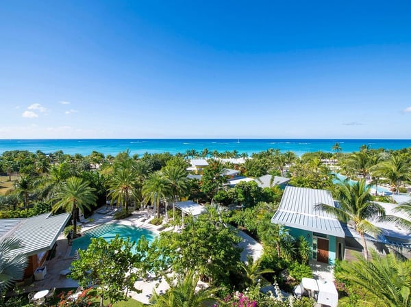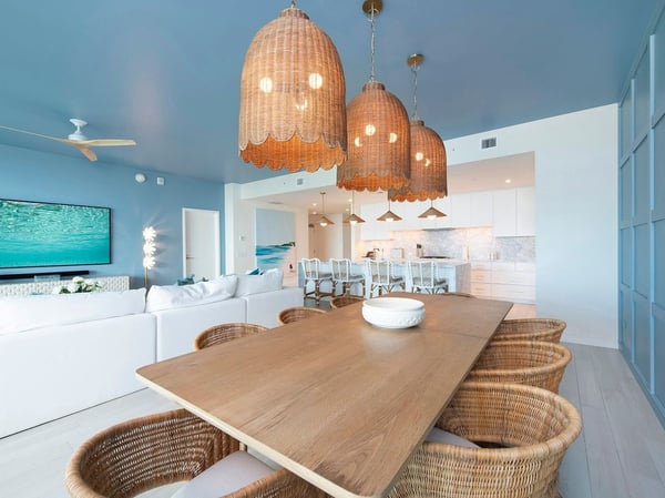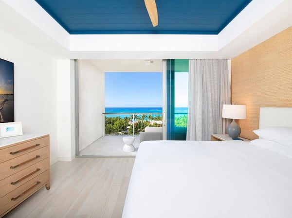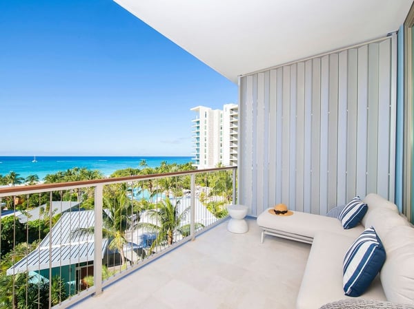 This elegant 3-bedroom residence on Seven Mile Beach offers breezy indoor-outdoor living, sweeping ocean views, and private balconies, creating an exceptional setting for a refined island escape. Designed for travellers who appreciate light-filled spaces and a postcard-perfect backdrop, the residence pairs elevated comfort with an unbeatable beachfront location. Floor-to-ceiling glass fills the home with natural light and allows refreshing sea breezes throughout. The modern, all-white kitchen is a standout, featuring sleek marble surfaces and chic wooden bar seating for casual breakfasts or evening cocktails. A designer driftwood dining table nearby provides an inviting setting for relaxed gourmet dinners at home. Unwind in the spacious living area with a wraparound sofa and flat-screen television, ideal for effortless movie nights. Sliding glass doors open onto an oceanfront balcony with dedicated outdoor living and dining areas, perfect for al fresco entertaining with uninterrupted sea views. The primary bedroom is a serene ocean-view retreat with a king-size bed, cable television, walk-in closet, private furnished balcony, and an en-suite bathroom with a walk-in shower, dual vanity, and soaking tub accented by artwork inspired by the vibrant spirit of the Caribbean. The second bedroom features a king-size bed, island and North Sound views, a walk-in closet, and an en-suite bathroom with a walk-in shower and a dual vanity. The third bedroom offers a king-size bed, island and North Sound views, a private furnished balcony, and an en-suite bathroom with a shower and tub combination.