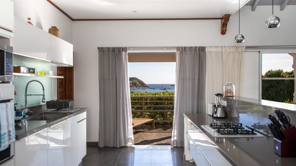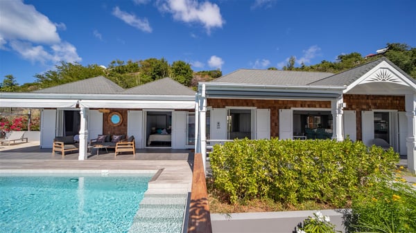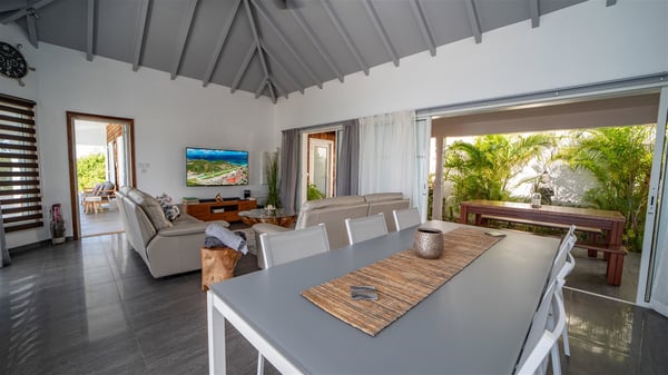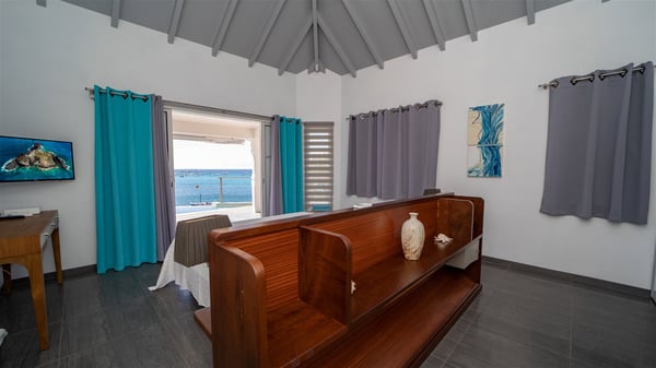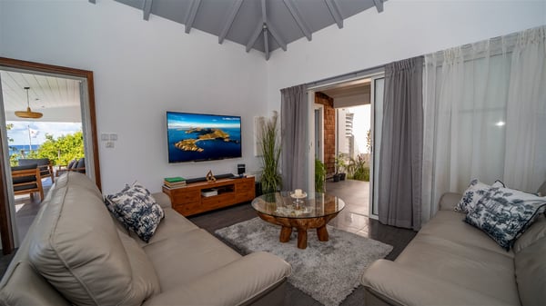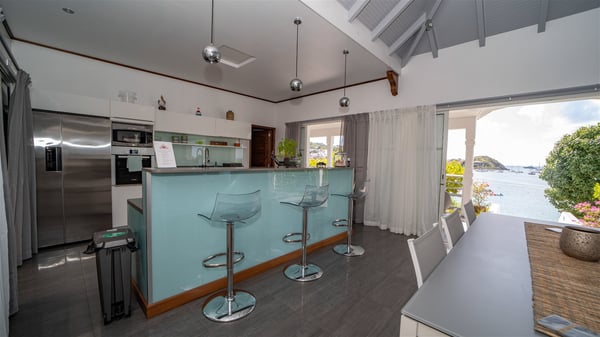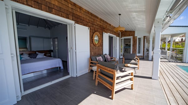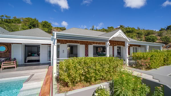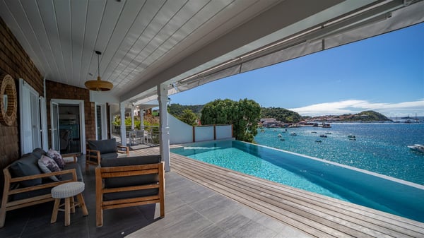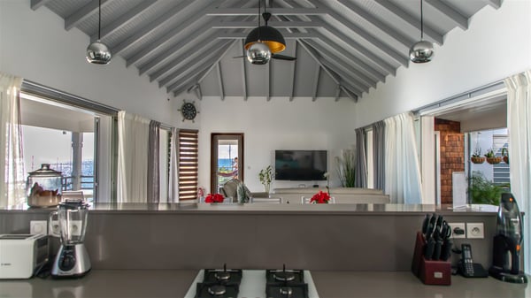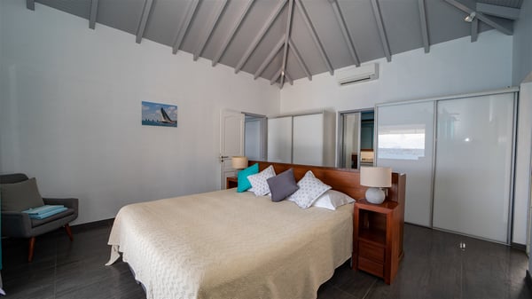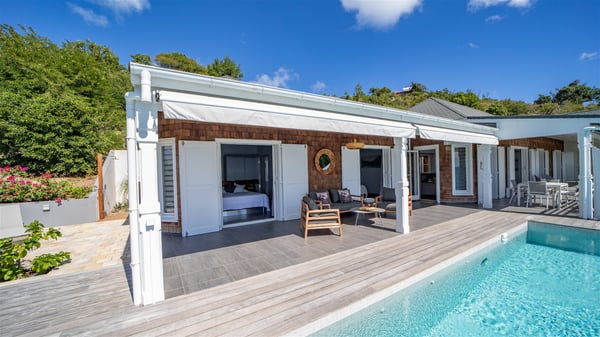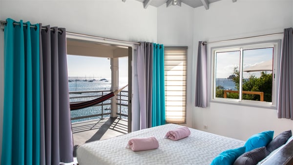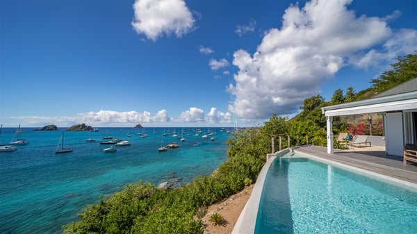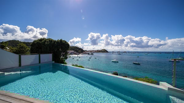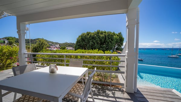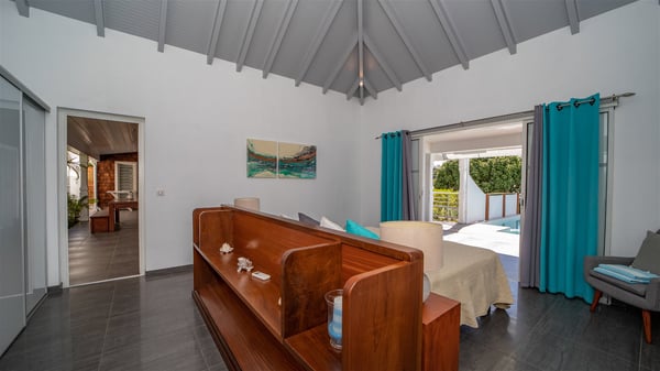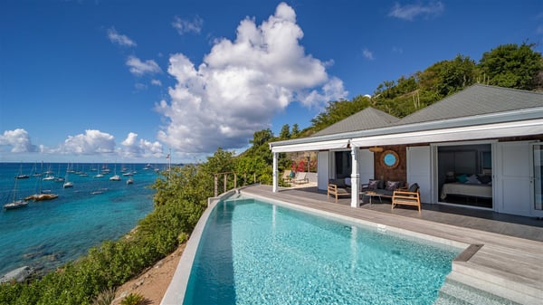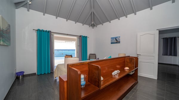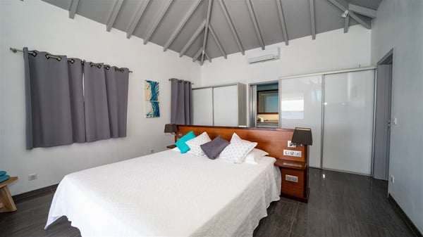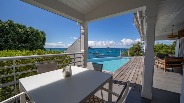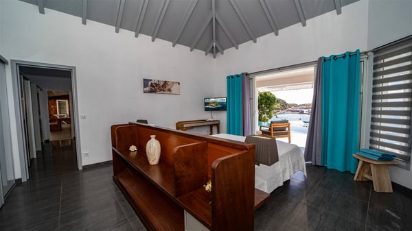 Located in the Public area near Gustavia and Saint-Jean, the elegant rental villa Pleasure offers breathtaking views over the turquoise waters and spectacular sunsets. Nestled at the end of a private road surrounded by tropical vegetation, this home is a quiet place to stay and a great choice for your next vacation in St-Barths. The rental villa Pleasure is also close to the Public beach, and the St-Barth Yacht Club, where you can rent paddle boards or Kayaks. The Caribbean styled-vacation property has been recently renovated and offers modern decoration and utmost comfort. The spacious and open-floor living room lets the soft Caribbean breeze flow in through the windows. It is furnished with comfortable sofas, with green hints in a glass and driftwood decor. The mineral-inspired kitchen offers all the comfort you could wish for and is well-equipped for the preparation of your meals in front of the stunning ocean view. The indoor dining space can accommodate up to six guests in a charming and bright atmosphere. The sleek decor and shades of grey create a warm, relaxing and welcoming atmosphere. Outside, a beautiful terrace opens onto the sparkling ocean, and features a large curved infinity swimming pool. There are deep water areas and benches, a perfect and idyllic scenery for delightful moments enjoying the St-Barths sun, while sitting on the deckchairs or around the sheltered outdoor lounge. A partly covered dining area welcomes you for alfresco dining, and there is also a large outdoor dining table opening onto the large living room. The back terrace provides restful and quiet areas for pleasant moments of reading or gathering. The holiday rental villa Pleasure in St-Barths welcomes you with family or friends in three bedrooms with stunning ocean and tropical vegetation views. Two of them have a king-size bed and connect. The third bedroom is furnished with a queen-size bed topped by a curtain in a poetic atmosphere. All bedrooms have an en-suite bathroom for utmost privacy and comfort.