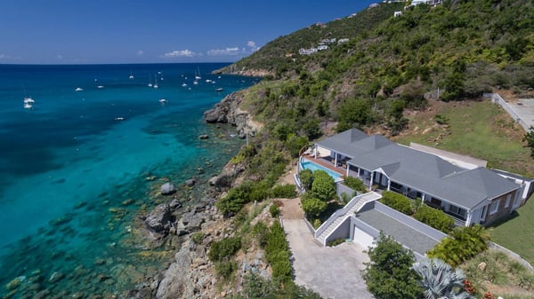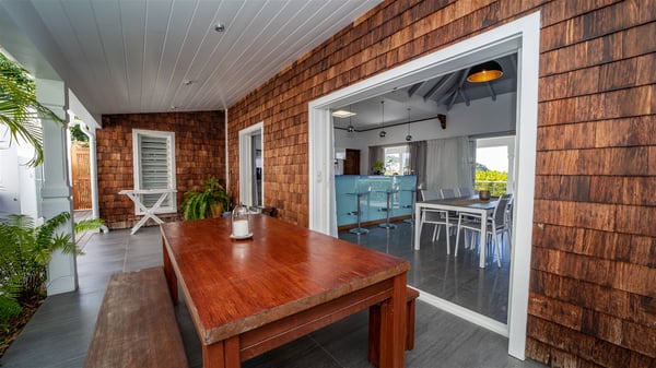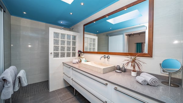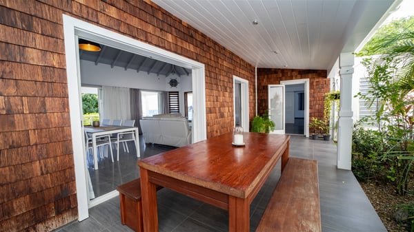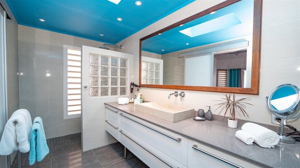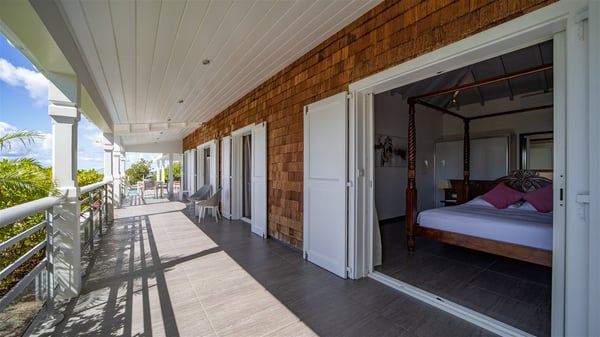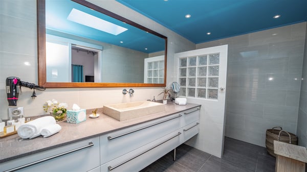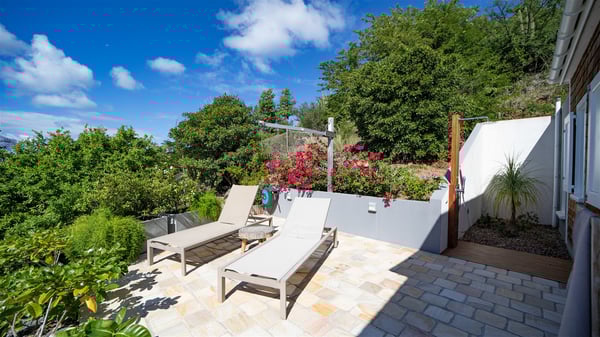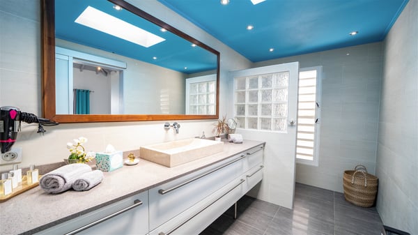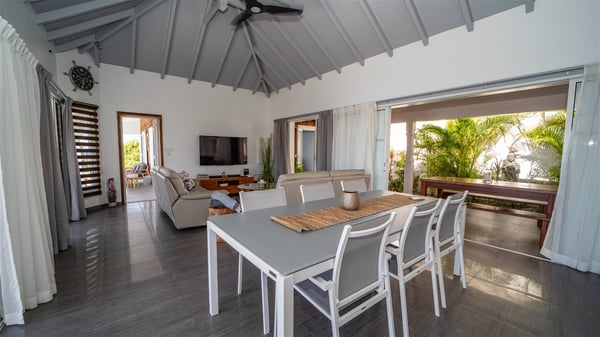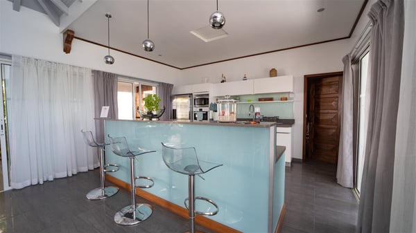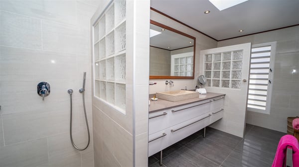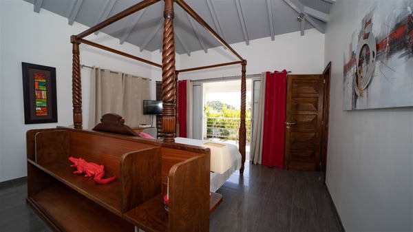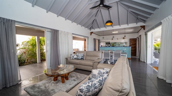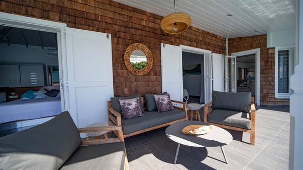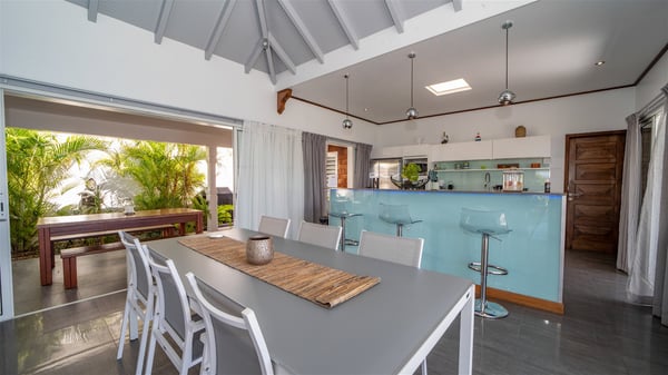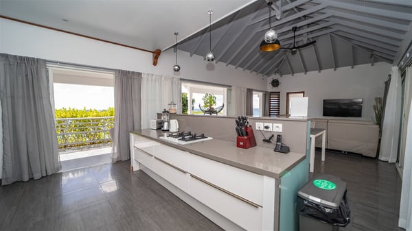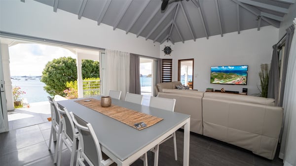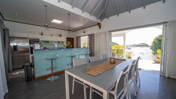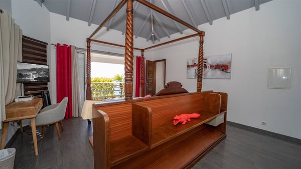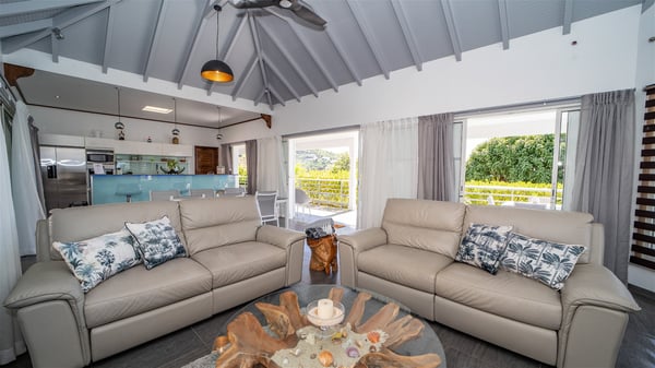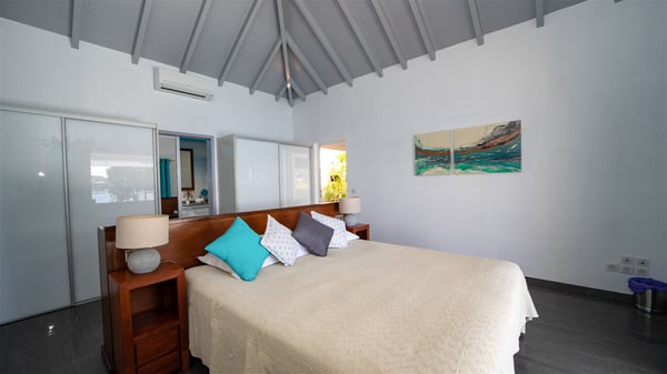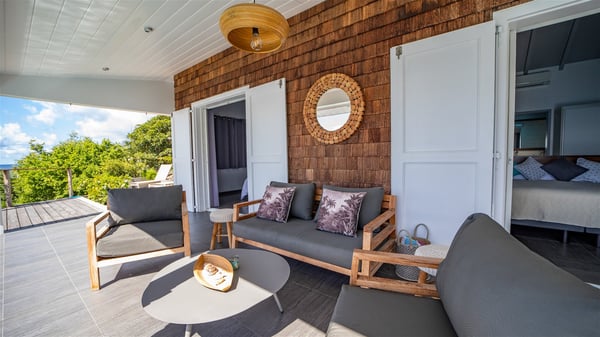 Located in the Public area near Gustavia and Saint-Jean, the elegant rental villa Pleasure offers breathtaking views over the turquoise waters and spectacular sunsets. Nestled at the end of a private road surrounded by tropical vegetation, this home is a quiet place to stay and a great choice for your next vacation in St-Barths. The rental villa Pleasure is also close to the Public beach, and the St-Barth Yacht Club, where you can rent paddle boards or Kayaks. The Caribbean styled-vacation property has been recently renovated and offers modern decoration and utmost comfort. The spacious and open-floor living room lets the soft Caribbean breeze flow in through the windows. It is furnished with comfortable sofas, with green hints in a glass and driftwood decor. The mineral-inspired kitchen offers all the comfort you could wish for and is well-equipped for the preparation of your meals in front of the stunning ocean view. The indoor dining space can accommodate up to six guests in a charming and bright atmosphere. The sleek decor and shades of grey create a warm, relaxing and welcoming atmosphere. Outside, a beautiful terrace opens onto the sparkling ocean, and features a large curved infinity swimming pool. There are deep water areas and benches, a perfect and idyllic scenery for delightful moments enjoying the St-Barths sun, while sitting on the deckchairs or around the sheltered outdoor lounge. A partly covered dining area welcomes you for alfresco dining, and there is also a large outdoor dining table opening onto the large living room. The back terrace provides restful and quiet areas for pleasant moments of reading or gathering. The holiday rental villa Pleasure in St-Barths welcomes you with family or friends in three bedrooms with stunning ocean and tropical vegetation views. Two of them have a king-size bed and connect. The third bedroom is furnished with a queen-size bed topped by a curtain in a poetic atmosphere. All bedrooms have an en-suite bathroom for utmost privacy and comfort.