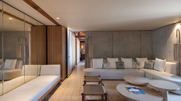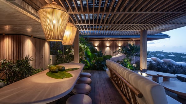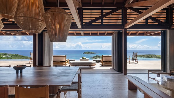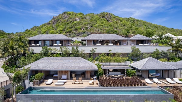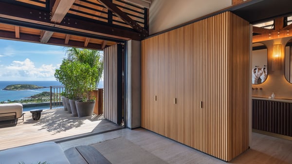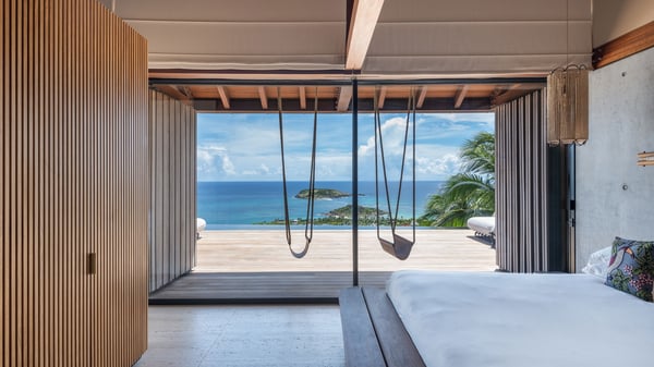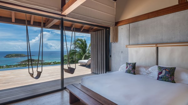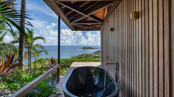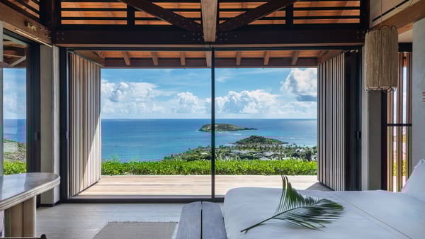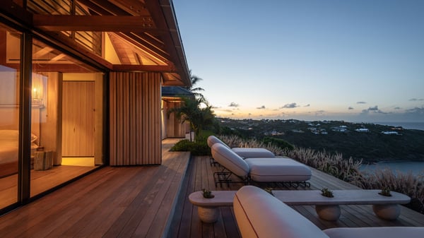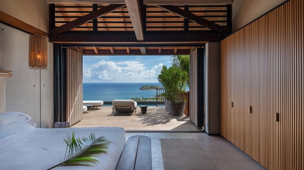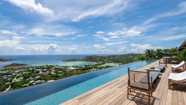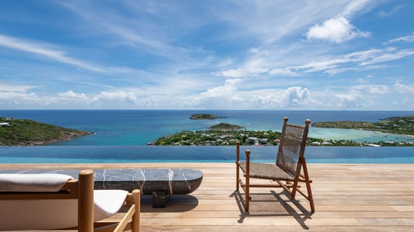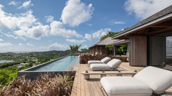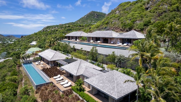 Le Manoir Voltaire is an extraordinary 7-bedroom property in Marigot, overlooking Grand Cul-de-Sac lagoon. A true masterpiece, this exceptional property is a tribute to beauty, featuring two stunning pools, a Japanese-inspired water pool, and bright living spaces with the finest amenities. Nestled above Marigot Bay, MANOIR VOLTAIRE accommodates up to 14 guests in utmost luxury, offering an unparalleled retreat in St-Barths. Set on a 4,000 m² estate, Le Manoir Voltaire boasts breathtaking panoramic views over the bay and lagoon. Designed with contemporary elegance, this magnificent villa is composed of two expansive parts, each with striking living areas and fantastic pools. The upper-level villa features an open-concept living space that extends onto the vast terrace, furnished with plush sofas and armchairs beneath a beautiful wooden framework. You’ll find the elegant indoor dining area complementing this inviting space, while the professional kitchen is perfectly equipped for a private chef, whether for a special event or for the duration of your stay. A dedicated TV lounge is also available for delightful movie nights or relaxing moments. Some steps below, the lower-level villa opens onto a sweeping ocean panorama, with a refined living area, a breathtaking alfresco dining space, and a fully-equipped kitchen. At the front of the estate, Le Manoir Voltaire opens onto an uninterrupted view of the crystalline waters of the bay and lagoon, with two exquisite terraces that sparkle in the glow of the Caribbean sun. The 52-meter infinity pool on the upper level is lined with elegant lounge chairs, an invitation to unwind while admiring the infinite horizon. On the lower level, the 30-meter pool is surrounded by sunbeds, creating an idyllic setting for pleasant moments. Separating the two parts, you’ll love the mesmerizing Japanese-inspired water feature with a waterfall, a touch of serene sophistication and an intimate oasis where the gentle sound of flowing water enhances the villa’s refined ambiance. Le Manoir Voltaire consists of nine beautifully designed bedrooms, each with an en-suite bathroom. Six are situated on the upper level, while three are located below; all but two offer breathtaking ocean views and private terraces, and one of the suites features an outdoor bathtub. The remaining two bedrooms, located on the lower level of the upper part, are ideal for staff and children, with one offering bunk beds for up to six children. Every detail of MANOIR VOLTAIRE reflects an exceptional level of elegance, with exquisite Balinese wood and refined marble. Ideally located in Marigot, Le Manoir Voltaire is the ultimate luxury retreat for up to 22 guests in St-Barths.