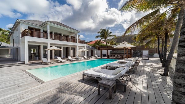 With a large entrance opening onto a woody palm tree ground and a perfect lawn, the luxurious rental villa Sand Club is one of the most outstanding properties in St. Barths, and among the most impressive beachfront villas located on the Flamands Beach. This modern colonial-style mansion is a true treasure, an ode to dreams and relaxation. The villa Sand Club is built on several pavilions while the main house is built on two levels. The very contemporary living room features expansive sofas and armchairs with blue-sprinkled cushions: a perfect setup for spending delicious moments listening to the sound of the waves. In an oceanic atmosphere coming with white walls and a very refined decoration, while the shutters filter Saint-Barth’s light, all is quiet and soothing. The magnificent indoor dining room table made of white wood will be the perfect spot for your delicious gastronomic moments. At the back of the living room, the perfectly designed and equipped kitchen is a heaven place for preparing meals or calling upon a private chef. The view over the main alley planted with palm trees provides a great feeling of perfect space symmetry. In the bungalow at the back, a second modern living room is dedicated to entertainment for movie nights and relaxation. Facing the beach, the large terrace extends over a wooden deck with a superb long heated swimming pool surrounded by lounge chairs and umbrellas. There is also a day-bed with curtains whenever you wish to have a rest under the ajoupa. On the other side of the pool, a spacious gazebo is set up with a dining table for pleasant outdoor evenings. A private access leads you to the beach of Flamands from this exceptional terrace. The luxurious villa Sand Club has six large air-conditioned suites, furnished with king or queen-size beds, canopies, curtains and cushions, all in a cozy atmosphere. On the upper level of the villa, there is a master suite with a private balcony. Two bedrooms are located at the back of the storey, one of which can accommodate four children on bunk beds. Three other suites are located in independent bungalows and open directly onto the terrace, providing guests utmost privacy. A building located at the entrance of the villa has three bedrooms and a kitchenette, ideal for teenagers or staff.
