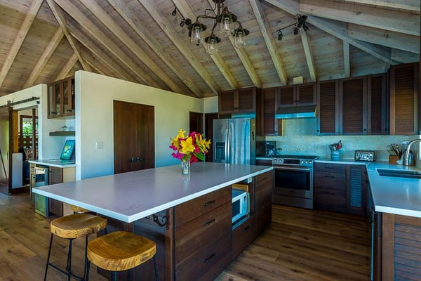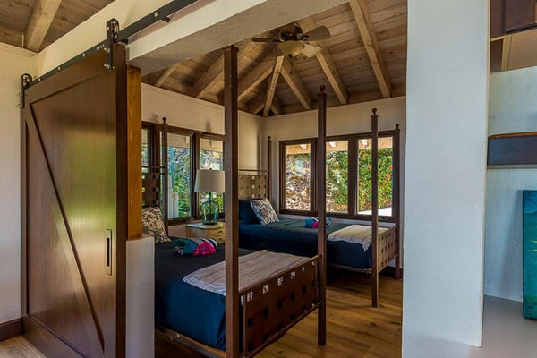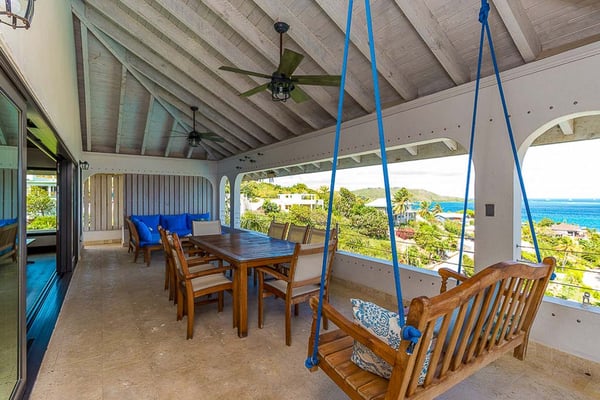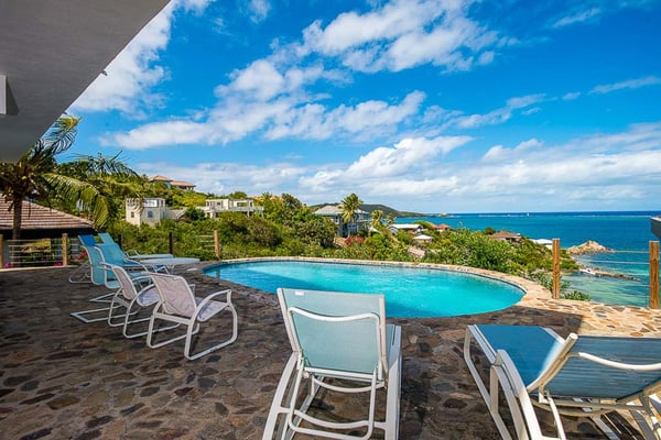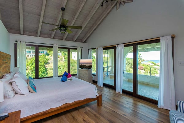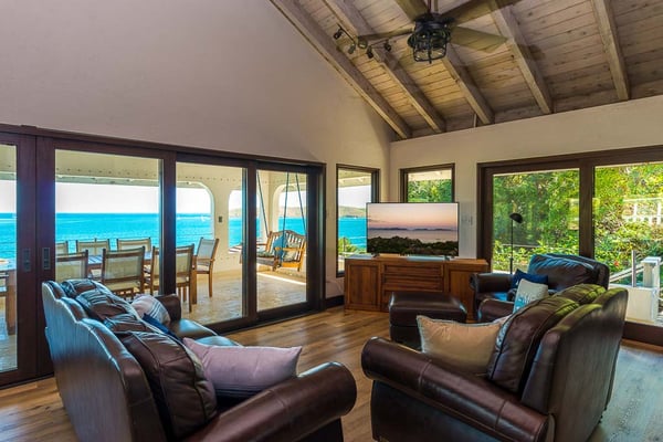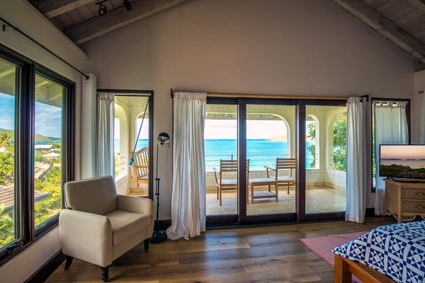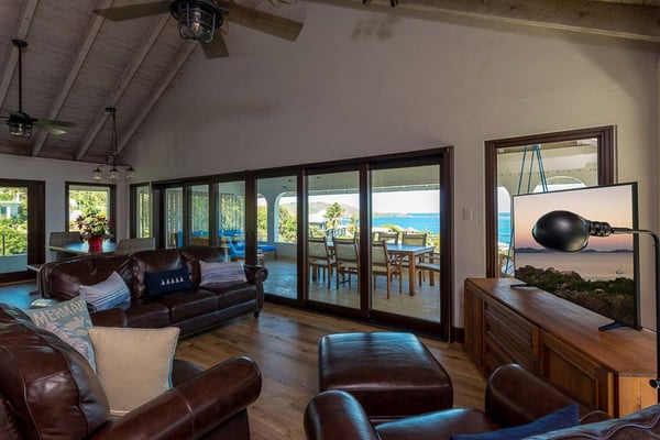 Dos Sol Villa’s unique custom architectural design separates each bedroom into its own standalone cottage. Family and friends can gather in the spacious great room with a full kitchen and dining area or outside on the pool deck and large covered verandah with living and dining areas overlooking the water. The master suite is designed for privacy and intimacy with a king-sized bed, sitting area, covered verandah, and outdoor furniture. The other two-bedroom pavilions have Caribbean-style outdoor showers and porches overlooking the water. A den directly off the living room with a twin bed easily converts to a small fourth bedroom, complete with an en suite bathroom. This fourth bedroom is accessible from the main entrance and is ideal for an individual with limited mobility. Central to the main house and cottages is a heated, 10,000-gallon freeform freshwater swimming pool (depth 3 ft – 6 ft) surrounded by a native stone deck. Boasting nearly an acre of land, the grounds are meticulously tended by a gardener, with charming pathways to allow viewing of the beautiful tropical flowers and trees. Bananas, mangos, limes, oranges, pineapples, papaya, coconut, and soursop are some of the many fruits grown on the property and available to guests while in season.