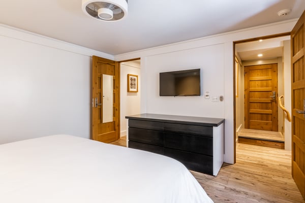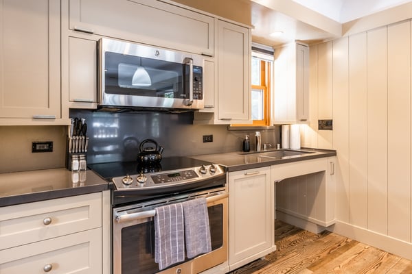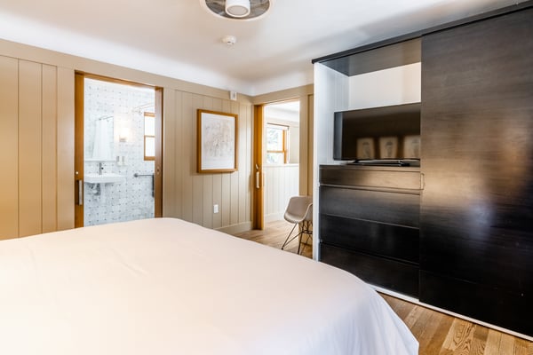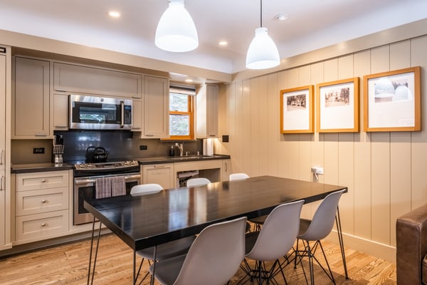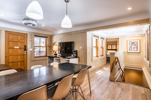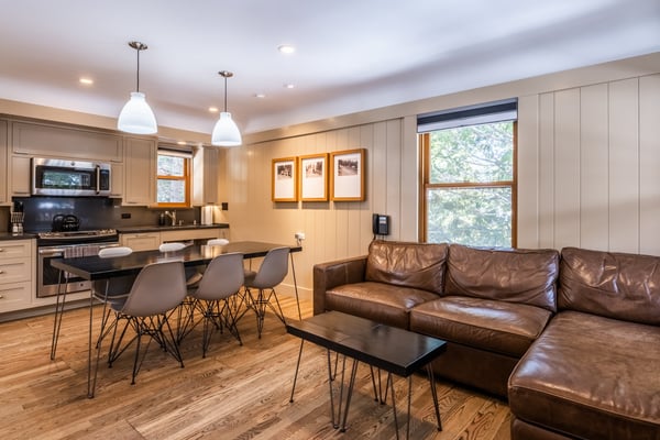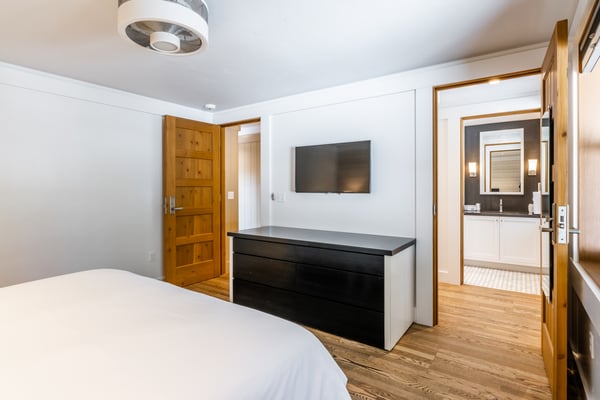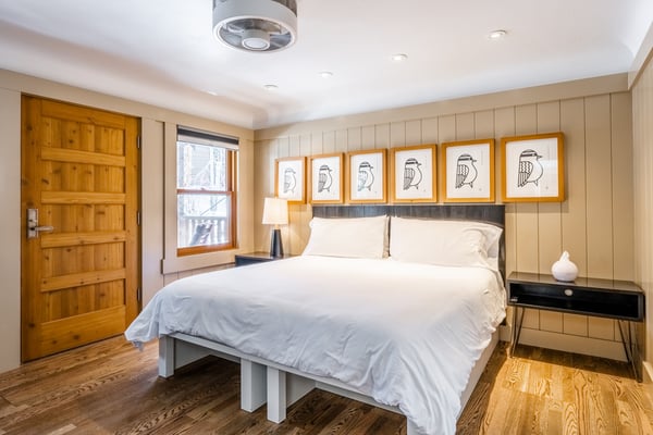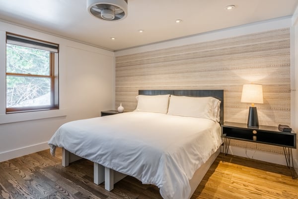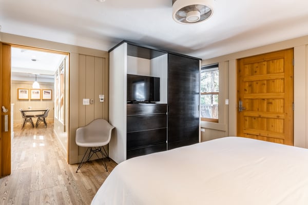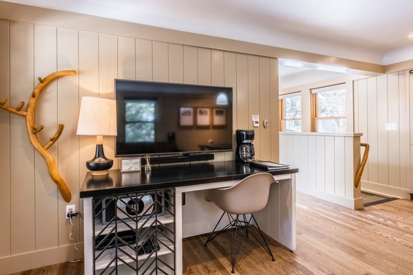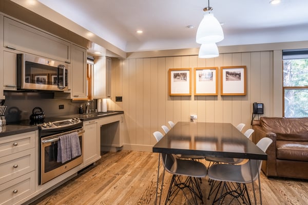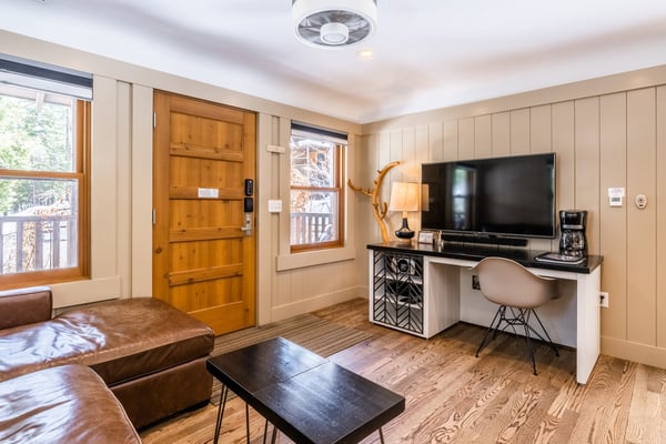 Ideal for families, this accessible 3-bedroom cottage offers a convenient place to enjoy Lake Tahoe with easy access to the beach and mountains, and room for multiple generations. Hardwood floors, picture windows and high ceilings welcome you on the main floor of this two-level cottage, where picture windows offer glimpses of wooded grounds. A full-length leather sectional faces a large-screen TV for quiet evenings after days of adventure, complete with a smart soundbar, cable, a blu-ray player and streaming options. A spacious writer’s desk with storage adds a comfy place to sneak in a day “at the office” during longer stays. When you need a break, step onto one of two covered porches, surrounded by towering cedar trees. The living area opens seamlessly onto a gourmet eat-in kitchen with a six-seat dining table. If you feel inspired to explore your culinary side, you can craft home-cooked meals with state-of-the art appliances by Bosch, GE, and Liebherr. When it’s time to retire, three spacious bedrooms easily accommodate up to six guests. Each uniquely styled bedroom offers a king-sized bed that can be converted to two twins upon request. Please be advised that this home does not have air conditioning. All bedrooms have cable TV and large walk-in closets. Each bedroom can also accommodate a crib or floor futon for young children. The lower level has a private laundry room to keep ski clothes and bathing suits dry for the next day of adventure, while the upper level has a separate powder room for added convenience. As a guest of Cedar Crest Cottages, you’ll enjoy access to the community BBQ grill and oversized fire pit with filtered lake and mountain views. In the summer, stroll to the beach across the street for swimming, sailing and boating on the lake, or hike through the surrounding mountains. In the winter, drive less than two minutes to the family-friendly Homestead Mountain Resort, or just 25 minutes to the varied terrain of Squaw Valley. A historic vacation retreat with modern amenities and warm hospitality, Cedar Crest Cottages lies on the West Shore of Lake Tahoe, offering easy access to state parks and the restaurants, shops and entertainment of Tahoe City, a 10-minute drive. Whether you’re escaping to Tahoe for the trails, slopes or lake adventures, Sparrow Cottage offers a convenient, accessible retreat with a tranquil atmosphere and modern amenities. *Please be advised that this home does not have air conditioning.