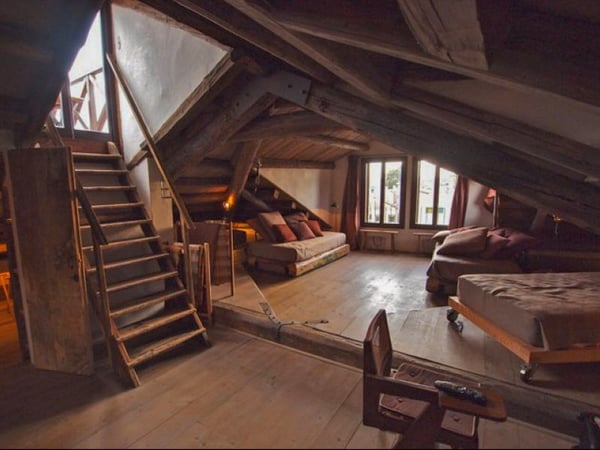 - Loft space (low clearance is some areas) with four sofa-beds, ideal for teenagers, open kitchen and private bathroom with shower. (4 people of total 14)