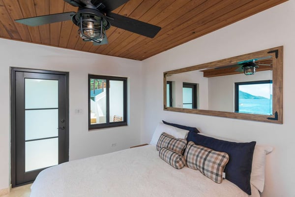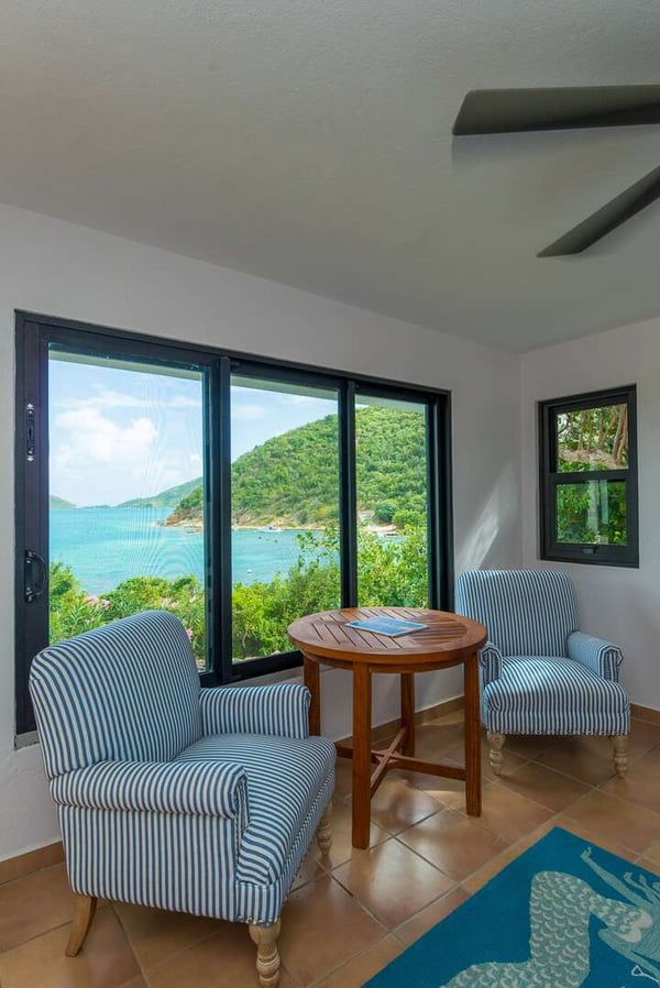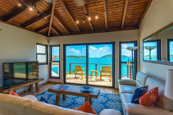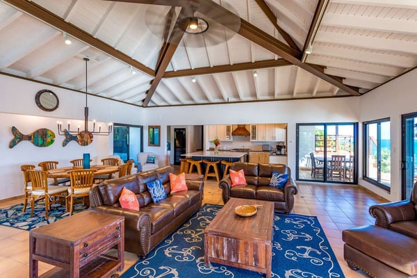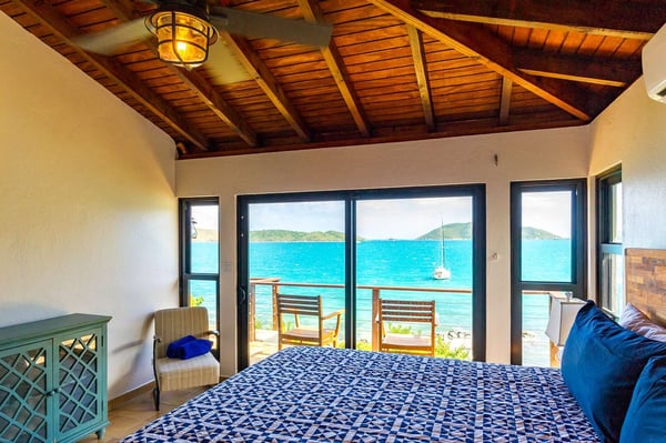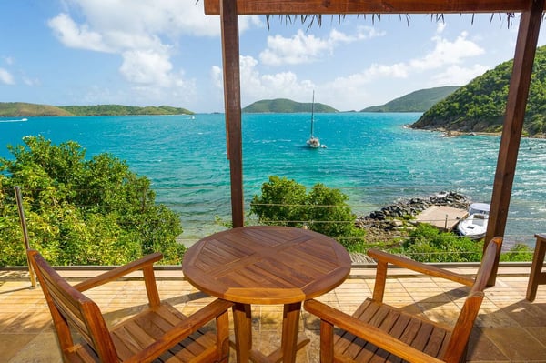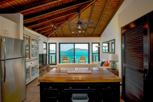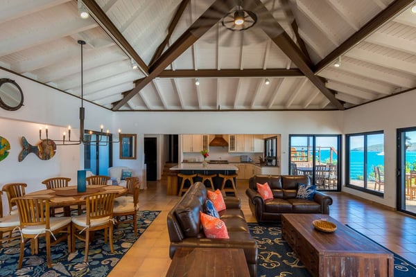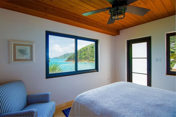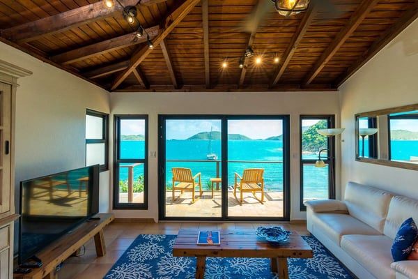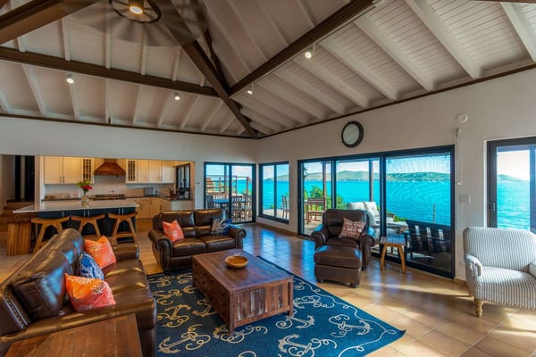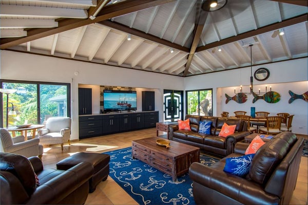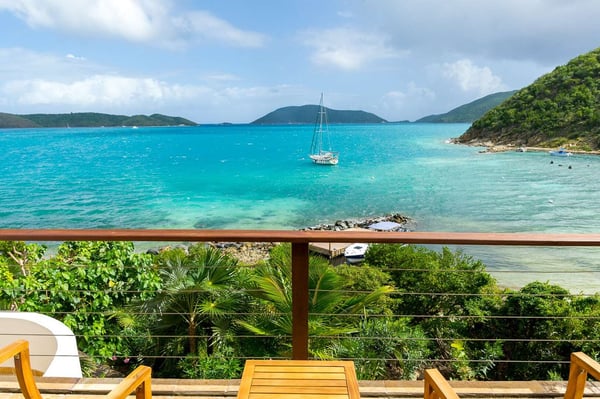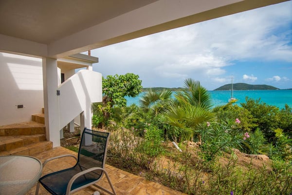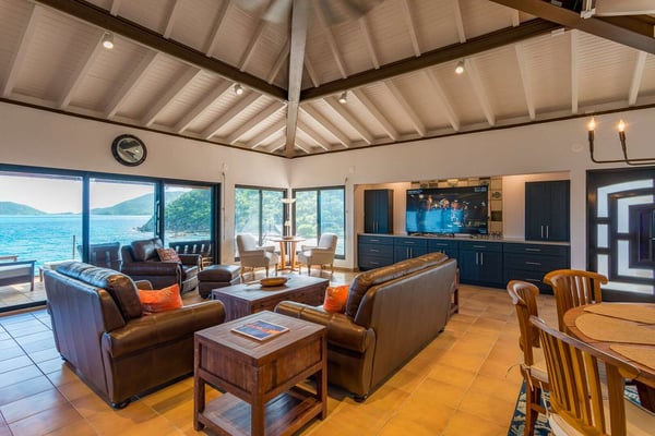Rainbow’s End’s spacious cathedral-ceilinged great room includes a living area with an entertainment center offering panoramic views from Bitter End Yacht Club to Saba Rock Resort. Ideally suited for intimate island getaways with family and close groups of friends, the great room features an island that seats six, an entertainment center, and secluded areas perfect for hiding away with a good book. The Master Suite boasts a kitchenette and living room area, whilst the lower-level bedrooms have private seaside patios. Outside Rainbow’s End, there is a large expansive deck ideal for soaking in the sun and dining al fresco. This popular Virgin Gorda ocean-view rental is just steps from the beach and is near local dining options and attractions. Guests are welcome to use the facilities at Leverick Bay Resort & Marina, including the pool, tennis courts, and dining.
