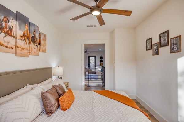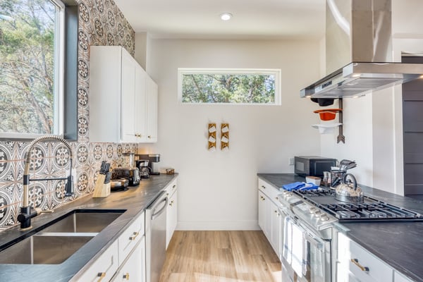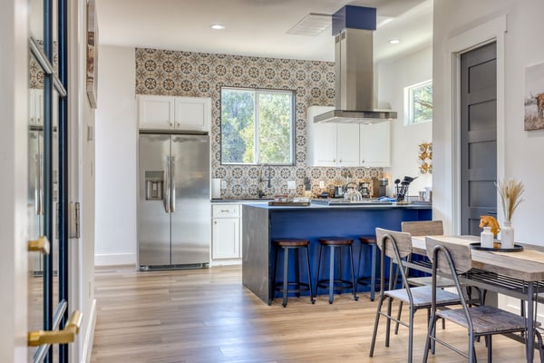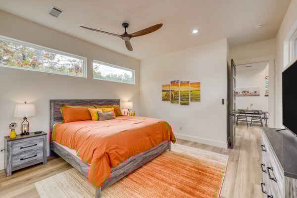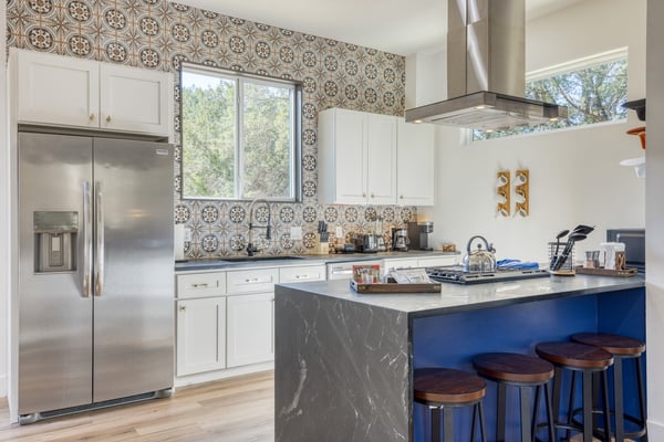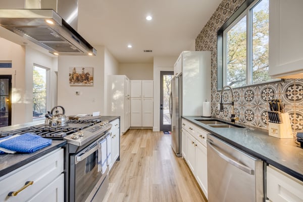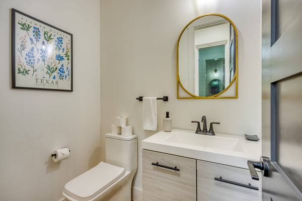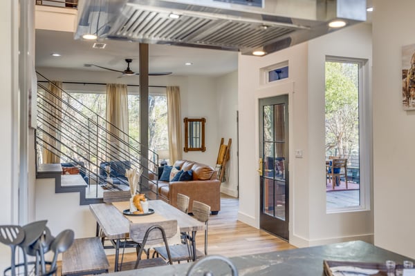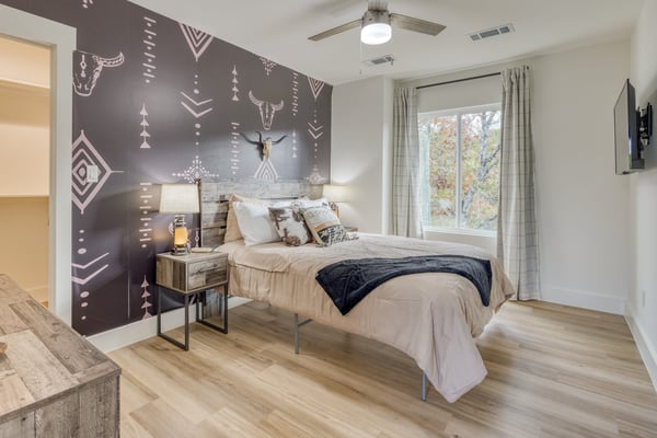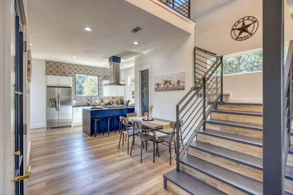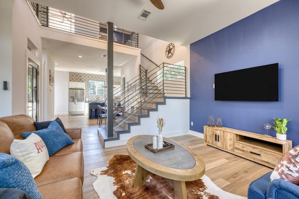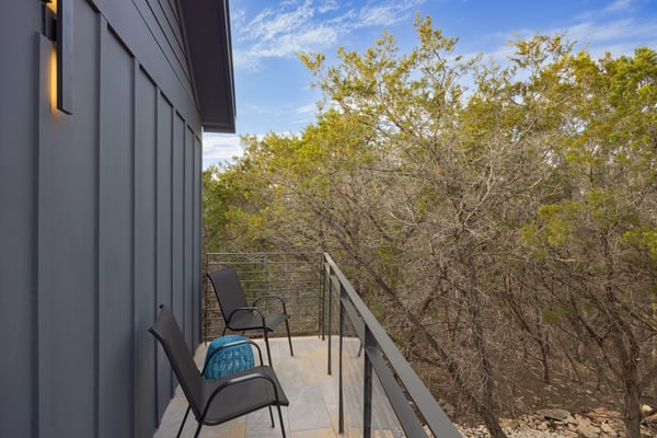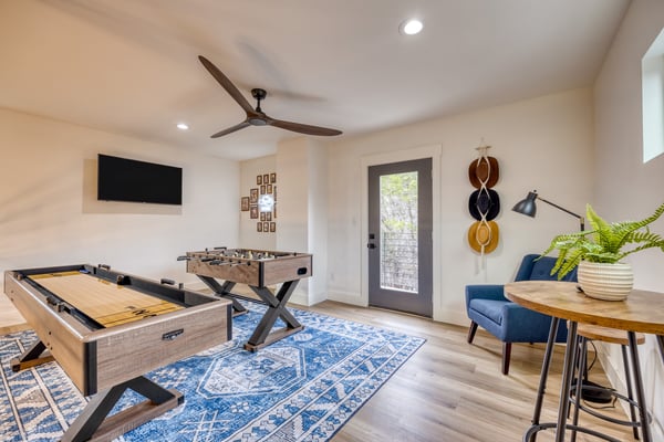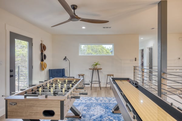 Introducing Wildflower Retreat – a four-bedroom sanctuary just 40 minutes from Downtown Austin, where contemporary sophistication meets natural elegance. One of the highlights of the home is its incredible design. A sleek, modern retreat surrounded by lush trees, Wildflower Retreat boasts an industrial-chic design throughout every space. The exterior is a beautiful charcoal gray with wood accents, echoing the combination of metal and natural materials throughout the interior decor. Outside, a spacious deck invites you to a private pool, hot tub, and al fresco dining area. The lower patio, complete with a firepit lounge and BBQ grill, is perfect for easy at-home meals and late-night chats under the stars. Inside, the main living room offers comfortable seating and a TV, the perfect place to enjoy your favorite shows and movies. Nearby, a spacious dining table is ready for family meals or group games, while additional barstool seating in the fully equipped kitchen (complete with a full suite of sleek appliances) ensures everyone has a space. Upstairs, the game room awaits, offering entertainment with another TV, foosball, shuffleboard, and balcony access for a breath of fresh air. The primary king suite is a haven of its own, with a TV and a luxury ensuite bathroom boasting a standalone soaking tub, dual sinks, and a large walk-in shower. You'll also find another king room, queen room, and bunk room with its own ensuite, perfect for kids. Nestled on a large, private lot, Wildflower Retreat provides the utmost privacy, ensuring your retreat is a world apart. Yet, a short journey transports you to the vibrant heartbeat of Austin, complete with plenty of dining, shopping, cultural experiences, and entertainment options. Indulge in upscale living at Wildflower Retreat – where design, luxury, and seclusion harmonize for an unforgettable escape. There are so many reasons to love Austin, and its incredible barbecue is just one. The live music capital of the world, Austin, has a thriving art scene and a party culture to match. Its crown jewel, Lake Travis, has lively bars, restaurants, golf, and parks. Spend your days on the lake's crystal clear waters, bar hopping on Sixth Street, and shopping down South Congress Ave. Locals and visitors love to "keep Austin weird," which is reason enough to travel to this quirky city.