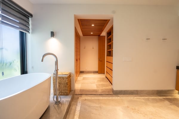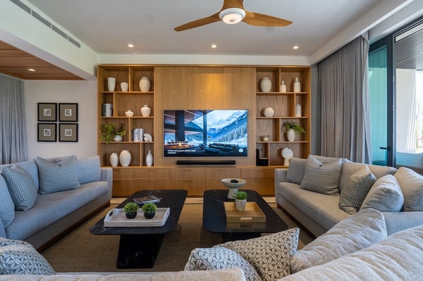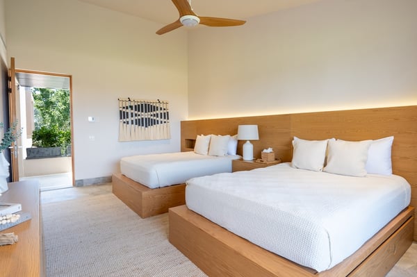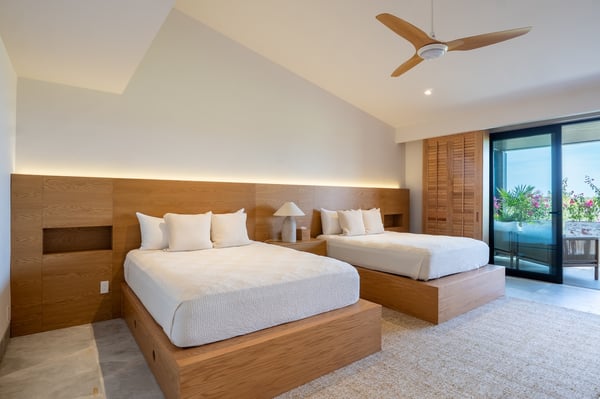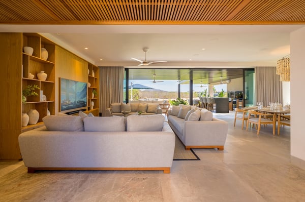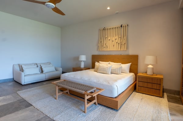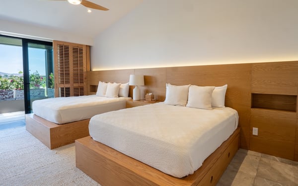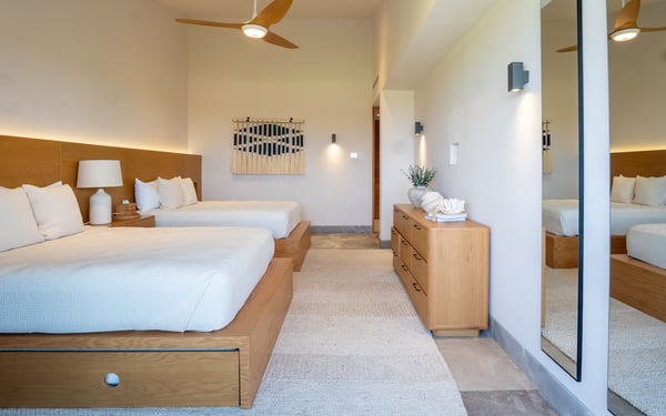 The Premier Golf Membership grants access to Pacifico Golf Course ($), Bahia Golf Course ($), the Tennis Centre ($), the Fitness Center ($), El Surf Club based on min. consumption fee ($), St.Regis Beach Club based on availability and min. consumption fee ($), Pacifico Beach Club, Sufí Ocean Club and Kupuri Beach Club ($). Contact one of our Villa Specialists for more information. Tucked within the exclusive Porta Fortuna enclave of Punta Mita, Villa 6 is where contemporary elegance meets the lush tranquility of nature. This newly designed luxury home welcomes up to 12 guests and offers panoramic views of the golf course, surrounding lake, and mountains—ideal for those seeking a refined escape in one of Mexico’s most coveted coastal destinations. Porta Fortuna Villa 6 was built for connection and relaxation. With four spacious bedrooms and flexible sleeping arrangements—including pull-out beds beneath every queen-size bed—this villa comfortably hosts large families, retreats, or celebratory gatherings. Mornings start best by the private pool, coffee in hand and mountain views ahead. Evenings invite you to the outdoor grill and dining area, where meals stretch long into the golden hour. Inside, the design blends clean architectural lines with tropical materials and textures, creating a space that feels both luxurious and grounded. Every detail, from the layout to the finishes, is crafted to offer comfort, privacy, and effortless indoor-outdoor living.