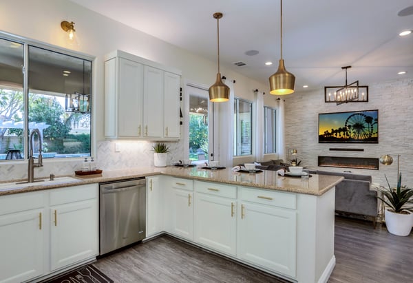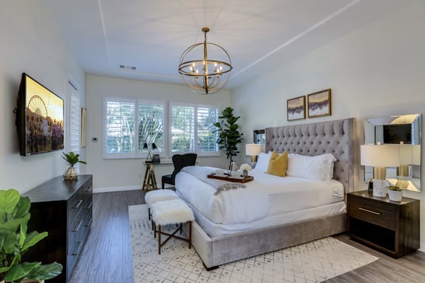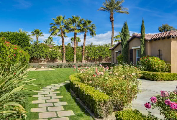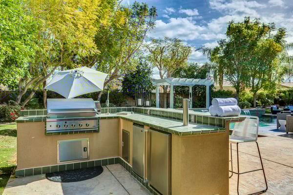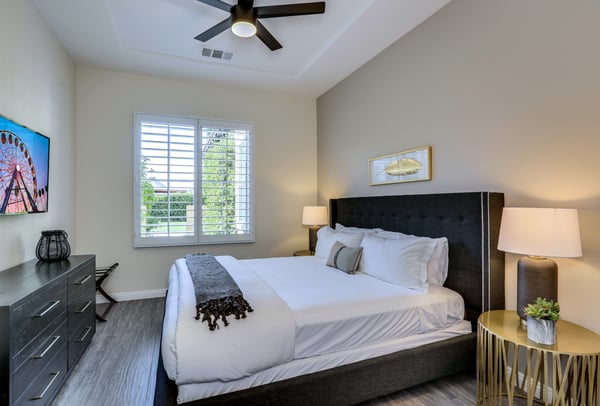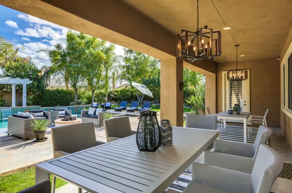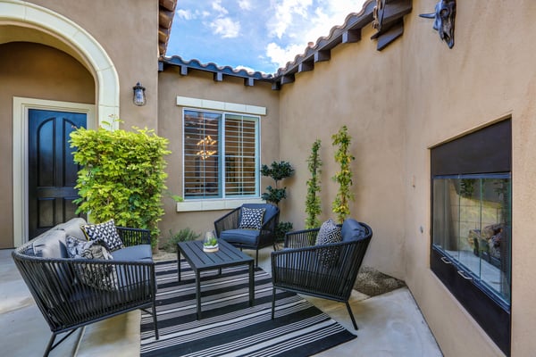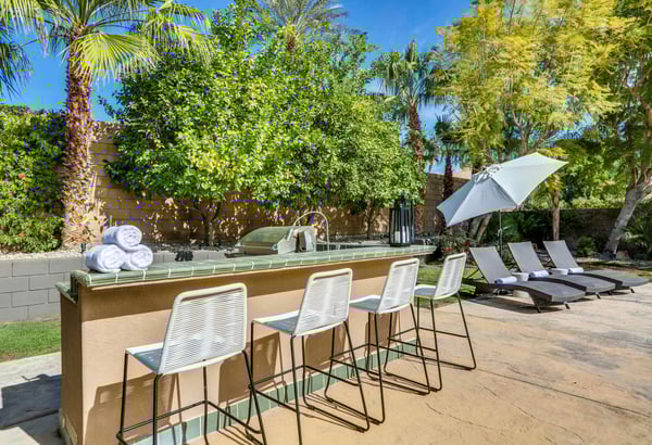 This immaculate, professionally-designed villa with a private courtyard and impressive backyard invites comfort, luxury and exudes modern elegance. With 5-bedrooms, 4.5 baths, generous living space and stylish finishes, you'll enjoy a perfect getaway for hosting family and friend while relaxing & entertaining. Enjoy gatherings in the modern living/dining area graced by a large fireplace, expansive windows and glass door that leads out to the large backyard. There are beautiful hardwood floors and plenty of natural light flow throughout the home's open, airy layout. Other special highlights include a modern fireplace, rich stacked stone media wall, designer lighting and ceiling fans, brand new washer/dryer. The recently-renovated gourmet kitchen will inspire your inner chef with its granite counters, breakfast bar with seating and all new stainless steel appliances. This modern backyard retreat was designed to entertain with multiple seating areas, two large dining tables and lounge chairs for 6. There is a fireplace and lounge area in the front courtyard in addition to the built in fire pit in the backyard. Looking to grill some burgers and chill your beer? Enjoy the custom-built-in BBQ island with grill, mini fridge and burner. To further your entertainment options, enter the transformed garage space turned into the perfect game room! Custom-painted walls, epoxy flooring, and tons of games! Enjoy shuffleboard, foosball, poker/chess/checkers table and ping pong without leaving the comforts of your desert oasis. License Number: 050702