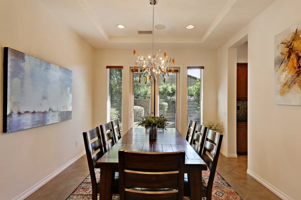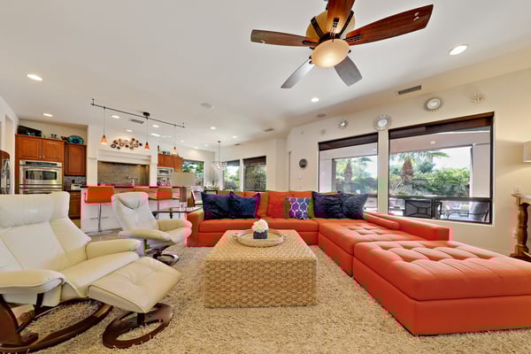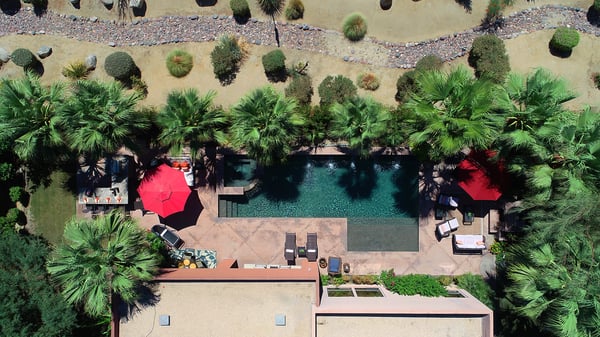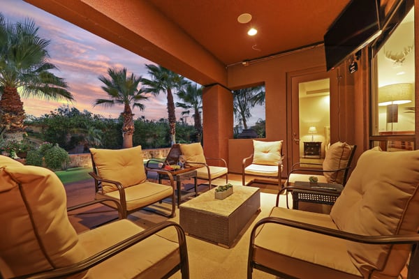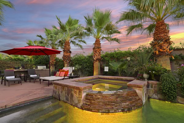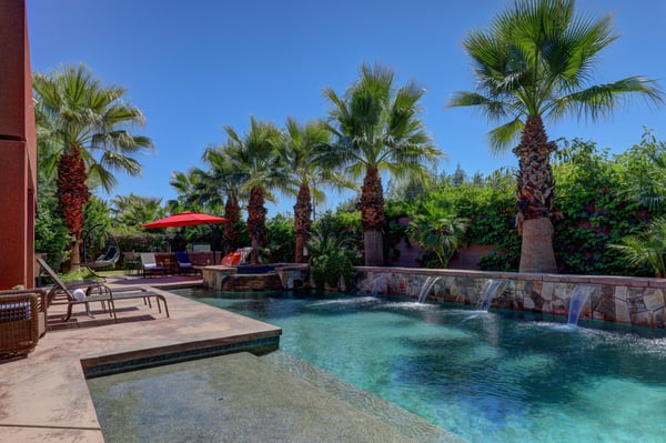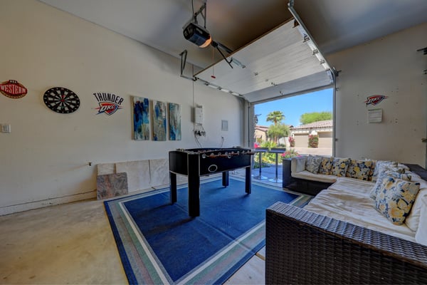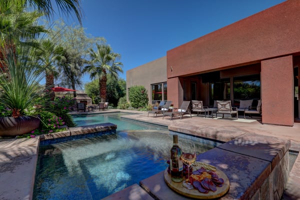 Paramount is the ultimate in fun! Massive yard with tons of amenities, an indoor game room, gourmet kitchen, big screen TV... Whatever your pleasure, Paramount has something for everyone. This turn-key furnished 5-bedroom, 4.5 bath luxury home comfortably sleeps up to 14 people and is ready for your arrival. Tucked away in a private, gated community, just minutes away from shopping, dining, spas, golf and casinos. Outdoors: The spacious yard is over half an acre and features a sparkling saltwater pool and spa with water features, in-pool seating and tanning shelf. The beautiful pool is surrounded by seating and lush palms. The showpiece gas fireplace is the perfect spot to kick back at night with seating for 4. Lots of other seating options with 4 lounge chairs and a sectional couch and chair for 6+ with wall mounted flatscreen TV so you can catch the game wherever you're at. Bust out a game of cornhole. Go for a round on the 5-hole putting green. Grill up your dinner on the built-in BBQ and dine at the 6-person outdoor table or 4 bar stools at the BBQ island. Depending on your temperature, the misters turn on at the flip of a switch! Indoors: The modern furnishings are the perfect backdrop to all of your indoor activities. Fully equipped gourmet kitchen with slab granite and stainless-steel appliances. Gas range with pot filler, double ovens, microwave and refrigerator. The kitchen bar has seating for 3 and the kitchen table seating for 5. The formal dining room has seating for 8 and french doors to the large side yard. In between the dining room and kitchen is a butler's pantry, wine refrigerator and mini sink. The great room features a massive sectional in front of the gas fireplace, 60" HDTV and poker table. Don't forget the game room! Challenge your friends to shuffleboard....or rack up a game of billiards. If arcade games are more your style then you're in luck! Enjoy the classic arcade gaming system with Pac-man, Frogger, Space Invaders and more! The game room also has a wall-mounted flatscreen TV...of course. This home has it all. License Number: 050551