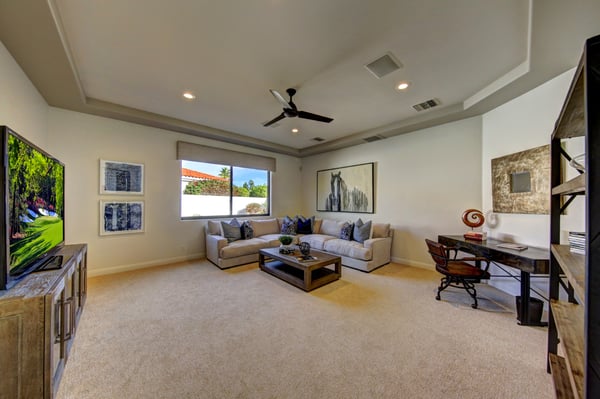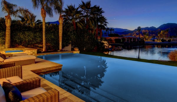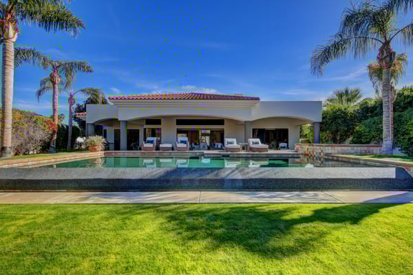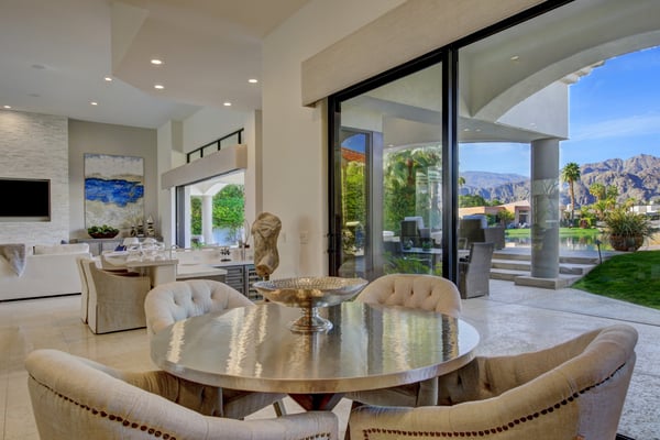 Villa Lago is the perfect Desert getaway for the discerning guest and offers the utmost in luxurious travel. Located behind the gates of the PGA West Stadium Course, an exclusive golf community in La Quinta, CA, this 4,636 sqft property boasts 4 bedroom suites, plus a large media room, 4.5 bathrooms, and comfortably accommodates up to 10 guests. With panoramic mountain views, lush fairways, and sophisticated modern design, this home is sure to impress. This remarkable estate welcomes guests through a private gated courtyard with a tranquil water feature leading to the custom 9ft glass entry doors. Walk into the open concept great room featuring a modern stacked stone fireplace that reaches from floor to ceiling with a large HDTV, fireplace, elegant design and awe-inspiring mountain views that are highlighted by the indoor/outdoor living space created by the disappearing glass wall. Looking to wind down after a long day of golf? Enjoy cocktails and conversations at the fully-equipped wet bar with a wine fridge and barstools just off the living room. This luxurious desert lifestyle continues as you enter the fully-equipped and remodeled chef’s kitchen. The stainless-steel appliances, double oven and oversized center island offers the perfect space for everyone to help create an amazing meal together, or to gather around socializing while sharing appetizers. There are ample seating options as well between the wrap-around breakfast bar, casual kitchen table and formal dining area with an elegant chandelier seats eight guests. While the interior of Villa Lago is beautifully appointed, the grounds are perfectly maintained and feature striking views of the purple mountains in the distance. The large, private pool features a raised hot tub and sleek infinity edge overlooking the serene lake. There are plenty of lounge chairs and sofa seating to enjoy the view or share a glass of wine. After another amazing day in the California Desert, grill up some steaks at the built-in BBQ island and enjoy your meal al fresco at the outdoor dining table that seamlessly opens to the main living area of the home. Permit #: 065943