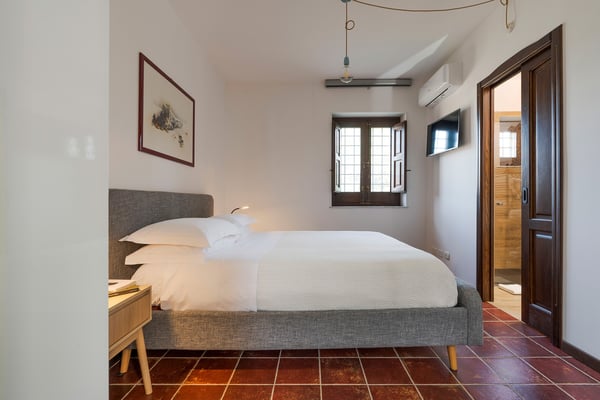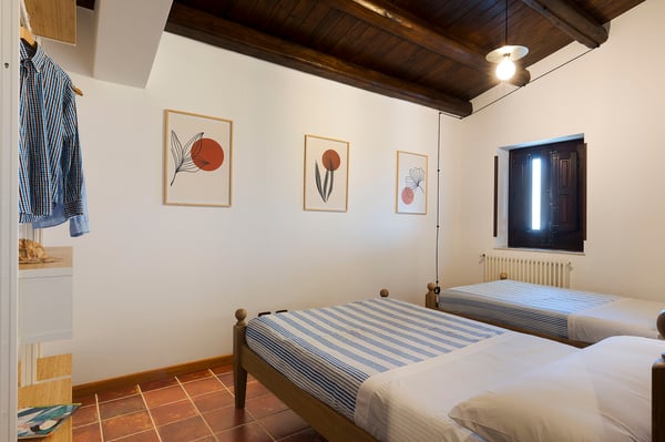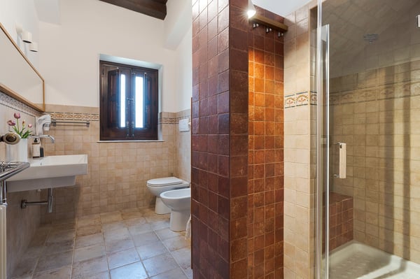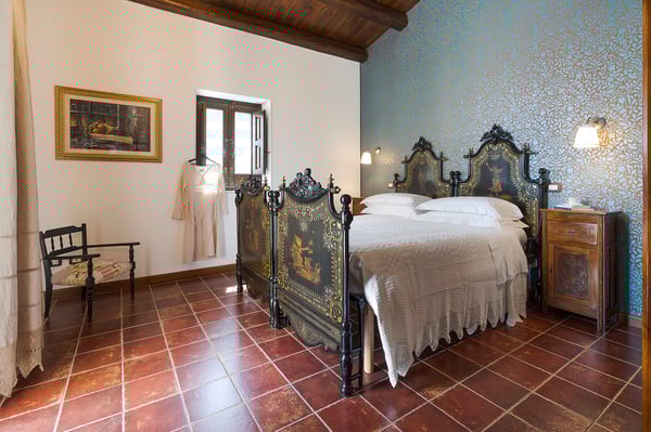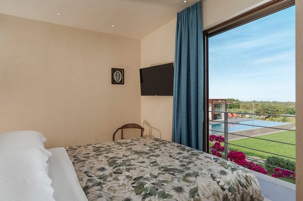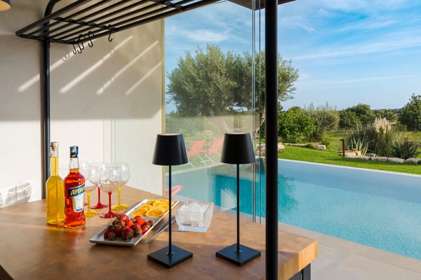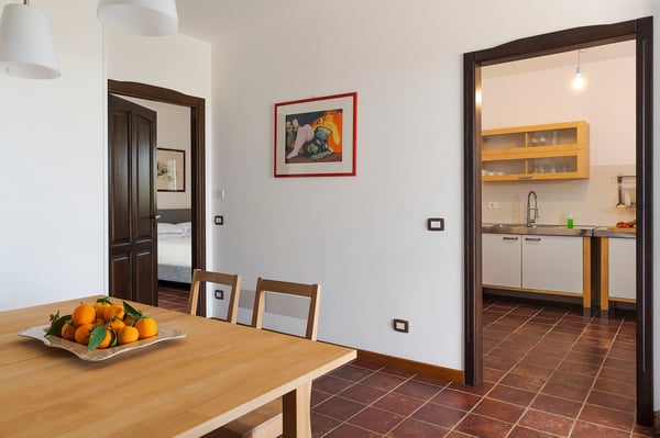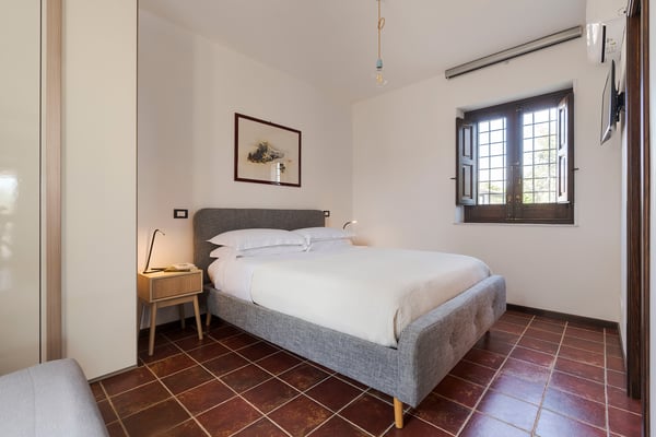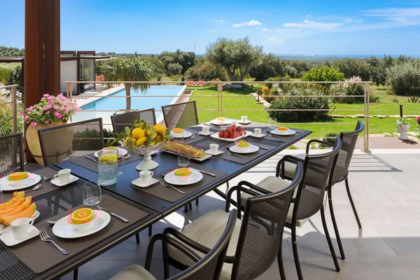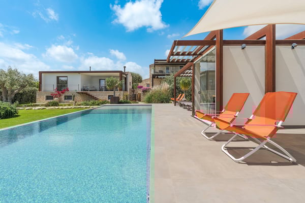 Corte Antigua is an exclusive residence with swimming pool located in south-eastern Sicily near Rosolini, a short distance from Modica and Noto. The villa is surrounded by expansive, well-equipped outdoor spaces and lush garden with lawn that features a generous private swimming pool (5x15 metres) with solarium and bar area. The complex is located in a lovely rural setting, consisting of two buildings facing the characteristic inner courtyard paved with local stone on one side and the garden with splendid infinity pool on the other. The main house features a living room, large living-kitchen area, a half bath and double bedroom with en suite bathroom with shower. The outbuilding is composed of two independent units. The first is on the ground floor and includes a living room with kitchen, a double bedroom plus bathroom with shower and a terrace with pergola. The second, split across two levels, includes two double bedrooms paired with two bathrooms with shower, then on the upper floor, a double bedroom, a twin bedroom, a bathroom with shower, a small living area and a panoramic terrace with pergola. These cosy interiors can comfortably accommodate up to twelve people and are equipped with the best comforts: air-conditioning in all rooms, Wi-Fi Internet, 4 TVs, washing machine and dryer, dishwasher, electric and microwave oven, espresso and American coffee machine, barbecue, outdoor shower and private parking. Corte Antigua is the perfect solution for those seeking independent spaces without sacrificing conviviality, but also an excellent base for easy access by car to Syracuse and the baroque towns of Val di Noto, the beaches of Calamosche, San Lorenzo and Santa Maria del Focallo, the Vendicari Nature Reserve and the seaside villages of Marzamemi and Portopalo di Capo Passero.