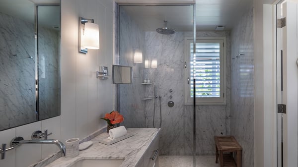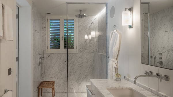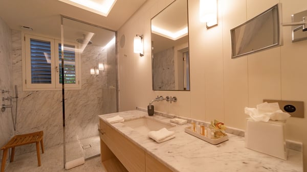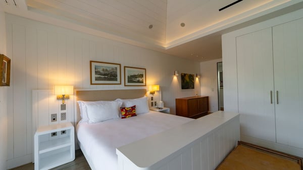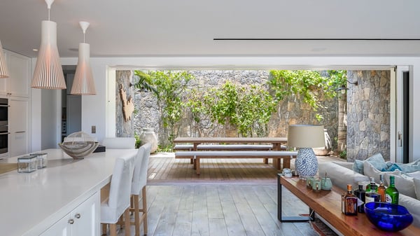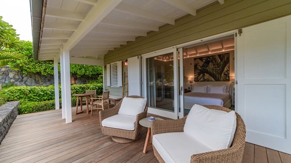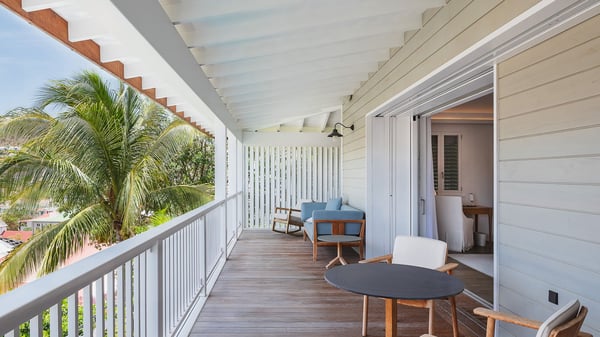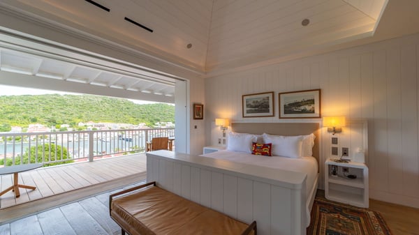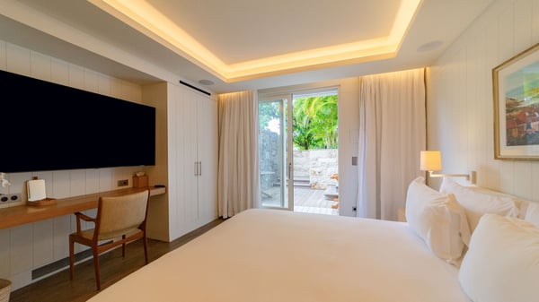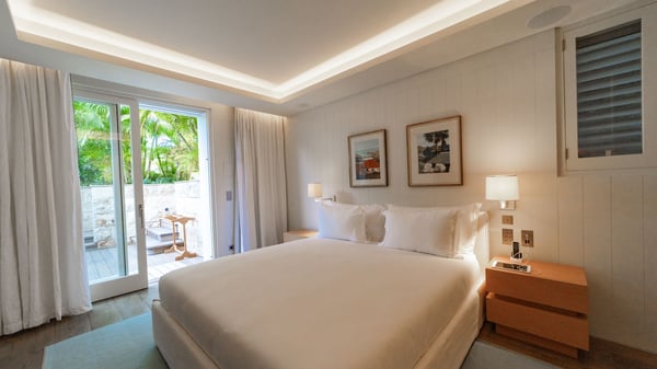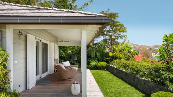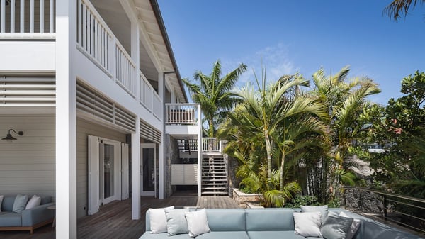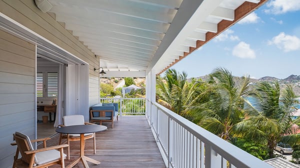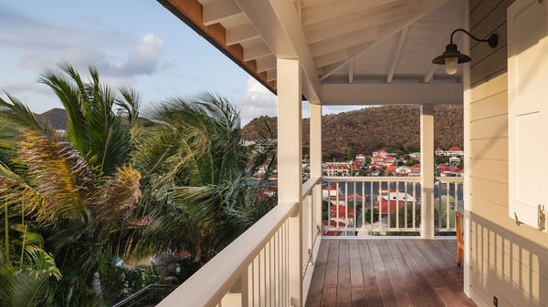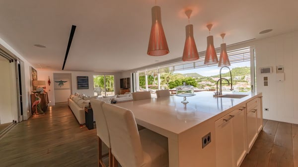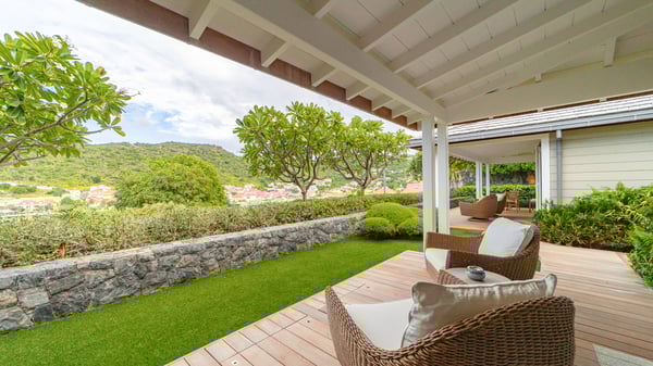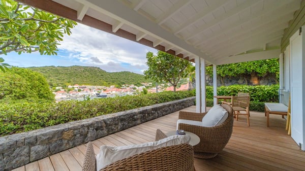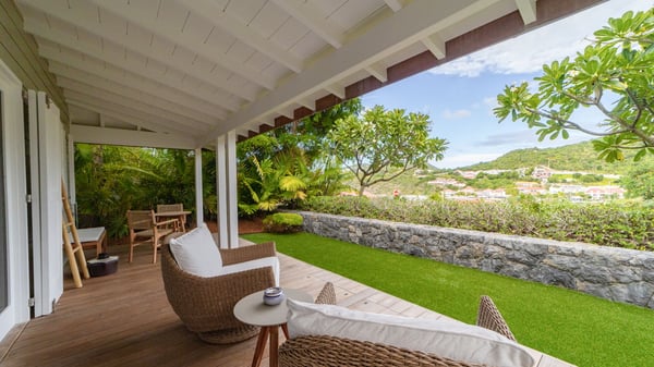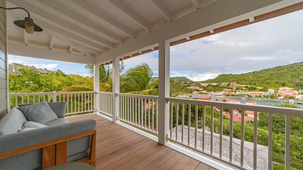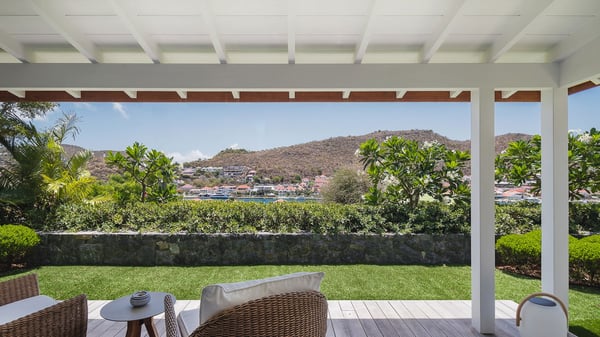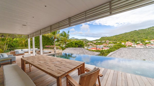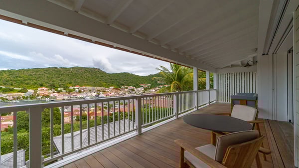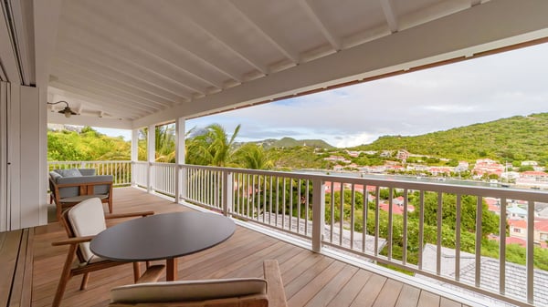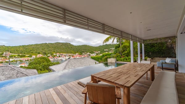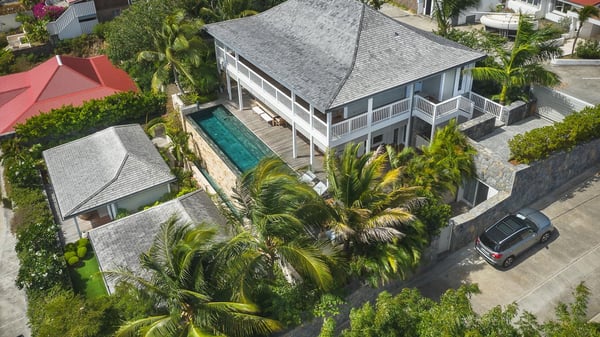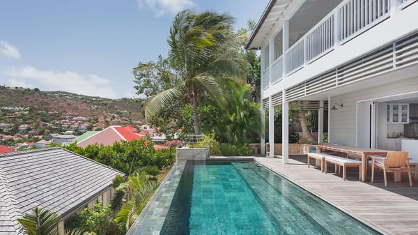 Ideally situated in Gustavia, the vacation rental St-Barths Kreola is a superb five-bedroom property boasting a heated swimming pool. Close to the vibrant island life and the lively harbour, this vacation home for ten people offers a luxurious layout and expansive spaces for an unforgettable stay amidst the natural beauty of St-Barths. Built across multiple levels and buildings, the rental villa St-Barths Kreola welcomes you into its bright and refined environment. Its spacious, air-conditioned living room features a comfortable lounge with plush sofas, soft armchairs, and lovely cushions, opening onto the pool terrace at the front and onto a refreshing, poetic terrace at the back. The fully equipped kitchen includes a central island with stools, the perfect place to quietly talk over a morning coffee. With its striking, elegant white decor, the vacation rental St-Barths Kreola welcomes you to a luxurious and private haven of peace. At the front, villa Kreola's terrace opens onto a magnificent view over the lively harbour. The heated swimming pool invites you for delightful moments of relaxation under the bright Caribbean sun. Sun loungers are at your disposal on the deck, alongside a charming outdoor lounge area with a square light wood coffee table; also the perfect spot to sip an evening cocktail. Then, under the covered part of the terrace, the al fresco dining area is set for meals in the mild tropical air; you can also choose to dine at the dining area with benches on the back terrace, enjoying the pleasant intimacy of this cocoon of well-being. The holiday rental Kreola consists of five air-conditioned bedrooms spread throughout the property. All are furnished with Euro king beds and feature en-suite bathrooms with showers. Three of them are in separate bungalows, two of which are at the front and the other one to the side of the main building, while the other two bedrooms are on the upper floor of the main building. All bedrooms offer a private terrace, ideal for relaxing in the fantastic Caribbean climate. At the heart of the island's vibrant life, the rental Villa Kreola is the dream destination for an exceptional 10-person vacation in St-Barths with family or friends.