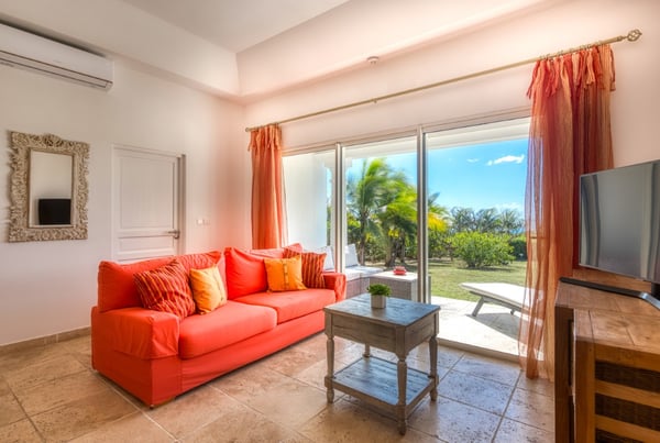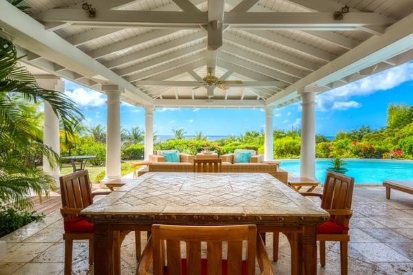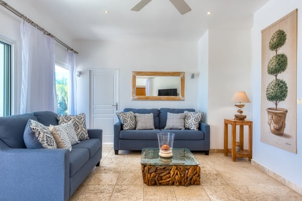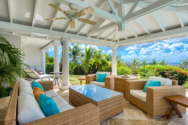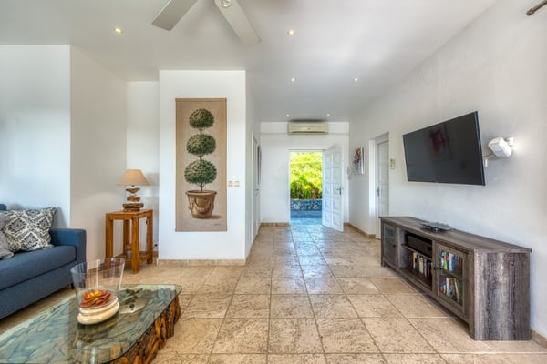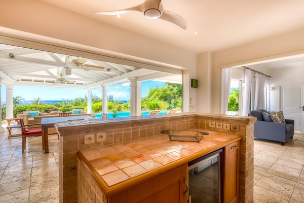 This very pretty villa is private and cozy yet light and airy. The charming courtyard entrance sets the stage for a stunning view that captures your eye the moment you enter the villa. Beautiful tropical trees and colorful shrubs frame the panoramic sapphire sea. From morning to sunset, it is mesmerizing and very romantic. French for honeymoon, Lune de Miel is a perfect place for couples seeking a quiet retreat or good friends on a getaway. Every room has expansive windows that take advantage of the amazing outdoor spaces and views. The interior-to-exterior flow is seamless, visually connected by beautiful travertine floors. The open-plan great room is a comfortable contemporary space that mixes modern style with traditional touches. Soft browns, taupe, and pops of papaya orange are accented with driftwood, teak, painted surfaces, and tile tops. The interior breezes are complemented by overhead fans. The charming, well-equipped kitchen in soft stone tiles, painted teak, and soft corals opens to the living space and the outdoors. Eat at the kitchen counter or on the outdoor covered loggia off the pool. Spacious outdoor terraces feature a lounging area with oversized weather-resistant wicker sofas and comfortable al fresco dining areas. Contemporary chaises, surrounding the stunning tiled pool, face the sea and gardens. Two large bedrooms feel very private; one connected directly to the interior and one set off the terrace. Both have fabulous sea views and spa-style travertine and teak bathrooms; one with a private outdoor shower and one that opens to the sea view. The bedroom off the living space is a serene oasis in cream and brown, accented with touches of blue. Just off the pool, you can take a morning dip straight from your room. Set off the terrace, the second bedroom, with sea and garden views, has a semi-private sitting area. A poster bed and comfortable interior seating area have a romantic, contemporary feel in soft creams, browns, and deep oranges. The Lowlands are the location of some spectacular beaches: Baie Longue and Baie aux Prunes (Long Beach and Plum Beach) are secluded, have public parking, but no services. Neither beach is ever crowded. Baie Rouge is set amongst some dramatic red cliffs. The elegant homes in Terres Basses are sitting on generous lots, most of them with gorgeous views of either the Lagoon or the ocean, or both. By car it's about 10 minutes away from Marigot, and 15 minutes away from the Airport.