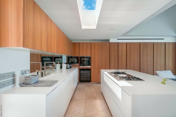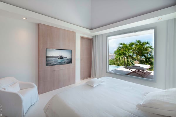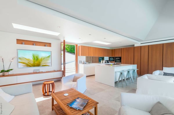 Modern, Palm is located in Grand Cul de Sac not far from the beach and the restaurants. This two bedroom villa offers a nice view over the ocean and the shades of blue. Very well equipped, this villa is perfect for a stay with friends or a family with kids. The two similar bedrooms are located on each side of the living room. You will enjoy the outside gazebo and the heated pool.