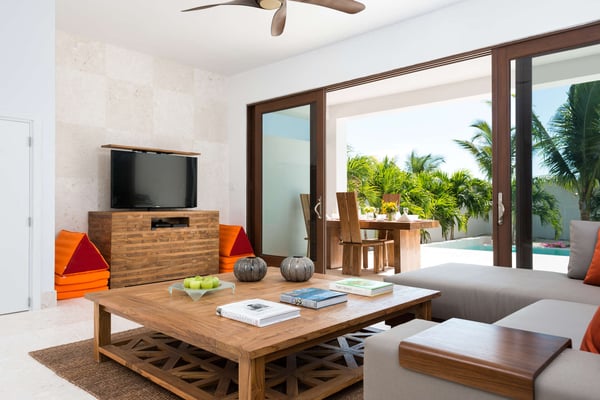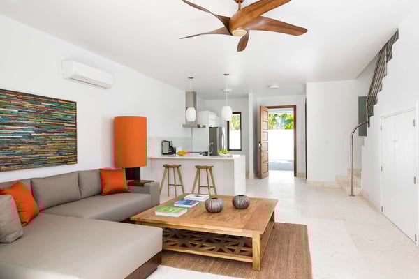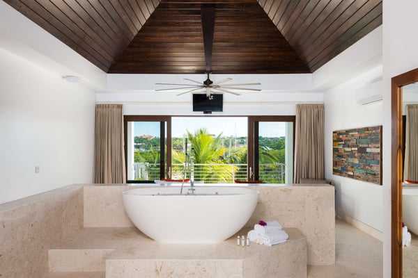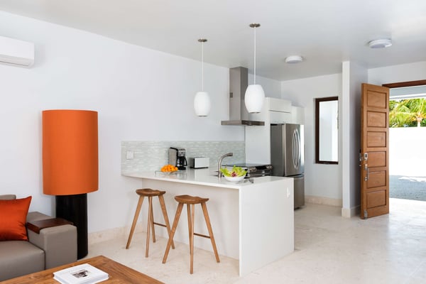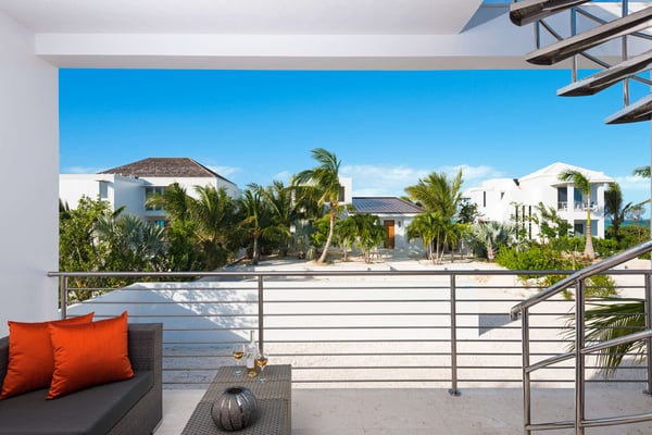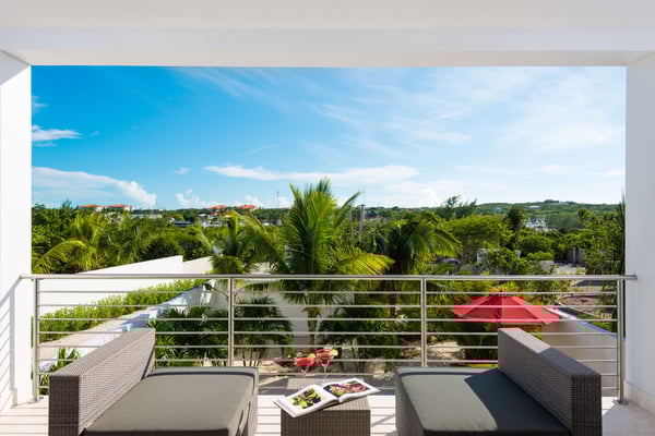 Conceived for couples seeking sunshine and seclusion, Sugar Kube is the sweetest one-bedroom retreat. Only a stone’s throw from the beach and within walking distance of several restaurants, this contemporary villa has everything a couple needs for an intimate escape. Sugar Kube’s outdoor space is a true oasis, totally enclosed for complete privacy, with swaying palms that provide a dappled shade, a sparkling pool, and a king-size daybed that invites you to lounge in comfort. A covered terrace beyond the living room is equipped with a barbecue and dining area, so that you can both eat and cook outdoors. As the sun goes down, make your way up to the rooftop observation deck and savour 360 views of the marina and the turquoise sea. Polished coral stone floors, hardwood ceilings, and wall-to-wall glass doors create an inviting tropical modern style indoors that is elevated by bright accent colours and Balinese furnishings. The simple layout features an open plan kitchen and living room that opens directly onto the courtyard garden downstairs and a bedroom and bathroom above. The kitchen space, which is separated from the living area by a breakfast bar, is equipped with all the essentials for whipping up a meal and a large L-shaped sofa provides ample room to stretch out and watch a movie. Upstairs, the pitched, hardwood ceiling over the king-size bed adds a sense of grandeur, while the deep soaking tub and separate shower are pure indulgence. Balconies on either side invite the outdoors in, and a staircase leads up to the intimate ocean view rooftop terrace.