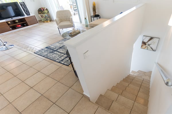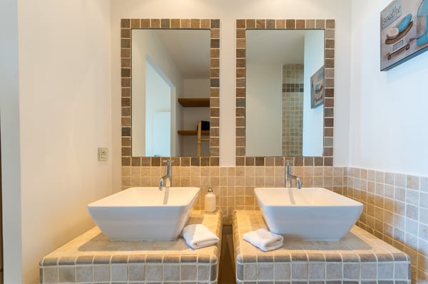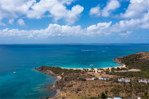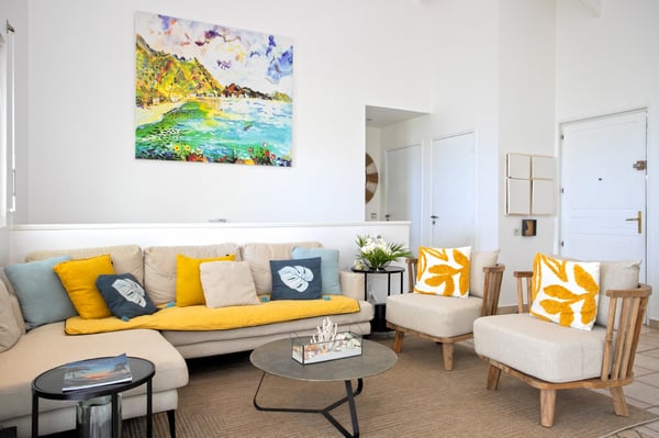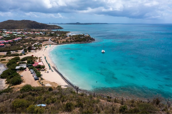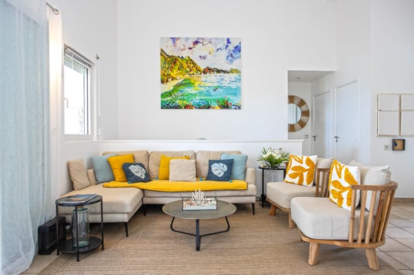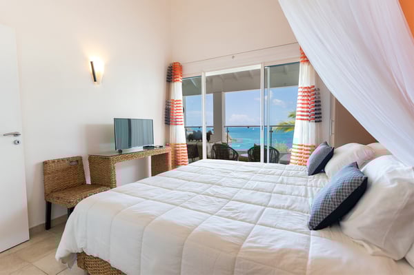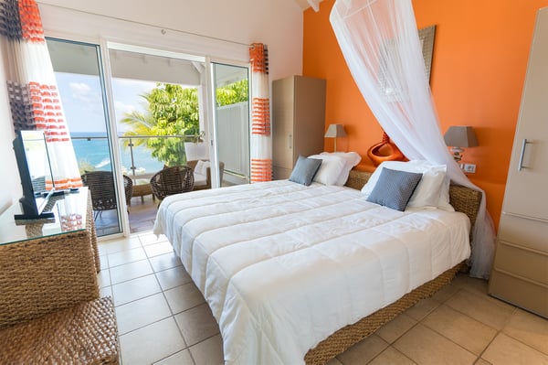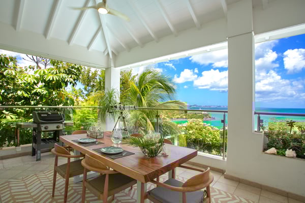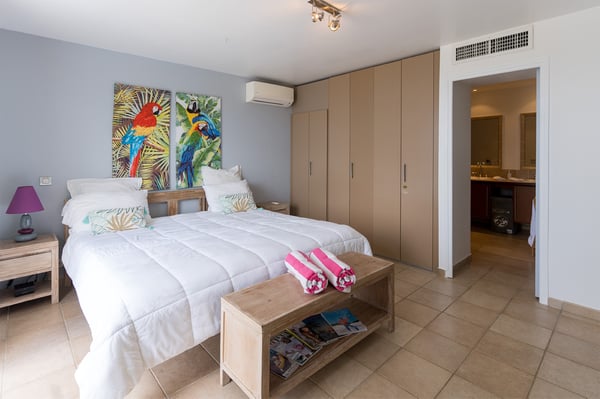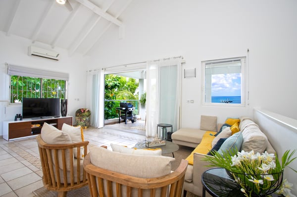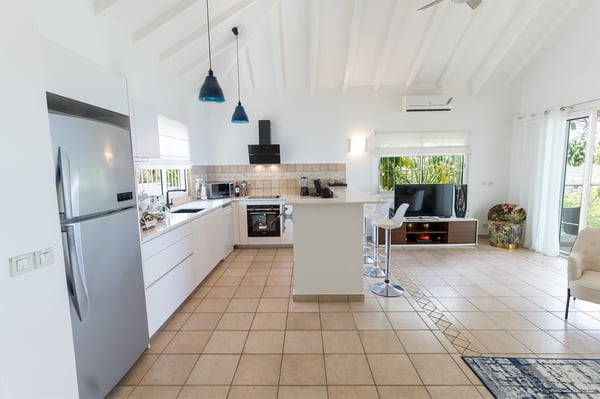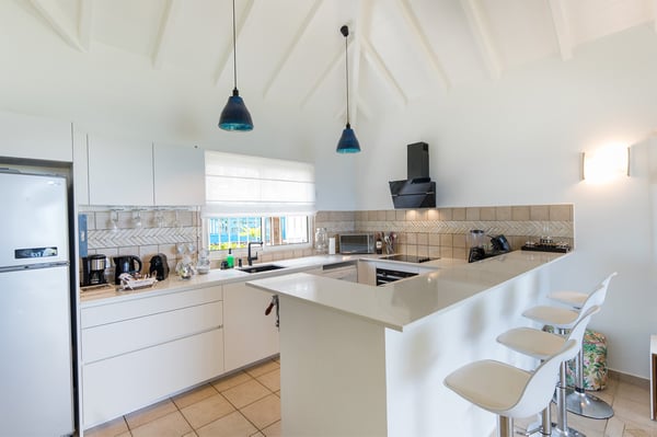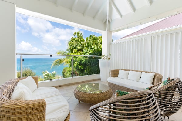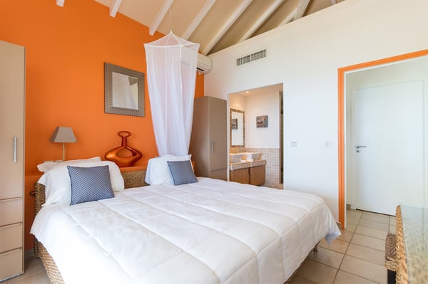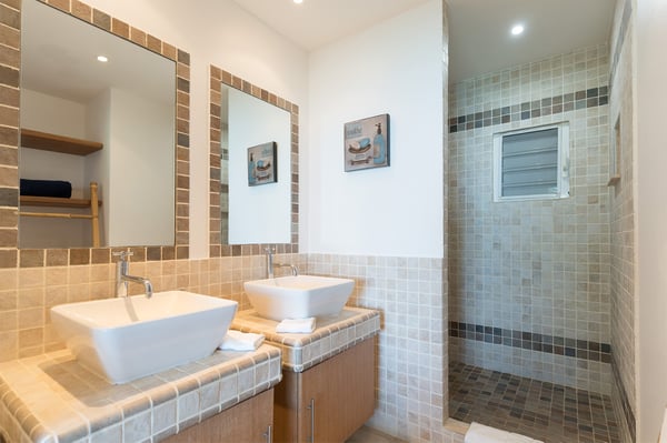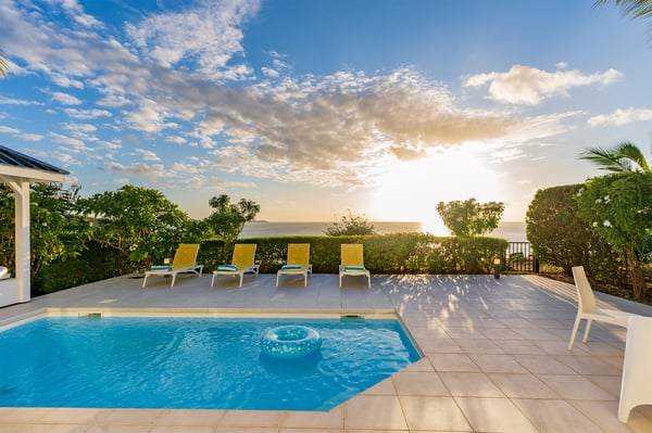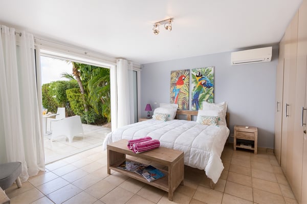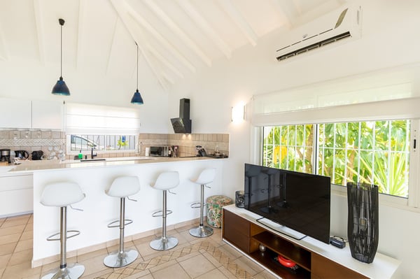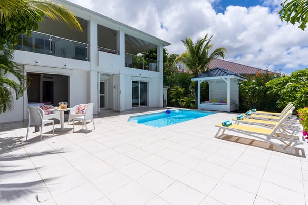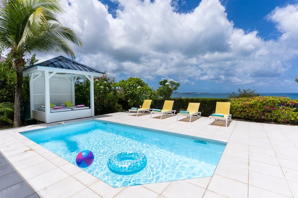 Located in the scenic neighborhood of Happy Bay in French Saint Martin, Blue Sailing sits on the hillside with a superb vista of the Caribbean, the popular beach of Friar’s Bay and its promontory on one side, and the beautiful, pristine beach of Happy Bay below. This lovely two-story home offers three equal bedrooms, three bathrooms, a private pool, and a spacious upper-floor terrace overlooking the sea. Built into the hillside, the main entrance opens into the upper level comprising a stylish open-plan kitchen with a breakfast bar, a living/dining area, and a spacious covered terrace running the length of the house. The views from the terrace are stunning of the sea, and the westerly orientation offers beautiful sunsets that can be fully appreciated from the covered outdoor lounge and dining area. Below, the ground floor has a sunny deck area around the pool with chic yellow loungers and a poolside gazebo with double daybeds for relaxing in the shade. The deck is bordered with lush tropical foliage and a neat hedge in front that perfectly frames the azure view of the sea. The bedrooms feature color schemes of sky blue, eau de nil, and warm orange with king-size beds, and each bedroom has a TV and its own bathroom with an open shower and his and her sinks. Two bedrooms are situated on the lower level and directly access the pool terrace, and the third is housed on the upper entrance level. Blue Sailing is within walking distance to both Friar’s Bay with its two popular beach restaurants, and the natural scenic beauty of Happy Bay. A short car ride brings you to the village of Grand Case and its beachfront gourmet restaurants, and the popular beach of Orient Bay is just a 15-minute drive away. Please note that at the beginning of March each year, there is an Electronic Music Festival on Happy Bay beach. There will be loud noise pollution during this time. Check the dates of the festival prior to booking if this is not something you're looking for in your vacation experience.