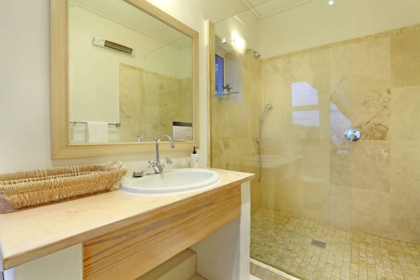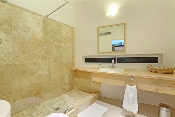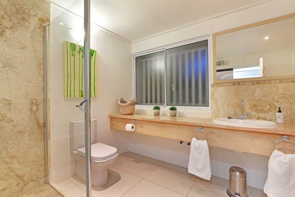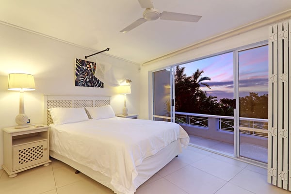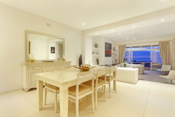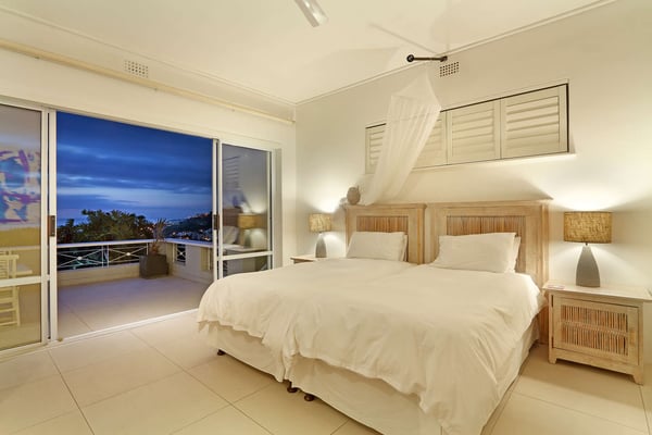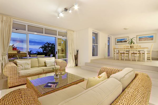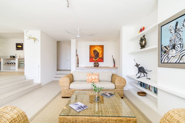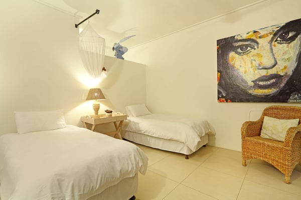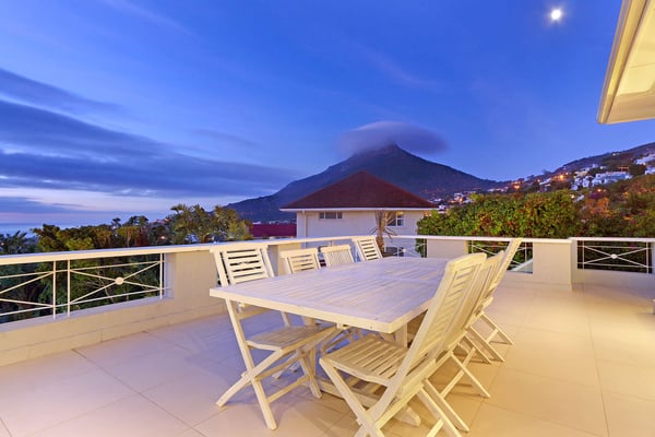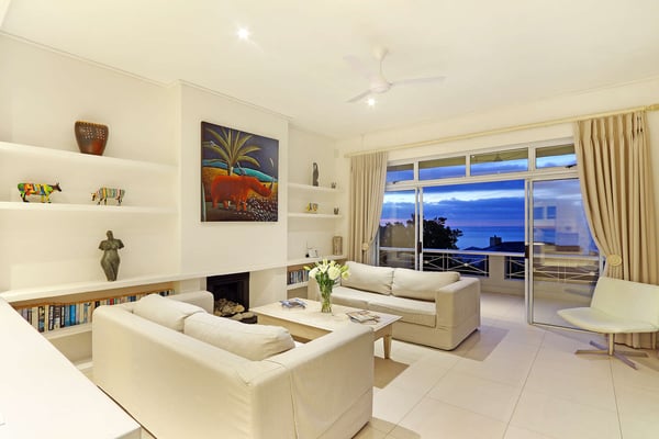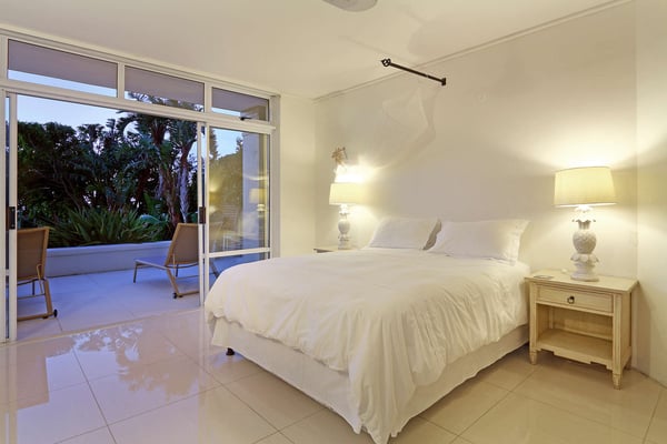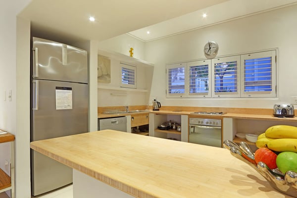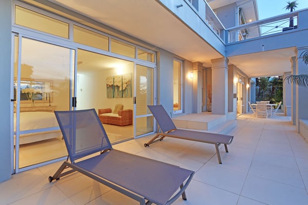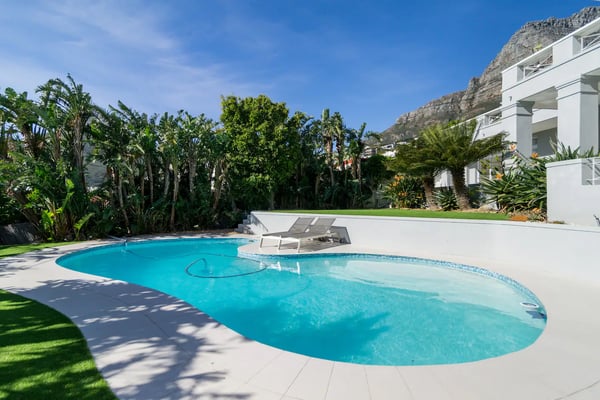 Msangasanga is spread out over two levels, each boasting its own kitchen, dining area and living room with access to an outside terrace. This feature makes it the perfect self-catering accommodation for a group travelling together or a large family. Summer in Camps Bay is all about outdoor living so the ample upstairs and downstairs terraces, large private garden and swimming pool make Msangasanga the ideal choice for a summer stay in Camps Bay. Natural sunlight floods the whole house, giving it a beautifully warm summer feel. The décor is neutral, fresh and white, adding to the ambience of space and tranquillity. On the first floor, you'll find three large comfortable bedrooms (all with fans) and three bathrooms (two of which are en-suite). Each bedroom has glass sliding doors opening onto the terrace with views of the Atlantic Ocean. The upstairs living area offers guests a comfortable lounge, dining room and fully equipped kitchen. These areas flow onto the large outdoor terrace. Here guests can enjoy alfresco meals overlooking the garden, an evening dip in the swimming pool and sea views. The ground floor has two bedrooms (each with an en-suite bathroom) and an open-plan living area with another fully equipped kitchen. Again, each room leads onto the front patio, lush gardens and the private swimming pool.