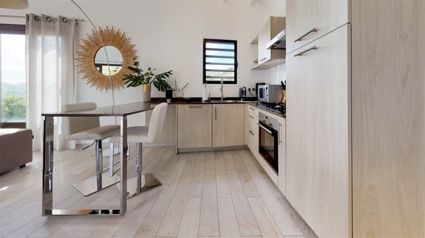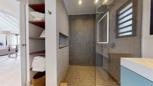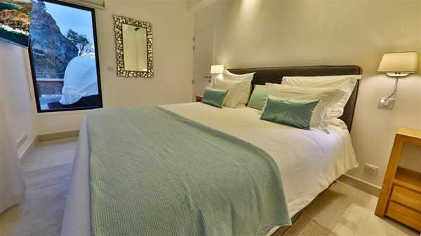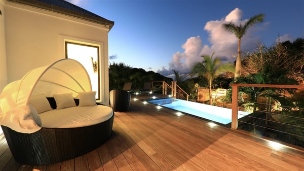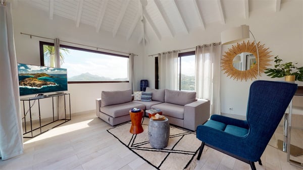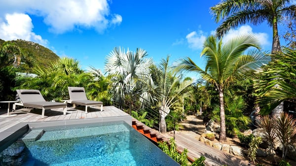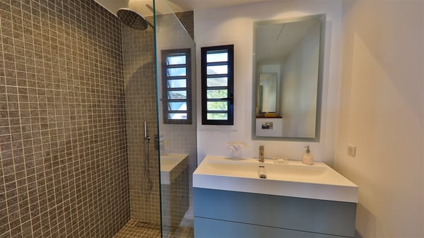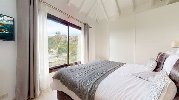 Nestled on a hillside above Anse des Cayes, the vacation rental Cozy Amancaya is a charming new property adjacent to Villa Amancaya. In a warm and cozy atmosphere, it is an ideal place for a couple or a small family wishing to stay in St. Barths. Villa Cozy Amancaya is a both contemporary and Caribbean-styled vacation home. As soon as you enter, the spacious living room furnished with an L-shaped sofa and nice coffee tables welcomes you in a very cozy atmosphere, with a breathtaking view over the Caribbean Sea that can be enjoyed through the large windows. Next to the living room, there is the modern, clean and stylish kitchen, equipped with the best appliances to cook delicious meals. Under the high mansard ceilings, the volume creates a pleasant feeling of space and comfort. A barbecue is also available for grilling under the starry sky. Outside, the scenery is idyllic, like a true haven of peace. There is a beautiful infinity swimming pool in the tropical garden of the house. Sun loungers are all around it in the mild Saint-Barths’ air, close to the palm trees and cacti. You’ll also enjoy dining alfresco around the table with benches covered with cushions set up under a shade cloth. The vacation home Cozy Amancaya welcomes you in two beautiful air-conditioned bedrooms opening onto the swimming pool or the patio. They are cozy and comfortable in a very warm atmosphere. The large and comfortable king size are well-equipped with soft covers and fresh linens in a soothing decor. For utmost comfort, each bedroom has its own en-suite bathroom with a stylish shower, a large mirror and closet storage. Very private and nestled in a lush environment, the luxury villa Cozy Amancaya is the perfect place for a dream vacation in St. Barts.