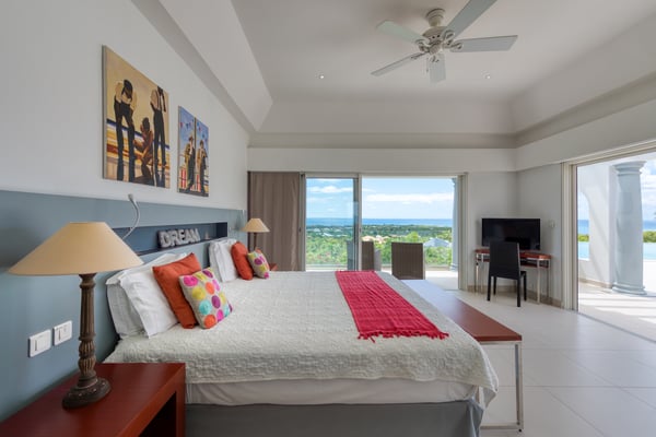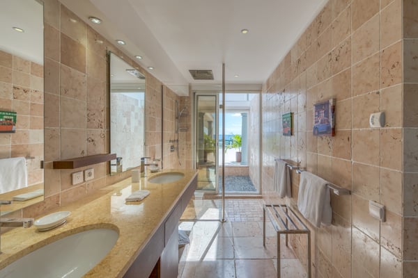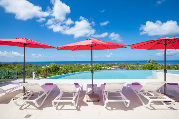 Lush gardens are filled with the fragrance of jasmine, colorful allemande, and vivid bougainvillea anchored with magnificent palms. The covered walkway is flanked on either side with small pools planted with tropical water foliage. Enter the double door and the panoramic 360 view spreads before you like a dramatic mural. Dining and lounging areas are strategically positioned to observe the view -the stunning infinity pool coils like a nautilus shell into an infinity jet tub. A modern gourmet kitchen opens to the view, connecting the chef with the guests. The three bedrooms are equal in size, spacious, and comfortable. Each room has private indoor and outdoor seating. The spa bathrooms are stunning in tumbled travertine, Indonesian river rocks, and sleek fixtures. Walk-in showers flow into outdoor showers with sea views. Villa Just in Paradise is your dream house for your next stay in St Martin with family or among friends that can be rented as a one, two, or three bedroom villa!