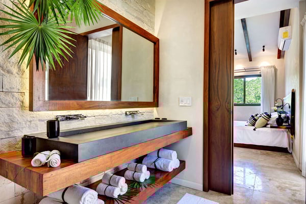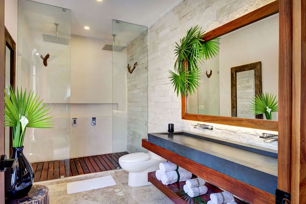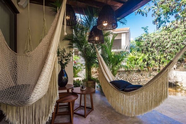 Casa Cenote is a beautiful and distinct five-bedroom home located in the very quaint gated community of Puerto Aventuras. Just steps away from the beautiful and tranquil Marina, Casa Cenote is also located on the third hole of the nine-hole golf course. While not beachfront, you are within walking distance from the beautiful beach and also walking distance from aquatic adventures such as Catamaran experiences, spearfishing and sport fishing excursions. Casa Cenote receives its name by being built around a cenote, a Mayan word for sinkhole. The villa has an intricate freshwater system streaming beneath the property and we wanted to highlight this natural phenomena and make it the centerpiece of this beautiful home. Featuring five bedrooms and four bathrooms, Casa Cenote can comfortably sleep 12 guests. Two bedrooms are located on the ground level, each with their own bathroom and three of the remaining bedrooms are located on the upper level, the primary suite having it's own en suite master bathroom, and the other two bedrooms sharing his and her bathroom. The villa prides itself on the exterior common areas of this property which feature a breezy rooftop terrace with a bar overlooking the marina and jungle, and palapa space for more lounging or more collective group activities such as yoga and meditation or spa services. On the ground level by the pool you will also be able to enjoy basking in the sun by day or evening barbecue get-together around a firepit. Casa Cenote is a remarkable luxury home well suited for families with kids or couples or even groups of friends looking for a quiet, tranquil getaway.