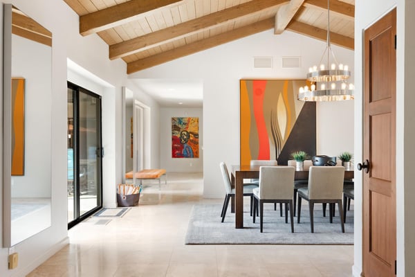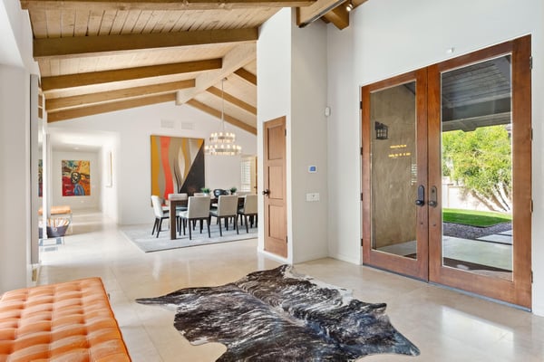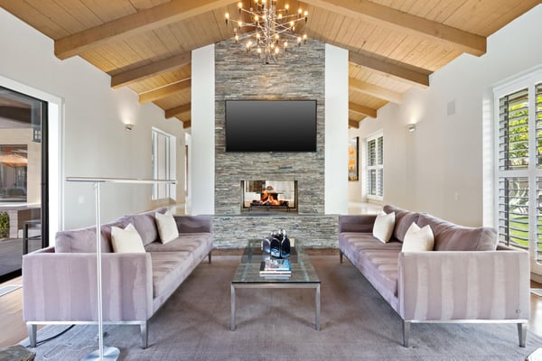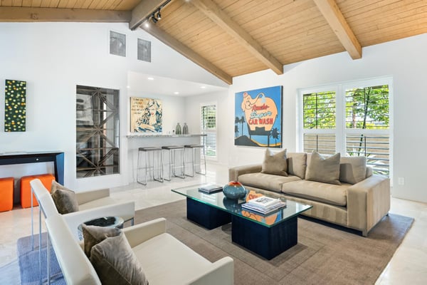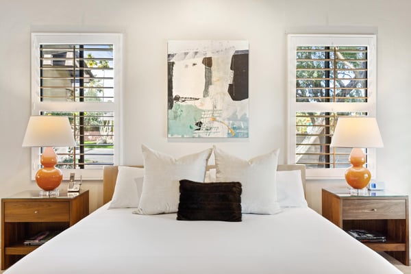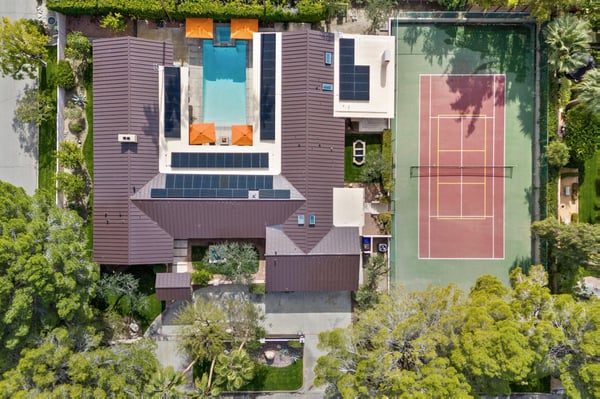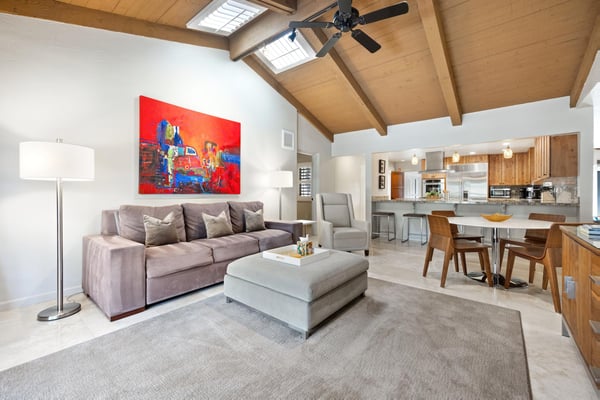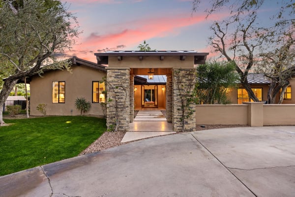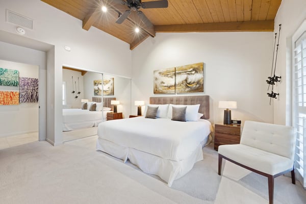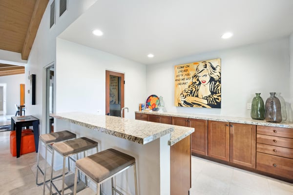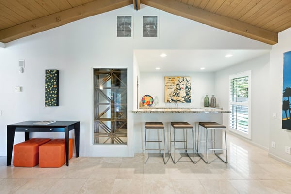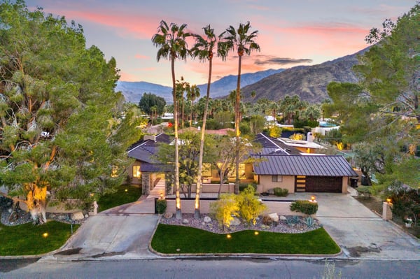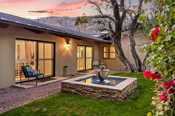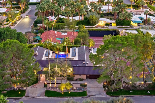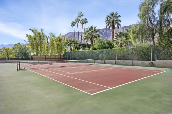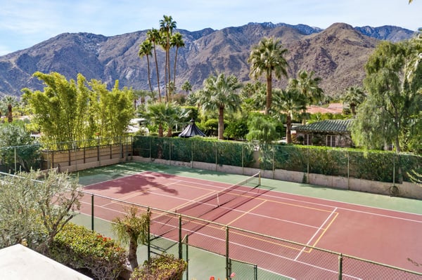 Located on a two third acre corner lot in the heart of Las Palmas, this four bedroom features 4,960 square feet of living space in its 'U' shaped floor plan. On the western side of the property is a private hard surface tennis court. The primary suite features a custom California king bed, with large sliding glass doors facing the pool to the east. Its en suite bath is a true spa experience, with a free-standing jetted tub, stacked stone fireplace, and separate water closet with bidet. A sliding glass door opens onto a semi-private patio with western facing mountain views. The remaining bedrooms are located off the main entrance and offer 40" HDTV's, each with en suite baths. A true desert retreat, Desert Solstice brings the indoor living to the pool patio, with an outdoor dining area, gas fire feature, and a rectangular pool with elevated spa and spillover. Extremely private, Desert Solstice is only a short drive to Downtown Palm Springs’ fine dining, art and culture. Permit #2087
