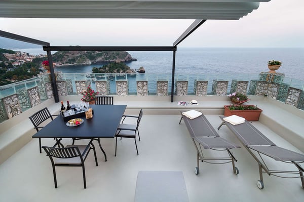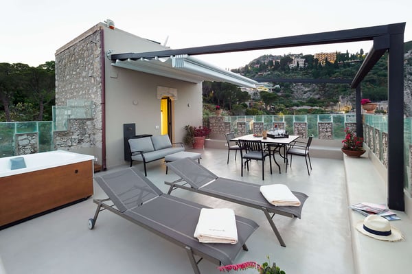 Unique and exclusive, Torre Isola Bella is a luxury property in Taormina. Located in a stunning panoramic location, this prestigious property boasts an amazing terrace with Jacuzzi and spectacular views of the bay of Isola Bella and the sea. This old tower, restored and converted into a charming apartment, spreads over three floors and is not suitable for families with children. On the entrance level, there are a large living/dining room with kitchenette and panoramic balcony, a single bedroom and a bathroom with shower. On the upper floor, in the loft, there are a double bedroom and a bathroom with shower. The third and last floor includes a further bathroom with shower and the sun terrace with Jacuzzi offering breathtaking coastal views. Exquisitely finished and furnished with authentic design pieces, the house comes with internet Wi-Fi, satellite TV, home sound system, air conditioning, washing machine and dryer. Situated along the road that from Taormina town centre leads to the sea, Torre Isola Bella is within walking distance of the beach and of the cable car up to the old town centre. Moreover the villages on the slopes of Mount Etna, the Alcantara gorges, the fishing villages on the Cyclops Riviera, Acireale and Catania are all a short drive away from the property. Further south are the charming baroque towns of Syracuse and Noto, the village of Marzamemi and the Vendicari nature reserve. CIN: IT083097C2MHYJV79V