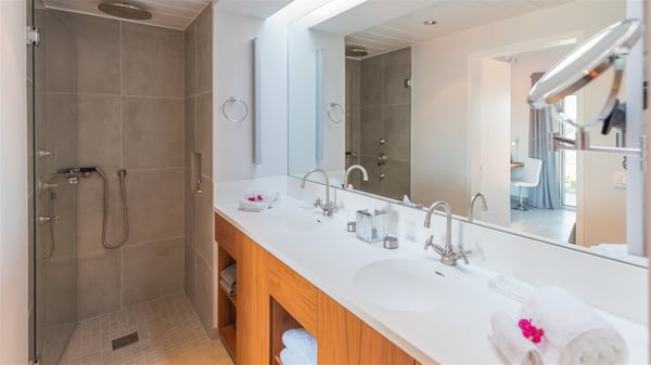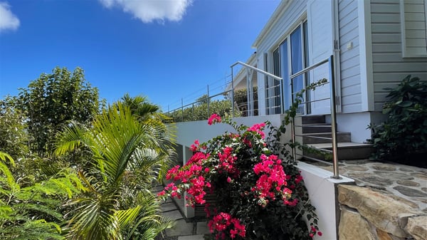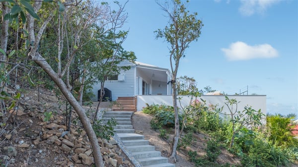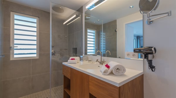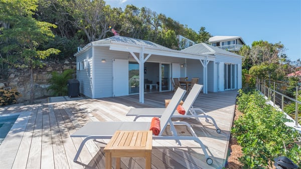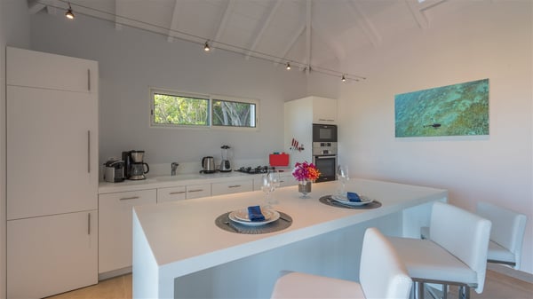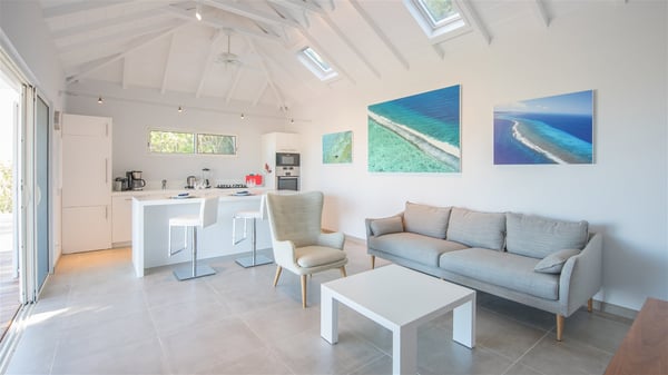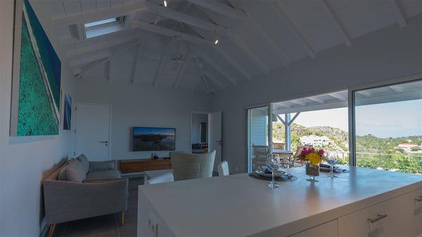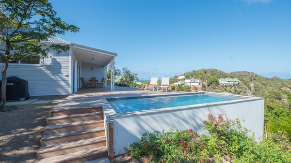 Located on the heights of Colombier, the vacation rental villa Ti Voyage is a charming two-bedroom property with a beautiful view over the hills and the deep blue ocean. Villa Ti Voyage is a most comfortable and well-equipped vacation home, a perfect spot for a family looking for a romantic place to stay in St Barths. Nestled in the green hills of St-Barths, this charming house is ideally located close to all amenities and near Flamands Beach. The living room opens onto the terrace and welcomes guests with a sofa and a bright-toned armchair facing a flat-screen TV. The fully-equipped kitchen is located in the same open-plan living area and features a pleasant and spacious breakfast bar, a perfect place to talk over a coffee or to enjoy delicious meals. Under the high vaulted and whitewashed ceiling, all is quiet in a lovely decor with maritime-inspired paintings. At the front of the villa, the terrace offers a magnificent view of the tropical environment and the horizon. Under the covered area, guests can enjoy al fresco dinners around the beautiful teak-made dining room. The swimming pool is equipped with an aqua bike and shines under the Caribbean sun, for pleasant moments of sport or relaxing sessions. Furnished with lounge chairs and small tables, this very private terrace is the perfect place to read, rest and enjoy the gentle trade winds. The vacation rental Ti Voyage is composed of two spacious and comfortable air-conditioned bedrooms. One of them has a king-size bed, and the second one has twin beds that can be converted into a king bed. The bedroom located on the upper level opens onto the wooden deck through large windows that allow the lush vegetation of St. Barths to shine through; the second bedroom is on the lower level and also opens onto a large deck, with access to the private parking for three cars. In the lush green environment, the vacation rental Ti Voyage offers a high level of services for an unforgettable stay in St-Barths, the pearl of the Caribbean.