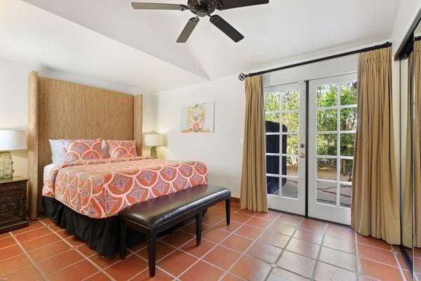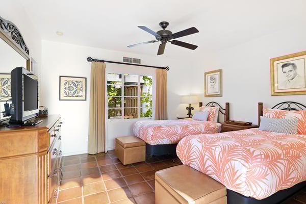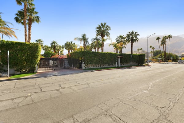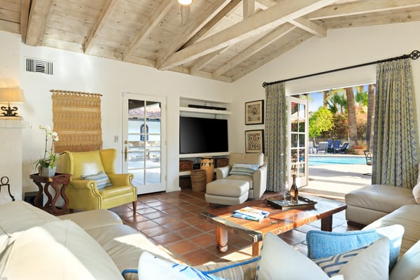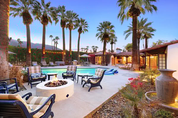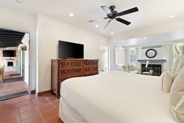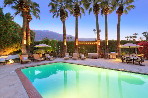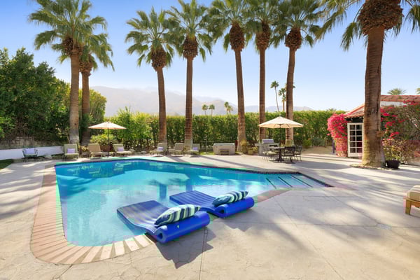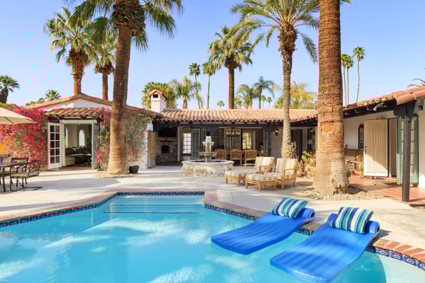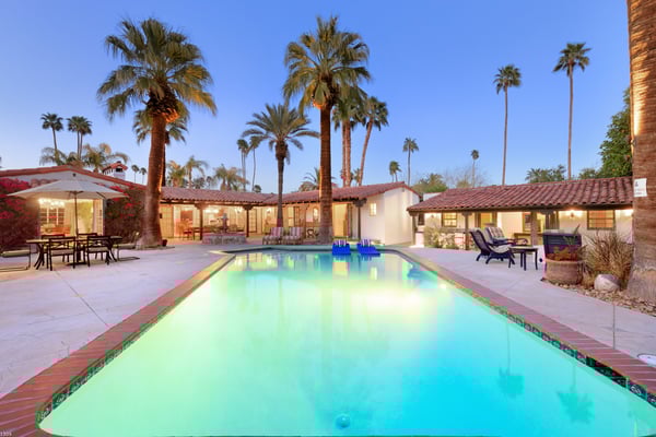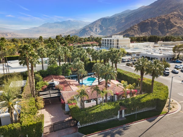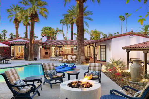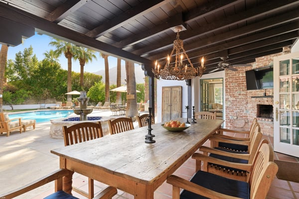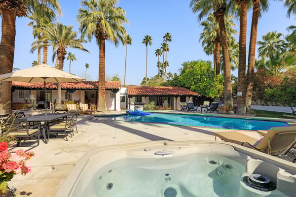 A sprawling, Spanish-style home with TerraCotta roofs and a guest casita, The Lucy House lies in the heart of downtown Palm Springs. Surrounded by a wrought-iron gate and 12-foot ficus tree wall, the five-bedroom home sits on manicured grounds lined with soaring palm trees. Luxuriate by the 35-foot pool on one of eight chaise lounge chairs, enjoy a cocktail by the fire pit, or take in mountain views from the above-ground spa. A formal, 10-seat dining table on the covered patio overlooks a European-style fountain for dinners with ambience, while a separate 6-seat table on the pool deck offers a sunny option for brunch. An outdoor kitchen with two natural gas BBQ grills will inspire outdoor cooking with views of distant mountains. The main house, styled in the decor of an elegant Spanish villa, boasts vaulted ceilings, tiled floors, and walls of picture windows. French doors throughout seamless flow between indoors and out. In the living room, lounge on one of three full-length sofas to enjoy the 55-inch HDTV, complete with cable, or cozy up to the gas fireplace on one of two charming armchairs. If you feel inspired, take advantage of natural sunlight at the writer’s desk to journal your thoughts or plan your next great adventure. Just beyond the living area, a custom, hardwood dining table seats 10 guests for the evenings when you prefer to dine in the comfort of air conditioning. The gourmet kitchen, located just off the dining area, boasts custom granite countertops, Wolf and Sub Zero appliances, and two dishwashers. Start your day with a cup of freshly brewed coffee from a traditional or Keurig coffee maker. Three sets of French doors open the kitchen to the covered back patio. Located in the heart of downtown Palm Springs in the famed Movie Colony neighborhood, The Lucy House offers a taste of the Old Hollywood lifestyle enjoyed by the stars who made it their home away from home. Walk to the El Mirador Hotel, Ruth Hardy Park, and dozens of restaurants, lounges, galleries and shops. With parking for five cars, you can also easily explore the surrounding area. Between its resort-style amenities, chic decor and celebrity history, The Lucy House offers a unique opportunity to experience the storied destination of Palm Springs just as Hollywood’s biggest stars once did. This home will consider events under 30 people. Permit #1309