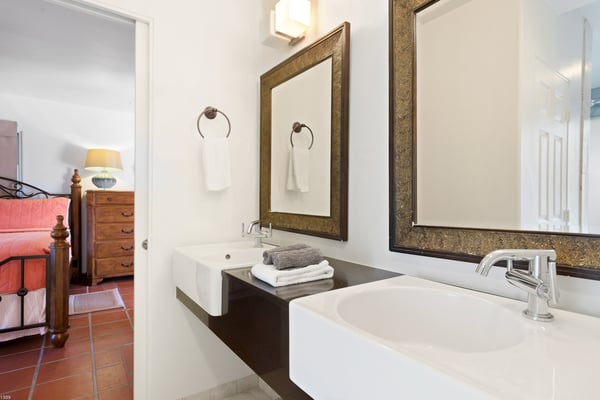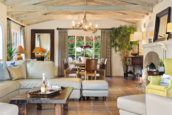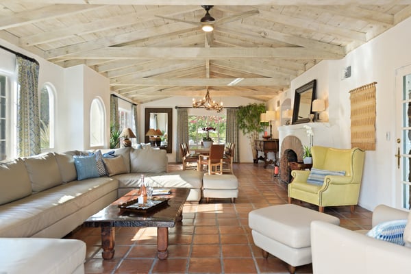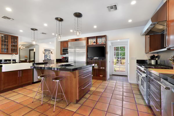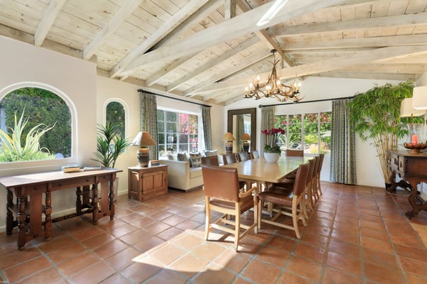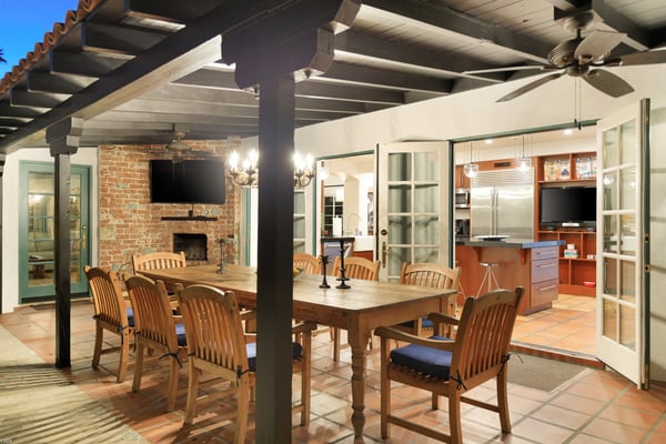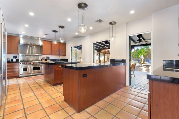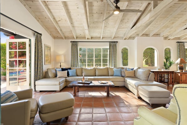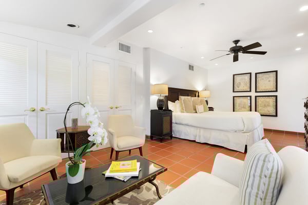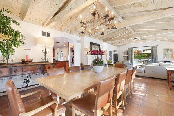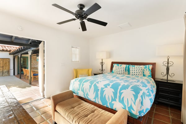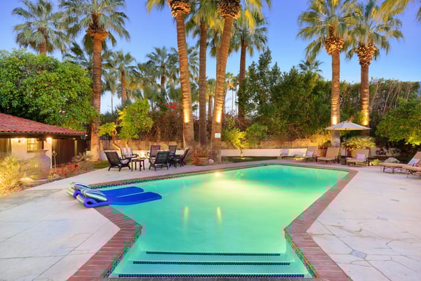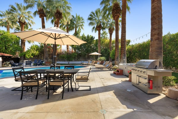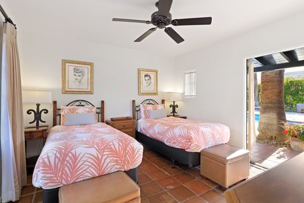A sprawling, Spanish-style home with TerraCotta roofs and a guest casita, The Lucy House lies in the heart of downtown Palm Springs. Surrounded by a wrought-iron gate and 12-foot ficus tree wall, the five-bedroom home sits on manicured grounds lined with soaring palm trees. Luxuriate by the 35-foot pool on one of eight chaise lounge chairs, enjoy a cocktail by the fire pit, or take in mountain views from the above-ground spa. A formal, 10-seat dining table on the covered patio overlooks a European-style fountain for dinners with ambience, while a separate 6-seat table on the pool deck offers a sunny option for brunch. An outdoor kitchen with two natural gas BBQ grills will inspire outdoor cooking with views of distant mountains. The main house, styled in the decor of an elegant Spanish villa, boasts vaulted ceilings, tiled floors, and walls of picture windows. French doors throughout seamless flow between indoors and out. In the living room, lounge on one of three full-length sofas to enjoy the 55-inch HDTV, complete with cable, or cozy up to the gas fireplace on one of two charming armchairs. If you feel inspired, take advantage of natural sunlight at the writer’s desk to journal your thoughts or plan your next great adventure. Just beyond the living area, a custom, hardwood dining table seats 10 guests for the evenings when you prefer to dine in the comfort of air conditioning. The gourmet kitchen, located just off the dining area, boasts custom granite countertops, Wolf and Sub Zero appliances, and two dishwashers. Start your day with a cup of freshly brewed coffee from a traditional or Keurig coffee maker. Three sets of French doors open the kitchen to the covered back patio. Located in the heart of downtown Palm Springs in the famed Movie Colony neighborhood, The Lucy House offers a taste of the Old Hollywood lifestyle enjoyed by the stars who made it their home away from home. Walk to the El Mirador Hotel, Ruth Hardy Park, and dozens of restaurants, lounges, galleries and shops. With parking for five cars, you can also easily explore the surrounding area. Between its resort-style amenities, chic decor and celebrity history, The Lucy House offers a unique opportunity to experience the storied destination of Palm Springs just as Hollywood’s biggest stars once did. This home will consider events under 30 people. Permit #1309