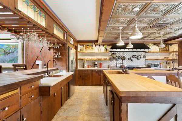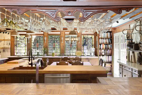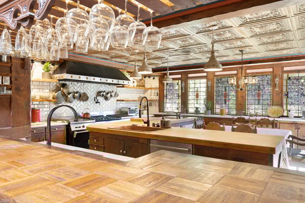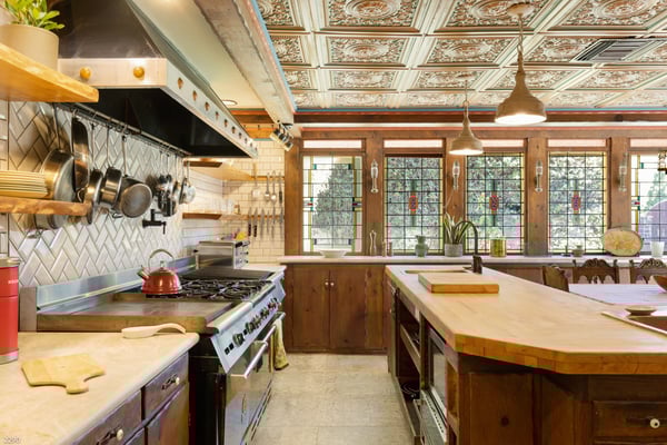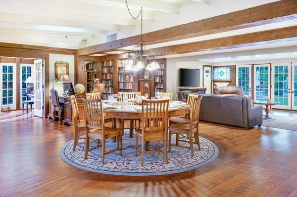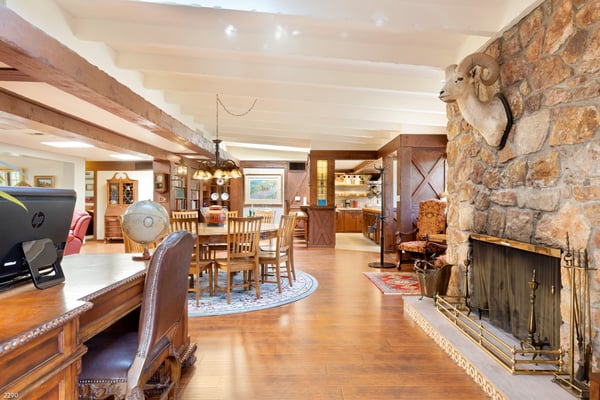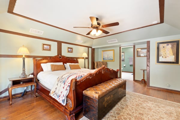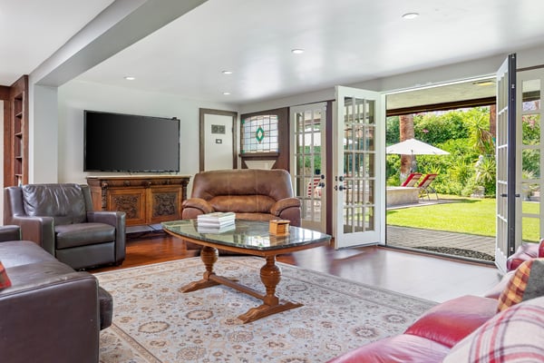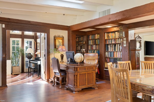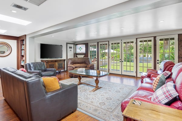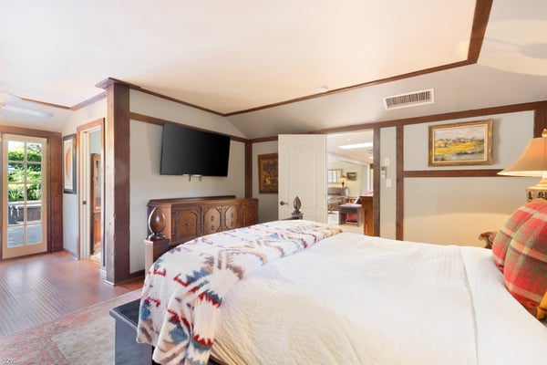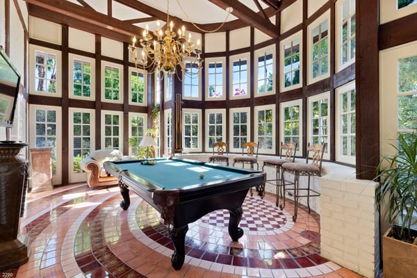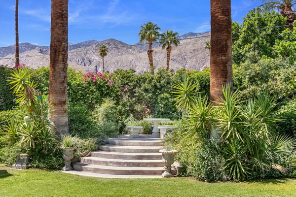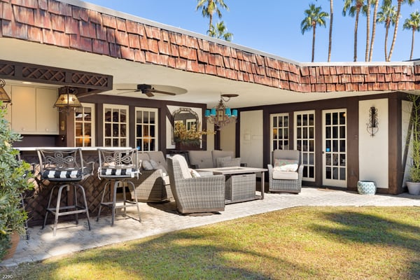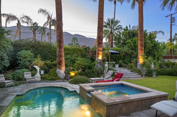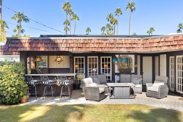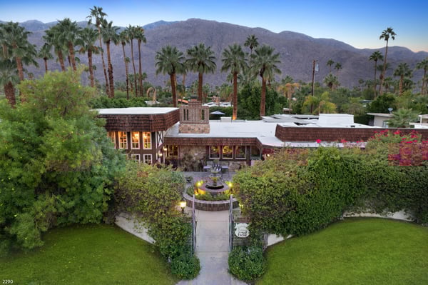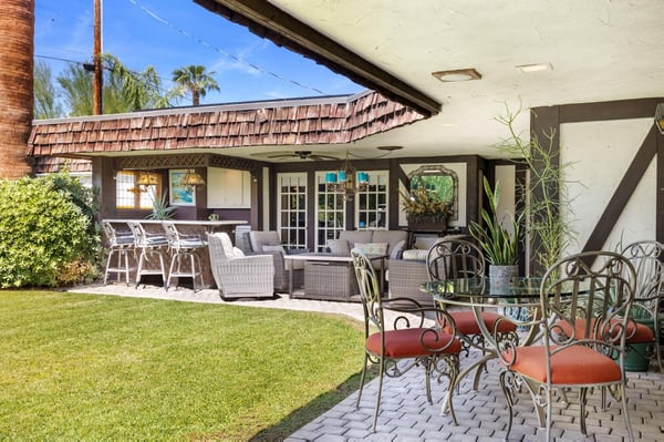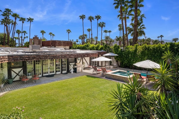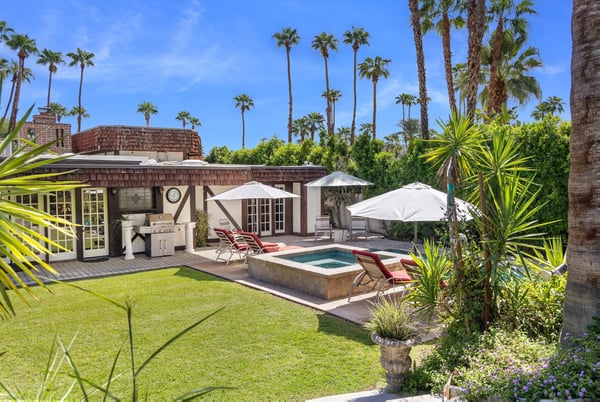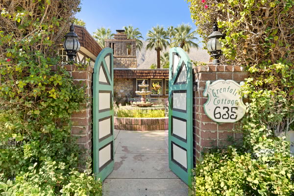 This sprawling Tudor-style home, a rarity for Palm Springs, sits on manicured grounds with an English rose garden, stone fountains and Renaissance-style sculptures. A ficus privacy wall surrounds the estate, with views of soaring palm trees and the San Jacinto mountains a reminder of the home’s desert destination. Located just outside downtown Palm Springs, the cottage lies just 3 minutes from restaurants, parks, museums, and the Mesquite Golf & Country Club. Enjoy mornings on the front porch over coffee at a high-top cafe table and afternoons lazing by the pool on one of four chaise loungers. When you aren’t enjoying the local cuisine, fire up the grill in the outdoor kitchen for al fresco meals or have a martini at the eat-in bar. A cozy fire pit on the covered patio invites relaxed evenings under the stars. Inside, find rich hardwood furniture, high-backed armchairs and stained glass windows in classic Tudor renaissance-style decor. A stacked-stone fireplace, accented by a ram’s head mount, creates a lodge-style atmosphere. In the living room, leather sofas frame a large-screen TV with Roku, while a wall of French doors opens this room to the backyard. Steps away, a 10-seat Arthurian dining table allows for sit-down dinners prepared in the country-style kitchen. An eat-in breakfast table adds room for six. The home also boasts a game room with floor-to-ceiling Tudor-style windows, high-backed spectator chairs around a billiard table, and a private entrance to the garden. Across the hall is a stately office with an ornate desk and wall of bookshelves. Four spacious bedrooms, each with a king or queen bed, accommodate up to 8 guests. This home has rich hardwood furniture, a flat screen TV, and the en-suite bathroom has a step-in shower. Each of the home’s six bathrooms is updated with marble showers and countertops. A private washer and dryer add convenience. Take advantage of four driveway parking spots to explore nearby restaurants, galleries, hiking trails and more. Permit #2290