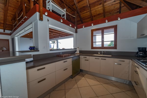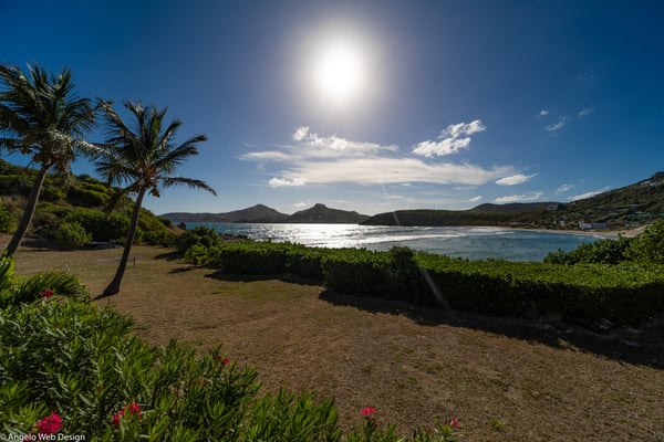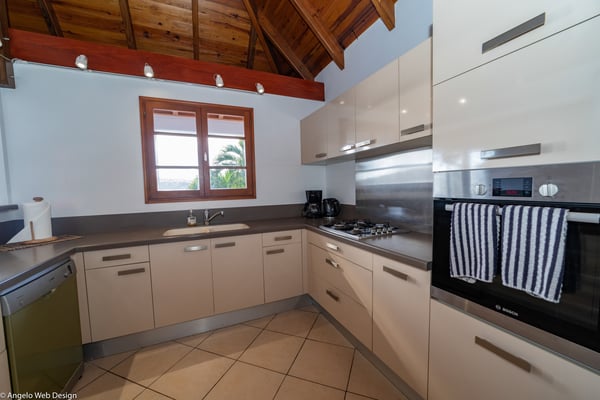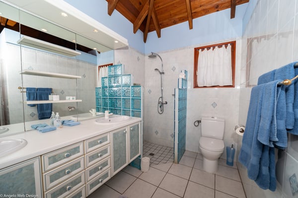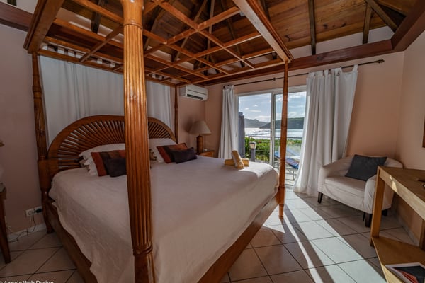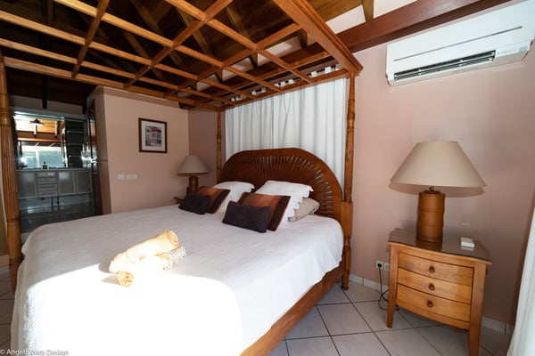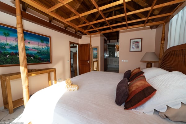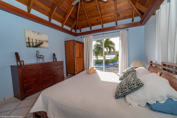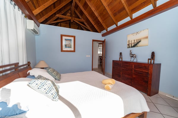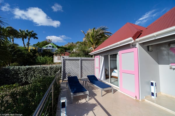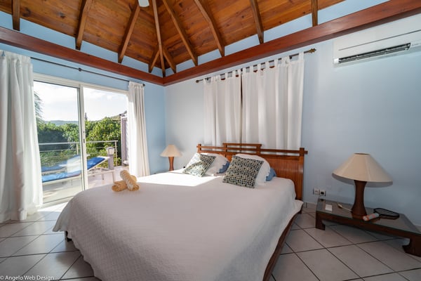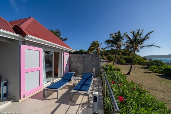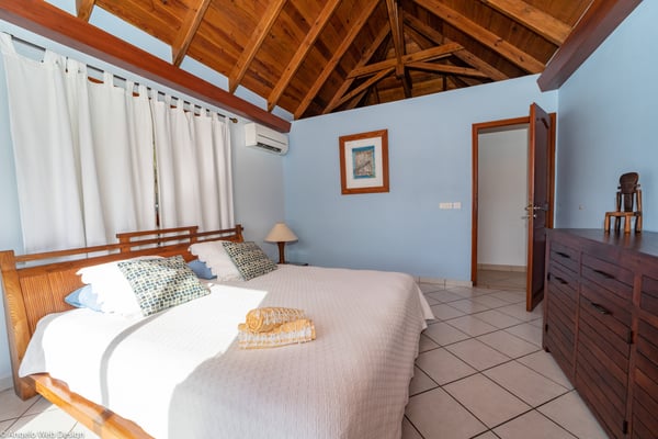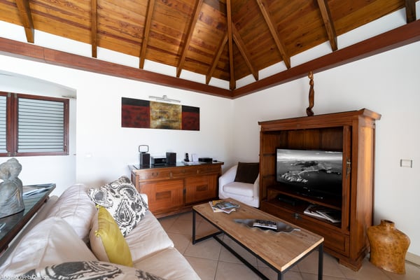 Located on Anse des Cayes overlooking the hills and the Caribbean Sea, Rosebud is a charming vacation rental nestled in the heart of lush vegetation. Well equipped with the best amenities and very functional, this three bedroom house is the perfect place for a getaway with family or friends in St Barths. Quiet and peaceful, the luxurious Rosebud is located in a green lush environment in the rolling hills of St Barths. Close to Anse des Cayes, it opens onto a beautiful view over the sparkling waters framed by palm trees and local shrubs. The open-plan living room is decorated with warm tones of weathered wood on the vaulted ceiling. The living room area is furnished with a sofa and an armchair as well as an HDTV perfect for pleasant movie nights. A large bay window opens onto the terrace which lets the gentle ocean blow in a soothing atmosphere. The kitchen is spacious and very well equipped to prepare delicious meals and cocktails to be sipped around the open bar on the terrace, while time seems suspended. At the front, the terrace offers a covered area with a lovely dining room which can accommodate up to six guests for alfresco dinners, next to the comfortable outdoor sofa covered with nice cushions. A lovely deep blue swimming pool is surrounded by two lounge chairs perfect to enjoy the island sun, read or chat. In a setting of palm trees with chiseled foliage, the place is ideal to enjoy the splendid view over the tropical vegetation and the waters of St Barths sparkling under the sun. Rosebud welcomes you in two pretty air-conditioned bedrooms equipped with utmost comfort. Both are furnished with king beds, and each has its own private bathroom as well as an access to a terrace with a view. Light fixtures, curtains, decorative objects, soft cushions: the night space is comfortable and refined, perfect after days of exploring the island or relaxing on the nearby lovely beach. In a warm atmosphere, villa Rosebud welcomes you with family, friends or for a romantic stay in St Barths.