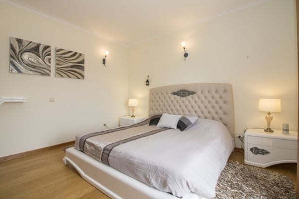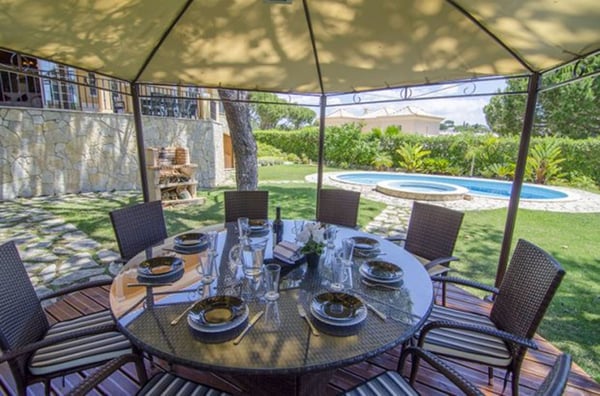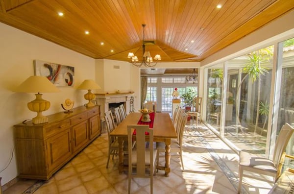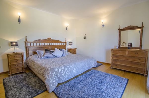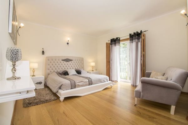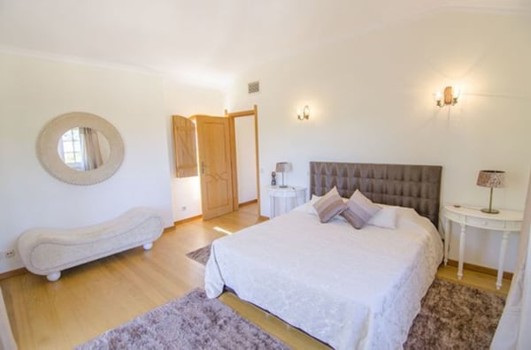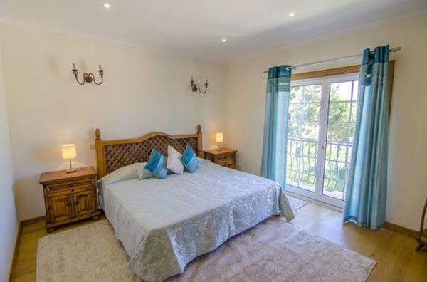 The living room has huge windows to the garden, a wooden ceiling, chandeliers and comfy sofas. The dining room is also flooded with light from the large windows and has an extendable dining table for 12 people. It overlooks a unique, interior garden full of tropical plants which creates the centrepiece to this property. The kitchen is fully equipped with modern appliances, a central island and a good sized pantry. On the lower level of the house, there is a spacious games room with a central fireplace, several sofas and armchairs, table tennis and pool table for the young ones, or young at heart! There is also a sauna and a Jacuzzi (photos available soon) Outside is wonderful with plenty of outside furniture for alfresco dining or relaxing in the sunshine. The Mediterranean garden is bursting with a variety of plants and native trees that provide some welcome shade on hot, summer days. There is also a pretty pergola on a wooden deck with dining furniture for ten people and a charcoal barbecue under the canopy of trees. Guests are entitled to use the shared pool in the Encosta do Lago condominium as well as other facilities such as the gym and the tennis court. Access is granted via cards provided and this is included in the villa rental. Air conditioning in all bedrooms except the twin on the lower level.