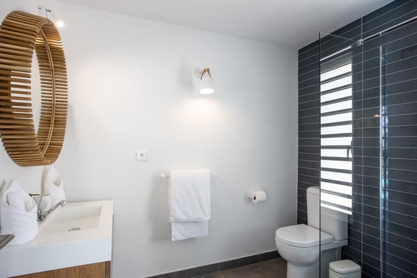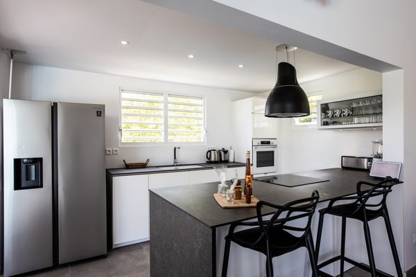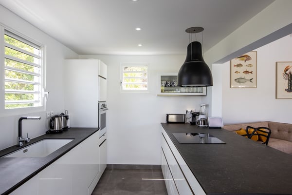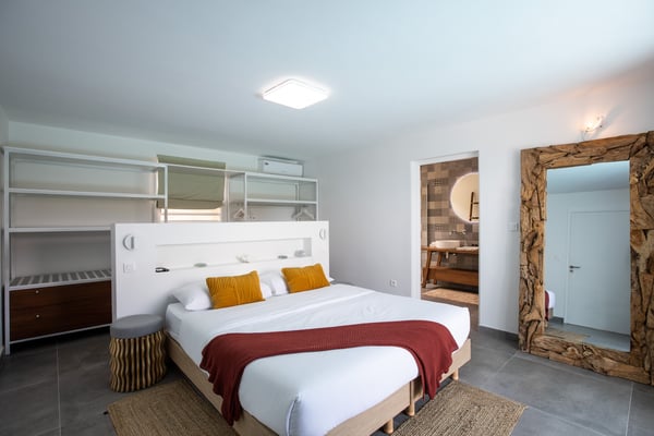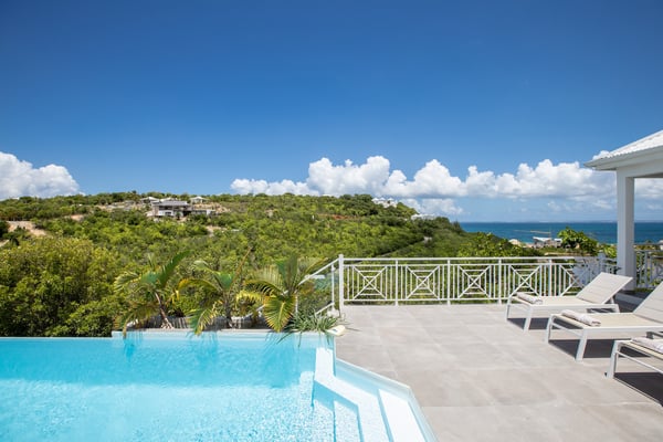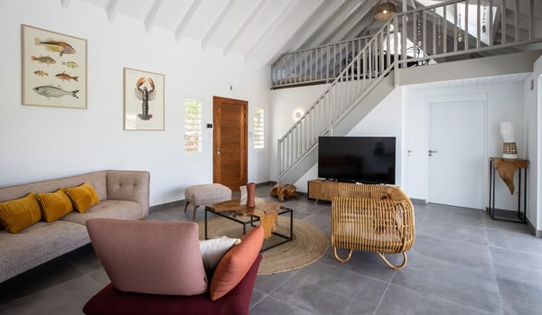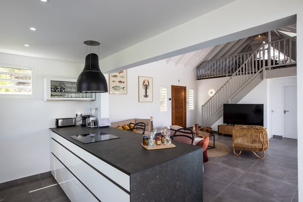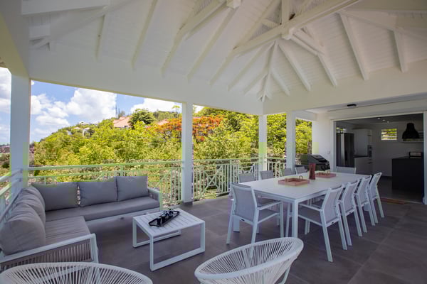 Villa Angelsmart in Saint Martin located in Mont Rouge, offers a panoramic view. This stunning villa features 4 bedrooms, each with its ensuite bathroom. Three of the bedrooms are situated on the upper level, providing privacy and comfort. The fourth bedroom is located on the lower level, along with a gym where you can stay active during your stay. The villa boasts a fully equipped kitchen, allowing you to prepare delicious meals at your convenience. There are two dining areas, providing flexibility for enjoying your meals. One is situated upstairs, while the other is located outdoors and includes a barbecue area, perfect for al fresco dining and enjoying the beautiful surroundings. Villa Angelsmart also offers a comfortable outdoor seating area where you can relax and take in the breathtaking view of Red Bay beach. The villa has been tastefully renovated in a contemporary style, combining elegance and modernity for a luxurious experience. Whether you're planning a family vacation or a trip with friends, Villa Angelsmart is the perfect destination. It can be rented in two, three, or four bedrooms, accommodating groups of various sizes and ensuring a comfortable and memorable stay.