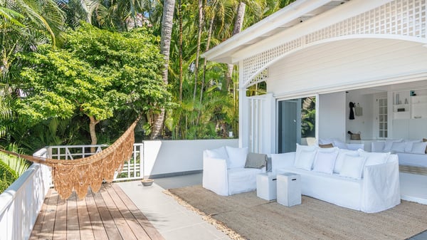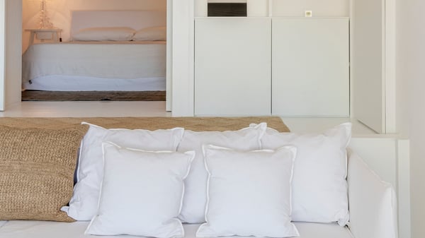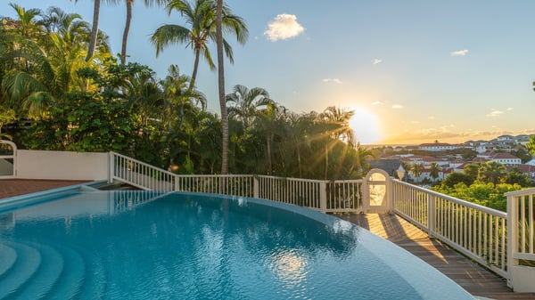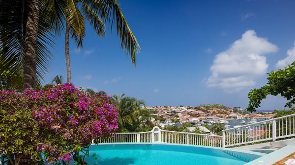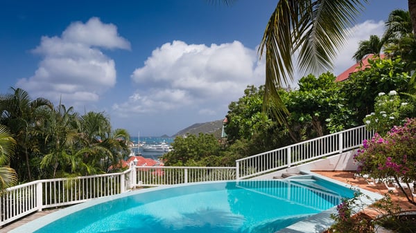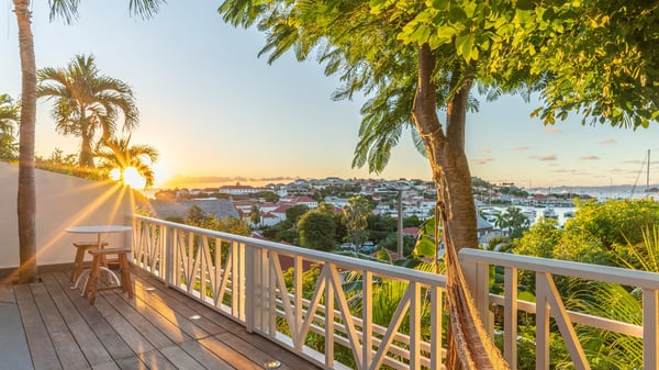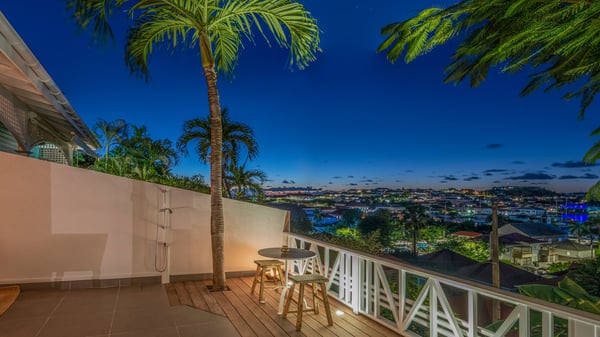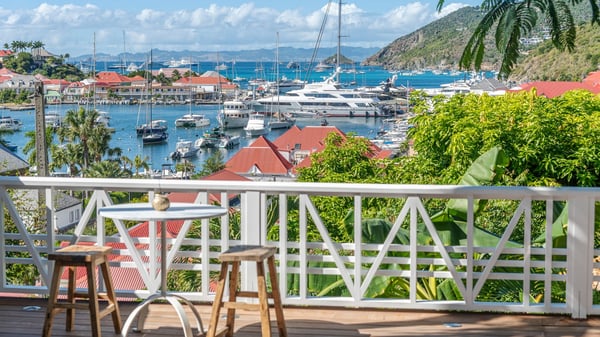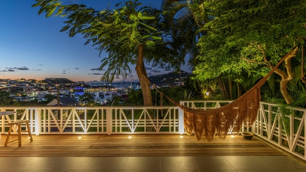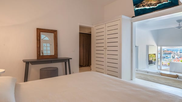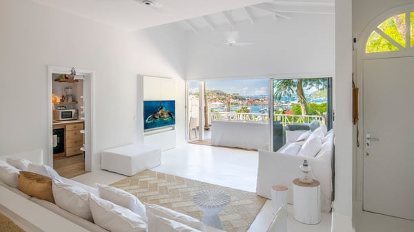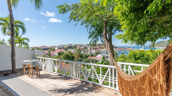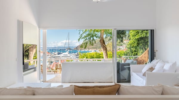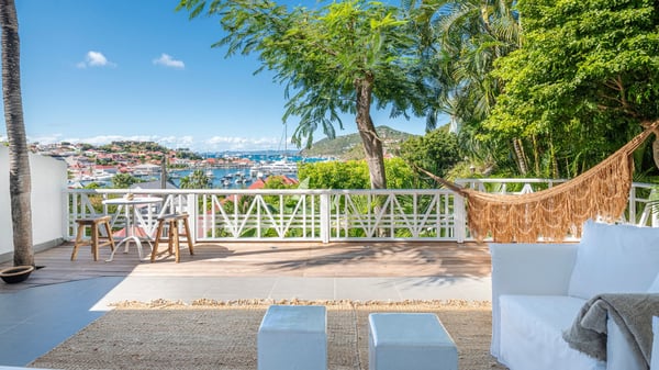 Located in Gustavia in front of the harbour and its sparkling lights, the vacation rental apartment Biba welcomes guests in utmost luxury in a refined decor. Its spectacular views over the harbour, the yachts and the glowing lights of the sunsets in the evening make it a unique place to relax. Ideally located in the heart of Gustavia in the Residence Colony Club with a swimming pool, the vacation rental BIBA is the perfect spot for a delightful getaway for two in the Caribbean. In a fine and bright atmosphere, Biba’s air-conditioned, strikingly white living room is most relaxing in front of the stunning harbour view. There are sofas covered with cushions in the lounge, as well as an HD TV perfect for pleasant movie nights. The wooden kitchen is located close to the living room and offers all appliances to cook meals and prepare cocktails to be sipped while watching the glorious sunsets. The atmosphere is soothing and peaceful, an ideal place in the heart of the island of St Barths. Apartment Biba is located on the same level as the Colony Club residence's common swimming pool, which makes it possible for guests to enjoy it and sunbathe at any time. Biba's private terrace is furnished with a dining area that can accommodate four guests under the covered area, as well as a breakfast bar overlooking the indoor kitchen. A second lounge with sofas is also available near the hammock, perfect for reading and chatting in the mild island air. A small table with two stools is also set up on the edge of the terrace, the perfect place to enjoy a morning coffee or a cocktail while admiring the view over the harbour. Comfy and spacious, Biba’s terrace is a true haven of peace in the heart of Gustavia. The vacation rental Biba consists of a pretty bedroom with an adjoining bathroom. Located a few steps below the living room, it is furnished with a king-size bed and features a dressing area perfect for a comfortable stay. Only steps away from shops, bars and restaurants, the vacation rental Biba in St Barths is the perfect place for a romantic stay for two.