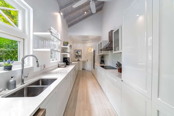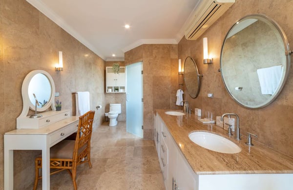 Royal Westmoreland is one of the Caribbean's finest luxury golf communities. With the Social Membership included in this villa, guests will have access to the gym ($), golf course ($), tennis courts ($), Club House ($), beach facilities at Mullins Beach Club ($), resort communal pool ($). Lime Tree House (Coconut Grove 5) is situated in one of the most prestigious golfing communities - Royal Westmoreland, Barbados. A sparkling pool beckons, professional staff are on hand, and everything you need is at your fingertips. In its entirety, the villa has three bedrooms, three bathrooms and one powder room. Upon arrival at this gorgeous vacation villa, lush greenery and palm trees enhance the feel of your Caribbean holiday. There is parking available for three vehicles and adequate security lighting outdoors. The ground level comprises a powder room, one bedroom, a kitchen and living areas. The bedroom on this level is perfect for anyone with mobility challenges. Roomy, airy and bright, the bedroom is air-conditioned, has ample storage and easy access to the main living areas. We love the home-away-from-home touches of the villa. Avid readers can choose from a selection of books to enjoy at the large writing desk or on the pool deck. Remote work or staying in touch is easy with super fast WIFI. A flat-screen tv is perfect for movie nights with calming views of the pool. An eight-seater dining room table has views of the pool as well. Fire up the grill (BBQ) yourself, or the team at Blue Sky Luxury can arrange a chef or cook to whip up delicious fare. Poolside or indoor dining? You decide. On the upper level, two expansive bedrooms command impressive spaces. Both are private and have unique features. The light and bright decor theme has been continued in both rooms. Bedroom two has an en suite bathroom with a unique open-air design. A rain shower, privacy glass and the views give the feel of showering in nature. Soothing golf and sea views greet the eye, and the warmth of the sunshine is uplifting. The main suite is a slice of luxury tucked away in air-conditioned bliss! An air-conditioned en suite bathroom features a Jacuzzi tub large enough for two. The shower is generously sized and holds a bench and two shower stations. Yes, two shower stations. There is also seating for makeup or personal grooming in air-conditioned comfort. Once you tear yourself away from the spa-level bathroom, slip onto the balcony for a relaxing coffee. This balcony overlooks the pool and bamboo-lined gardens. Poolside umbrellas, and a covered deck with lounge furniture complement a long lazy pool day.